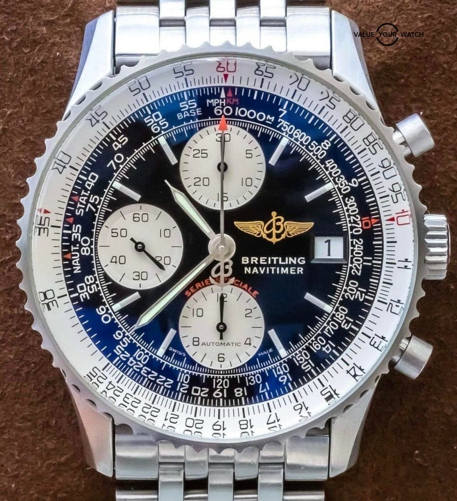 Ever since then, the Navitimier has become an extremely coveted model of Breitling. In the modern day, there are several different Navitimer models: Navitimer World, Navitimer 8, Navitimer 01, Navitimer B01, Navitimer Heritage, Navitimer Rattrapante, and the Navitimer GMT. These are obviously a lot of models, but when shopping for a Navitimer, just know the most popular models that will typically bring the highest premium are gonna be: World, Navitimer 01, Navitimer B01, and GMT. The reason for that is those models all contain a similar looking dial that tends to be the most popular. When it comes to the movements, the B01 is the most desirable followed by the 01. In terms of sizing, you really want to go the 43 or 46 millimeter if you’re looking for a timepiece that will hold its value.