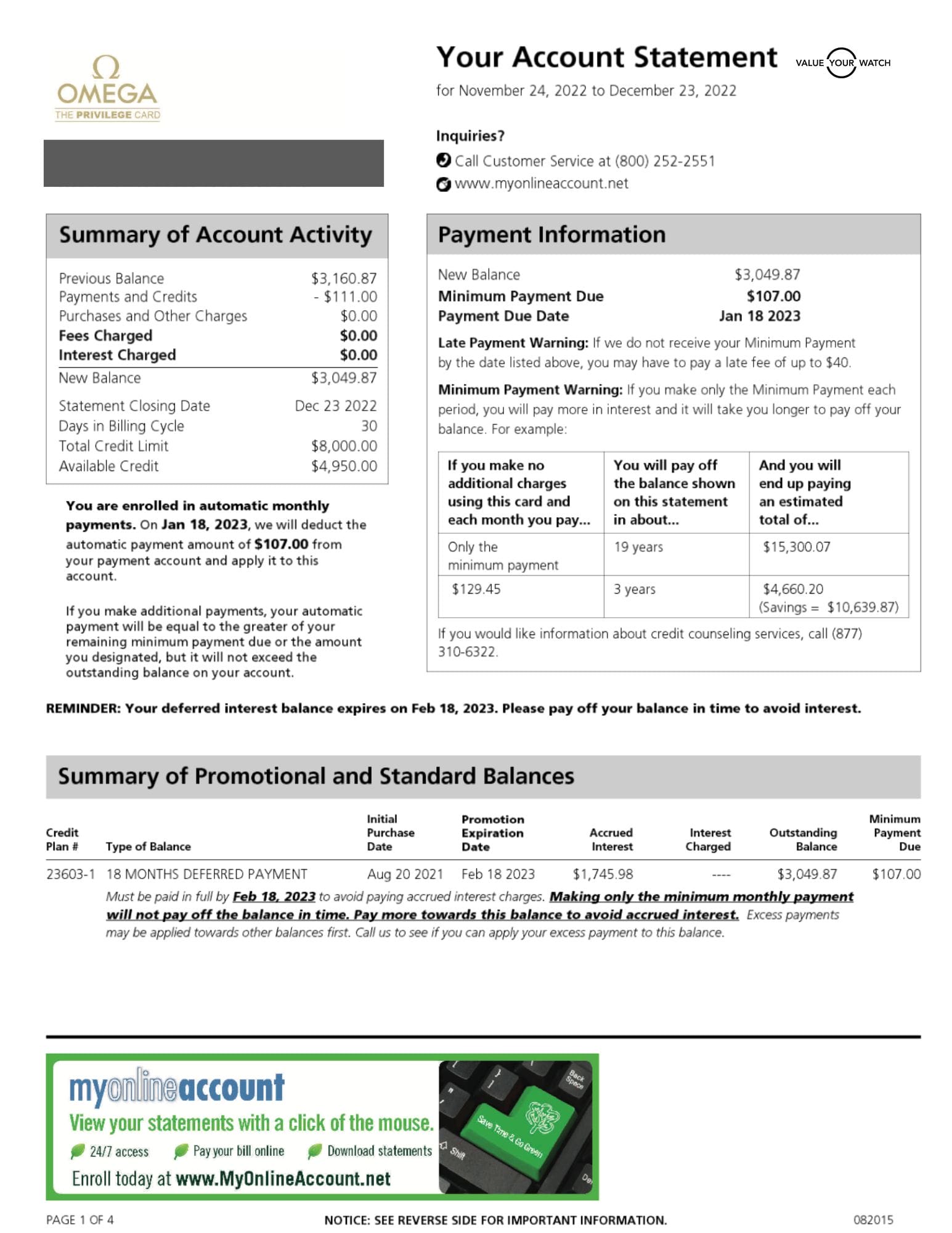 The OMEGA Privilege card is offered by TD Retail Card Services(TDRCS), a private-label credit card company by TDBank. You can view the company at https://www.myonlineaccount.net/ . These cards are store specific, so you won’t be able to use them to purchase other brands like Cartier. The advantage is the 18 months deferred interest. You only have to pay the minimum balance, however at the end of the 18 months, you will be liable for the deferred interest plus the balance.