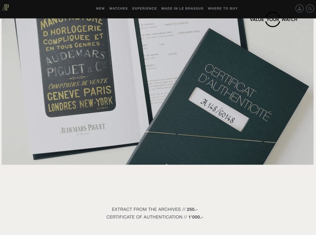 To obtain the Extract from Archives for Audemars Piquet, you can stop by the official AD store or contact the AP directly from their websites. The cost is 250 Swiss Francks however you have an option to get the Certificate of authentication for 1,000 Swiss Franks.