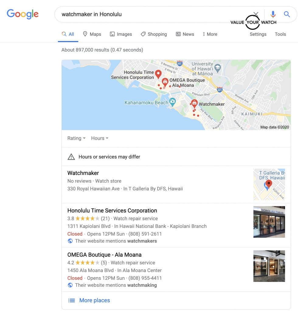 If you do not have any friends who collect watches or deal with watches, the best place is to start to look for a watchmaker is google search. Just search “watchmaker in (your town),” and you will be able to see some results.