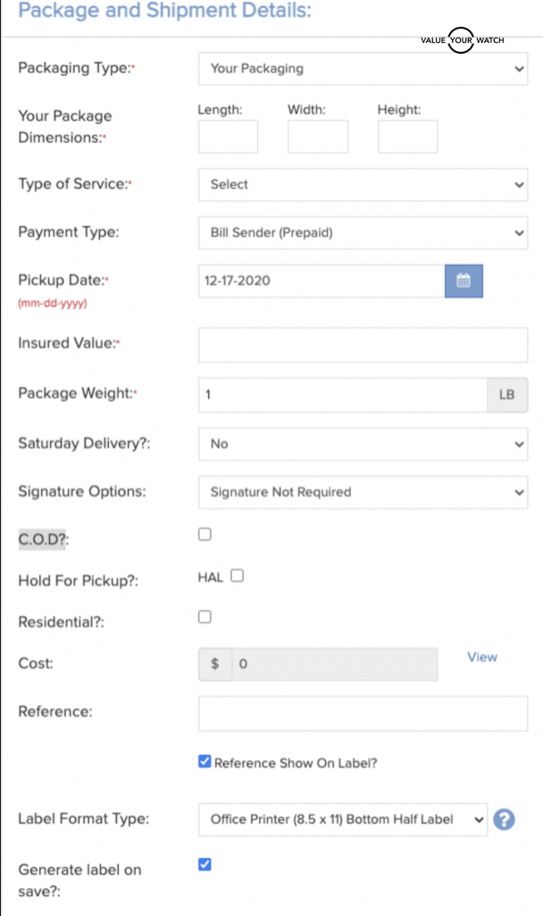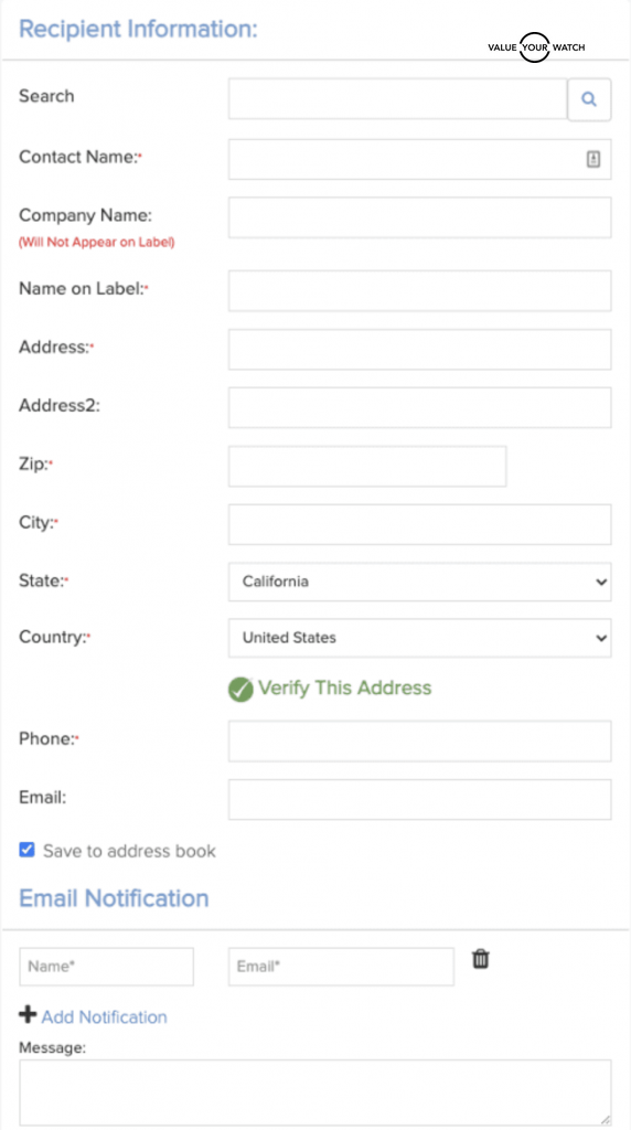The sender information is yours, or the person who is shipping the watch. Again, it is important to input correct information to help the shipping process be smooth.