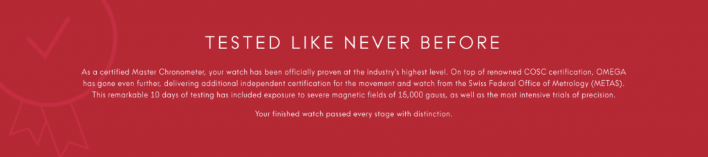 Twice as Precise as Any Officially Certified Chronometer: Omega watches are tested twice. They need to meet the chronometer requirements of Contrôle Officiel Suisse des Chronomètres, the Official Swiss Chronometer test with the precision criteria of -4/+6 seconds per day. Once this step is passed, it moves into the second set of certification testing. The Swiss Federal Institute of Metrology performs an extra eight tests on each timepiece. Once the accuracy is within 0/+5 seconds per day, Omega will apply the Master Chronometer seal to the movement.