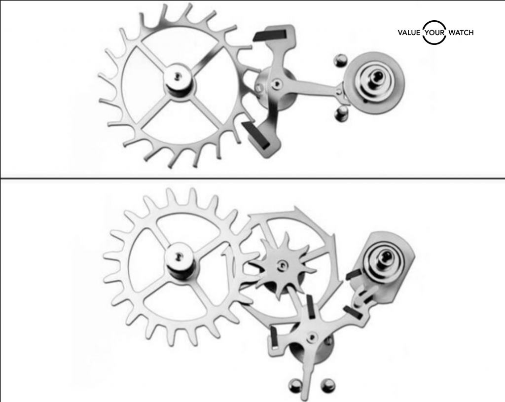 This picture shows the differences between a traditional escapement and Omega’s co-axial breakthrough. Omega’s movement is the bottom graphic.
