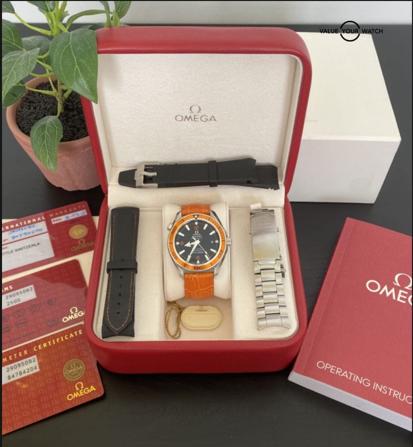 Today’s Planet Ocean was introduced in 2005 as a replacement to the Seamaster 300 which started production in 1960.The original line produced several case sizes to fit different wrist widths with popular sizes ranging from 42, 43.5, and 45.5 millimetres. Many of the Planet Oceans feature orange bezels or touches of orange on the bezel, dial, and hands. In fact, you can almost guarantee that if it is an Omega, and you glimpse orange highlights on the watch, it is a Planet Ocean.