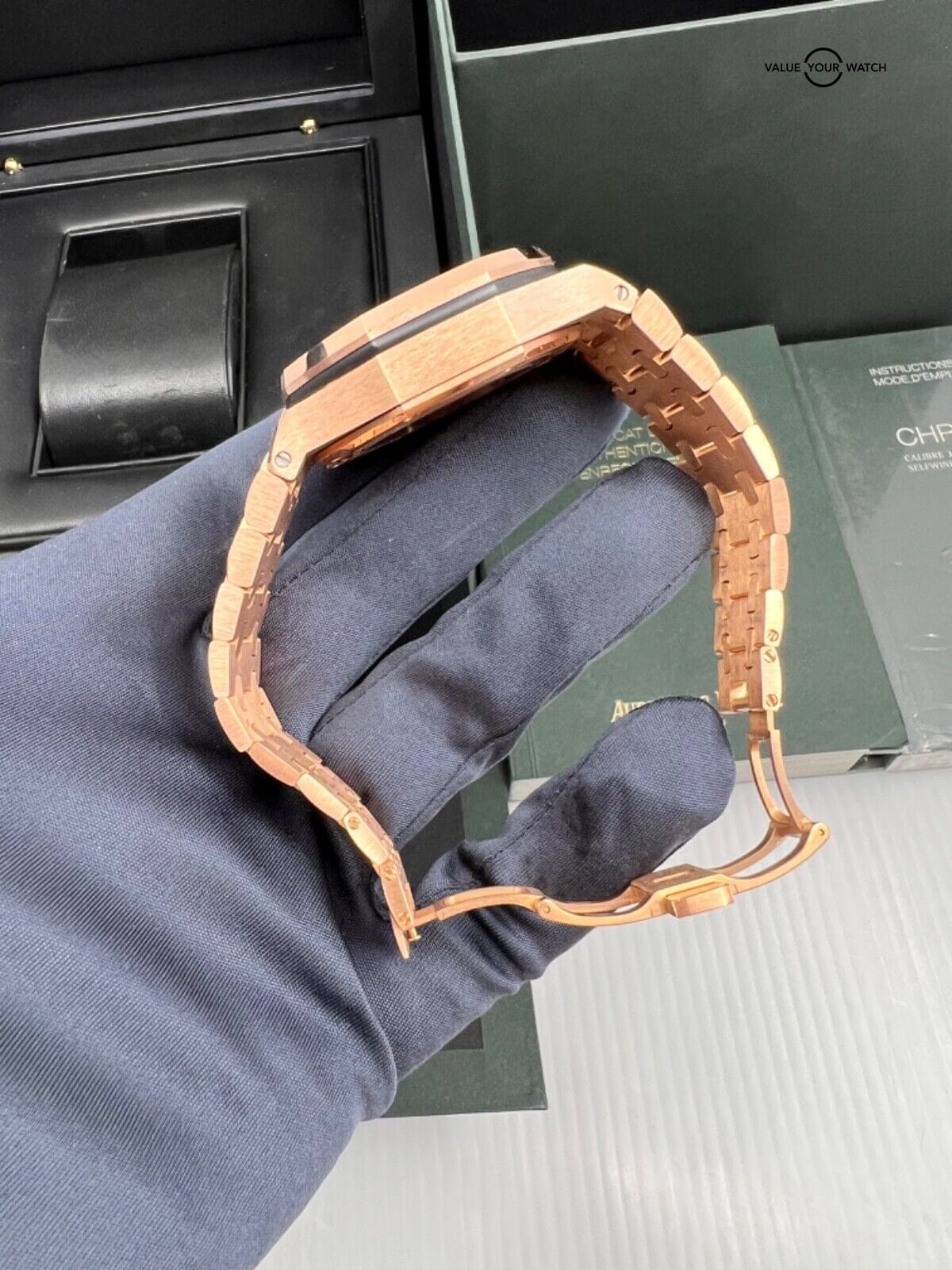 Crafted from 18-karat rose gold, the 42mm case of this watch is not only visually stunning but also exceptionally durable. Its octagonal shape with visible screws is a nod to the Royal Oak’s iconic design, first introduced in 1972 by legendary watch designer Gerald Genta. The rose gold case exudes warmth and luxury, making it a statement piece for any occasion.