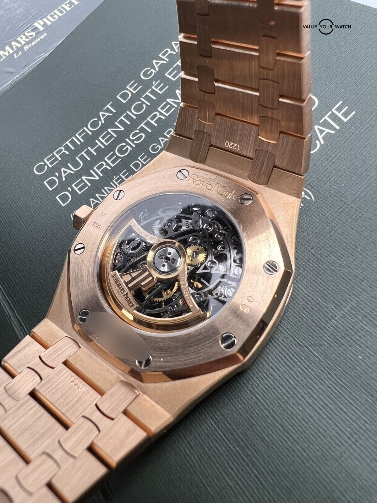 Specification: Audemars Piguet AP Skeleton Royal Oak Openworked 39mm Rose Gold Factory Bracelet