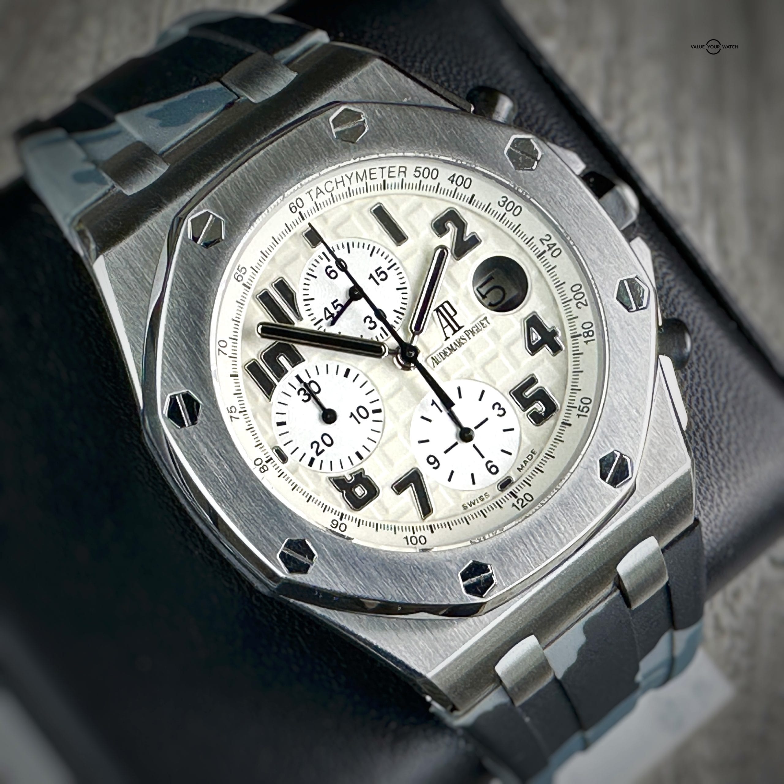 Up for sale: The Audemars Piguet Royal Oak Offshore Safari is a striking timepiece with a fantastic wrist presence. The ROO offers the timeless luxury AP is known for, yet offers masterful utility. The off white creme tapisserie dial and Arabic hour markers give this piece its sought after flare. One of the most loved Royal Oak models to date!