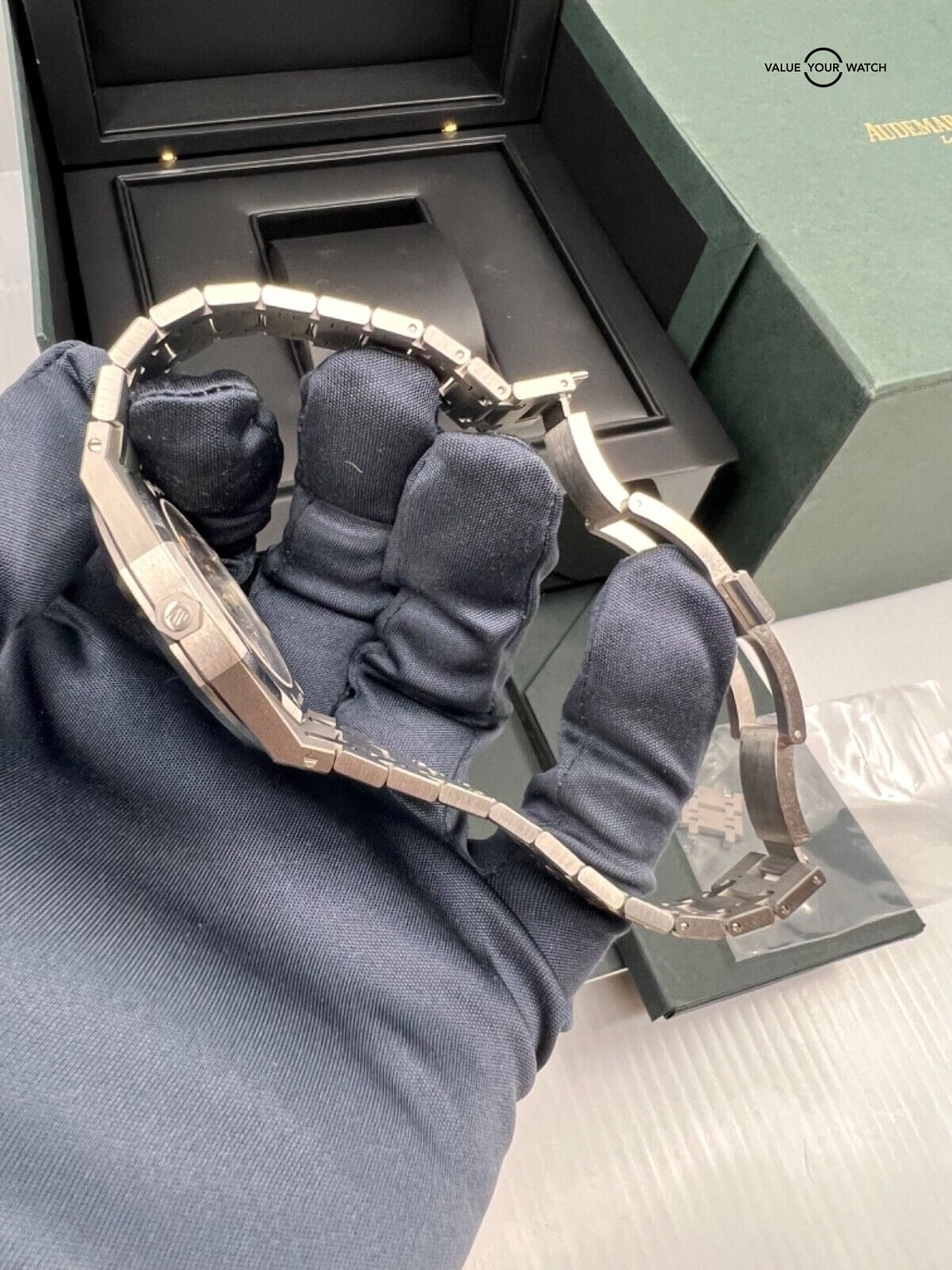 The 16202st features a 39mm stainless steel case with the signature octagonal bezel and eight hexagonal screws, a defining characteristic of the Royal Oak collection. Its striking blue dial showcases the renowned “Grande Tapisserie” pattern and elegant white gold hour markers and hands. The watch boasts a remarkable extra-thin profile, measuring just 8.1mm thick, making it exceptionally comfortable to wear.