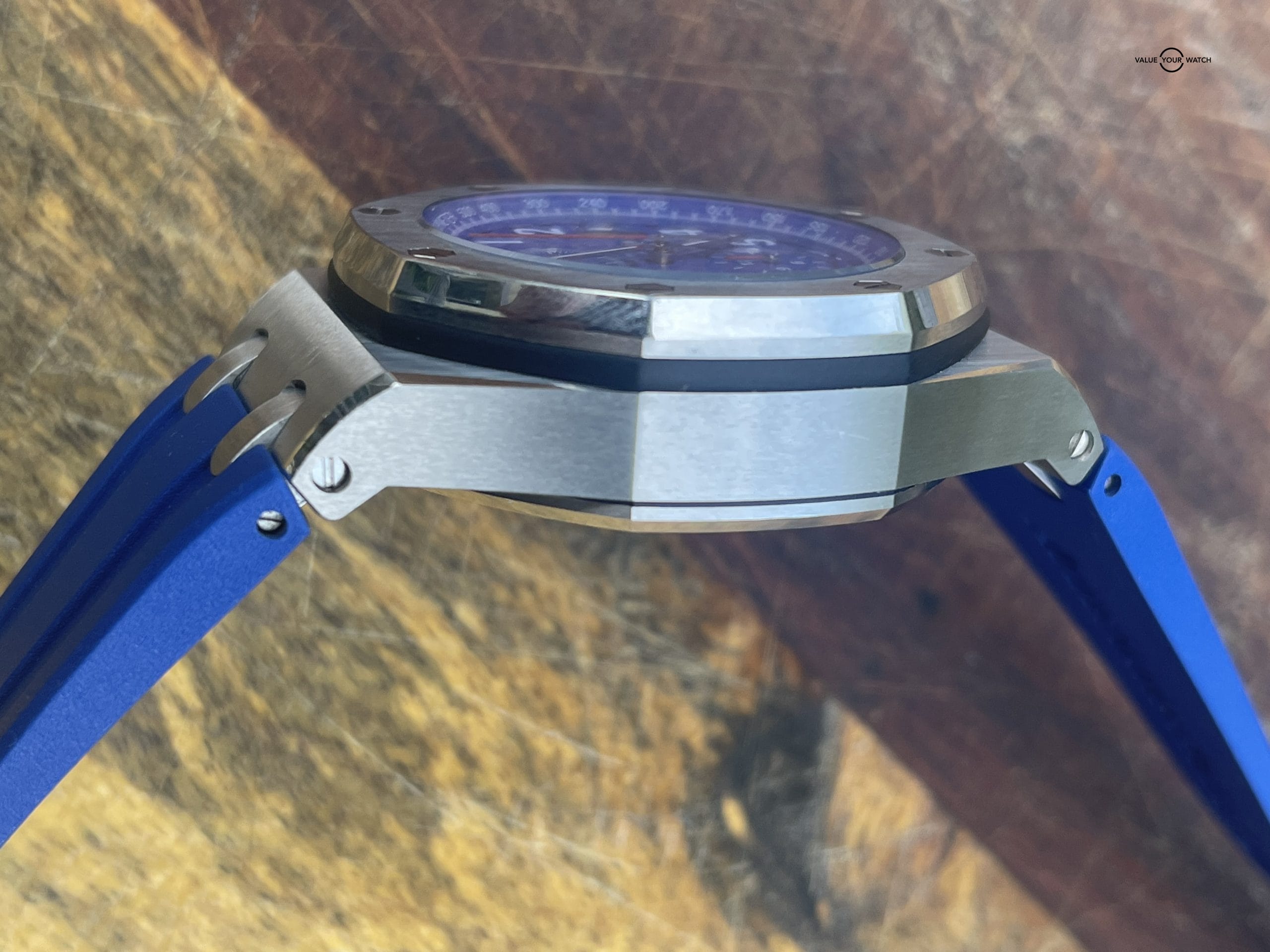 Blue dial with “Mega Trapisserie” platform, blue counters, Arabic Numerals with luminescent coating, white gold Royal Oak hands with Luminescent coating, Blue inner bezel.