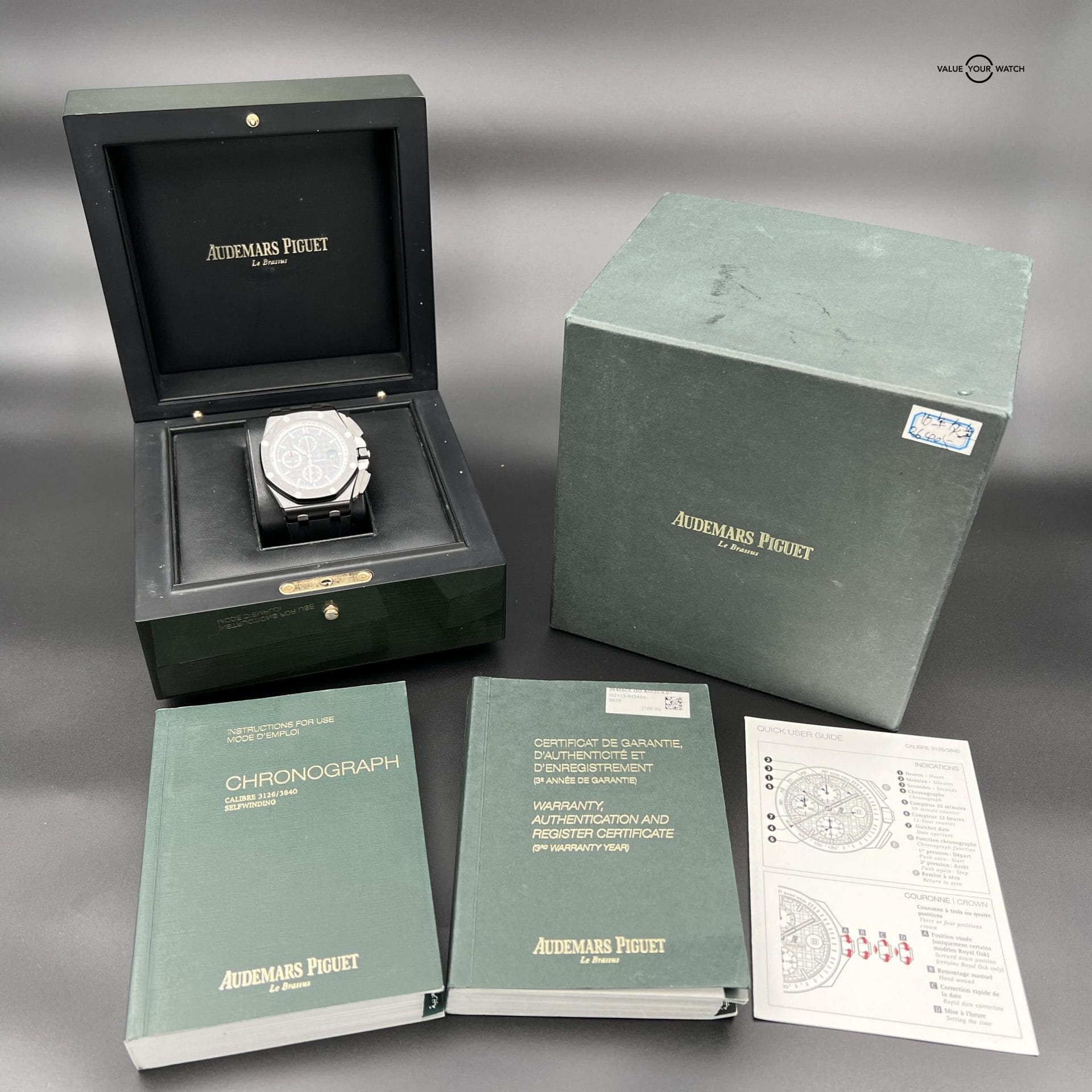 Truly mint condition complete set and tested on a timegrapher with just an amazing + 2 seconds per day error rate. This will not need a service for years. Perfect for the new or veteran AP collector in need of a larger case size at 44mm.