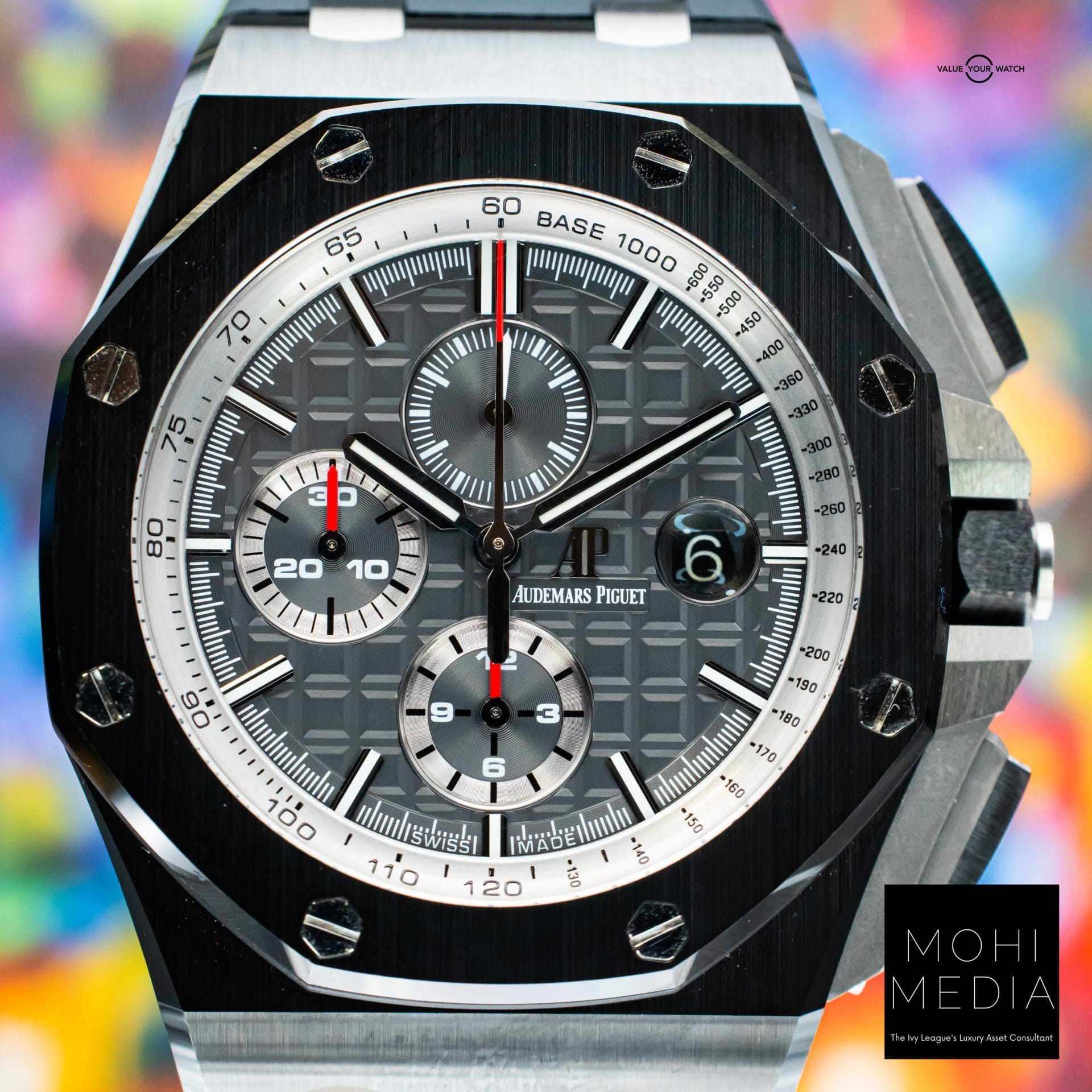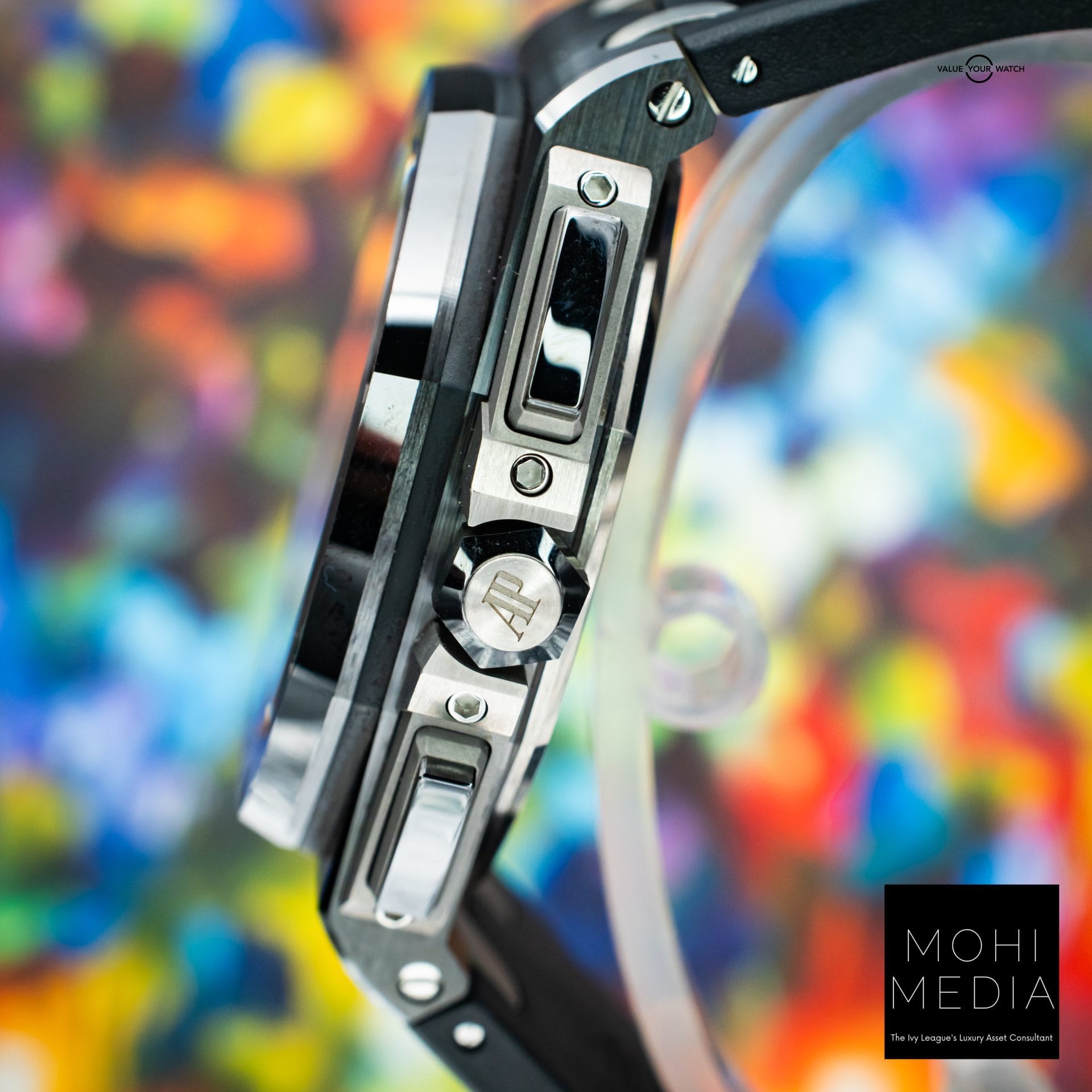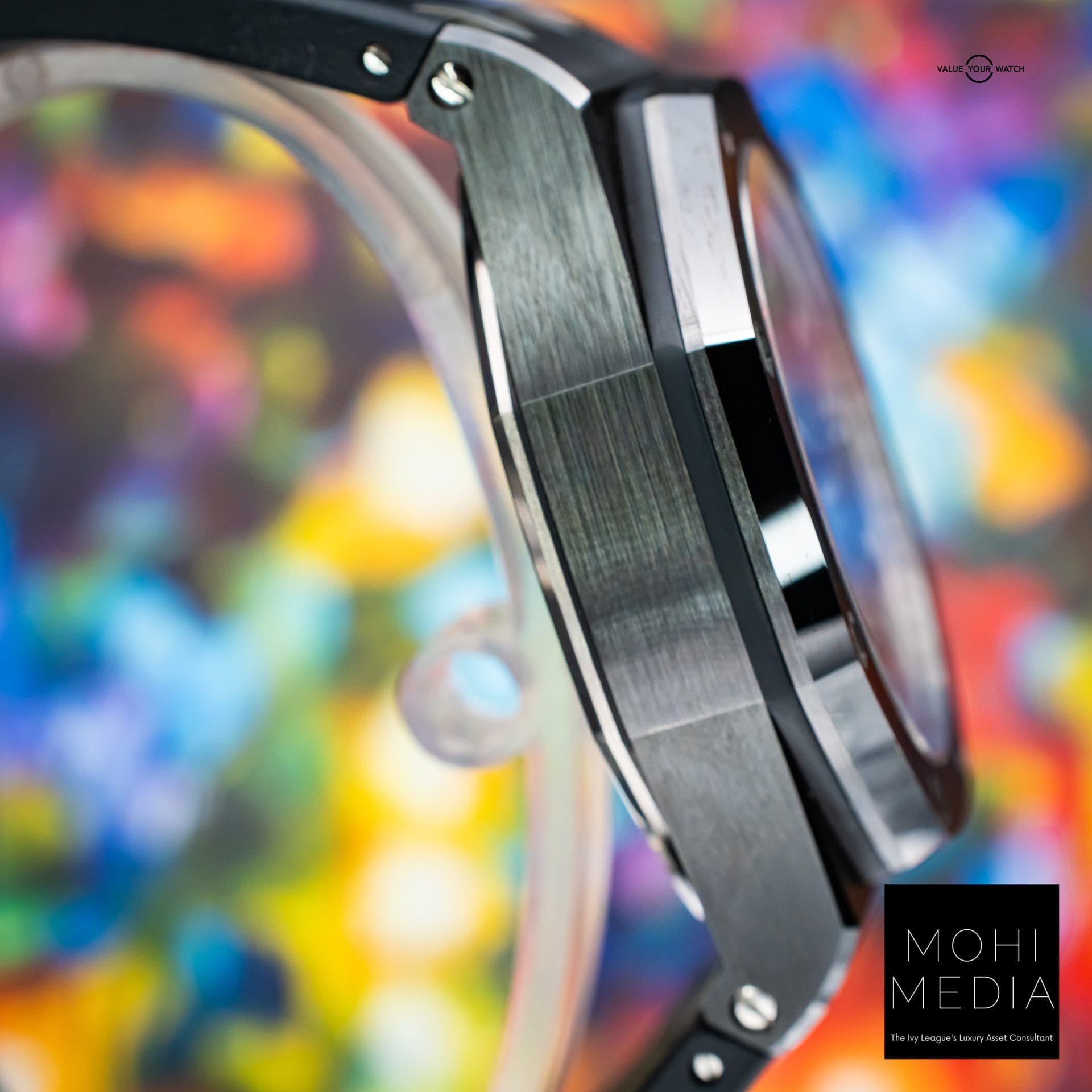 For sale is this unique Black Ceramic AP Royal Oak Offshore featuring an Anthracite Gray Dial. The original MSRP was $40,000 making this very appealing for collectors in today’s market–especially those with larger wrists as there are limited options in the AP brand that sit at a robust 44mm case size. This piece is equally perfect for new or veteran AP collectors. Guaranteed authentic.