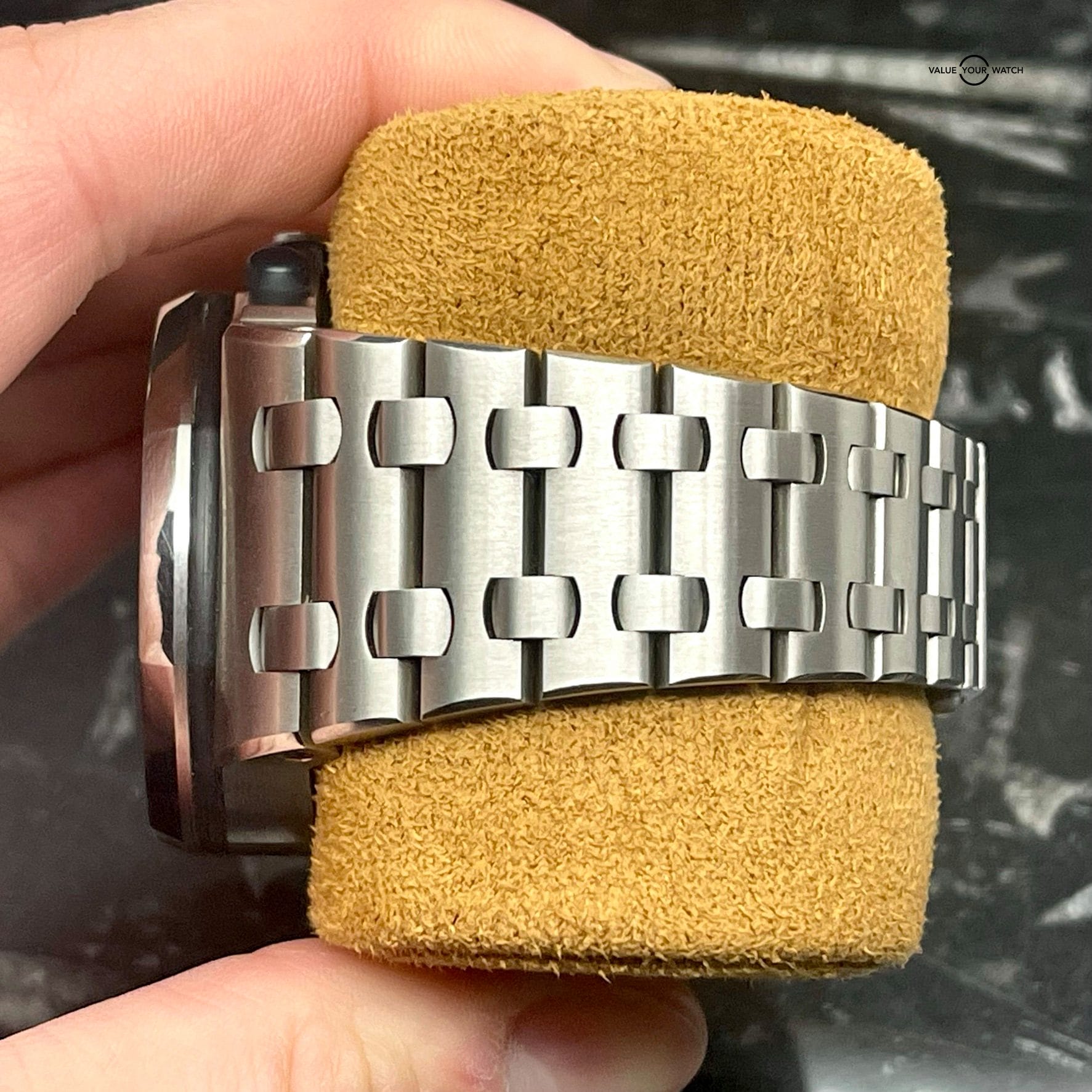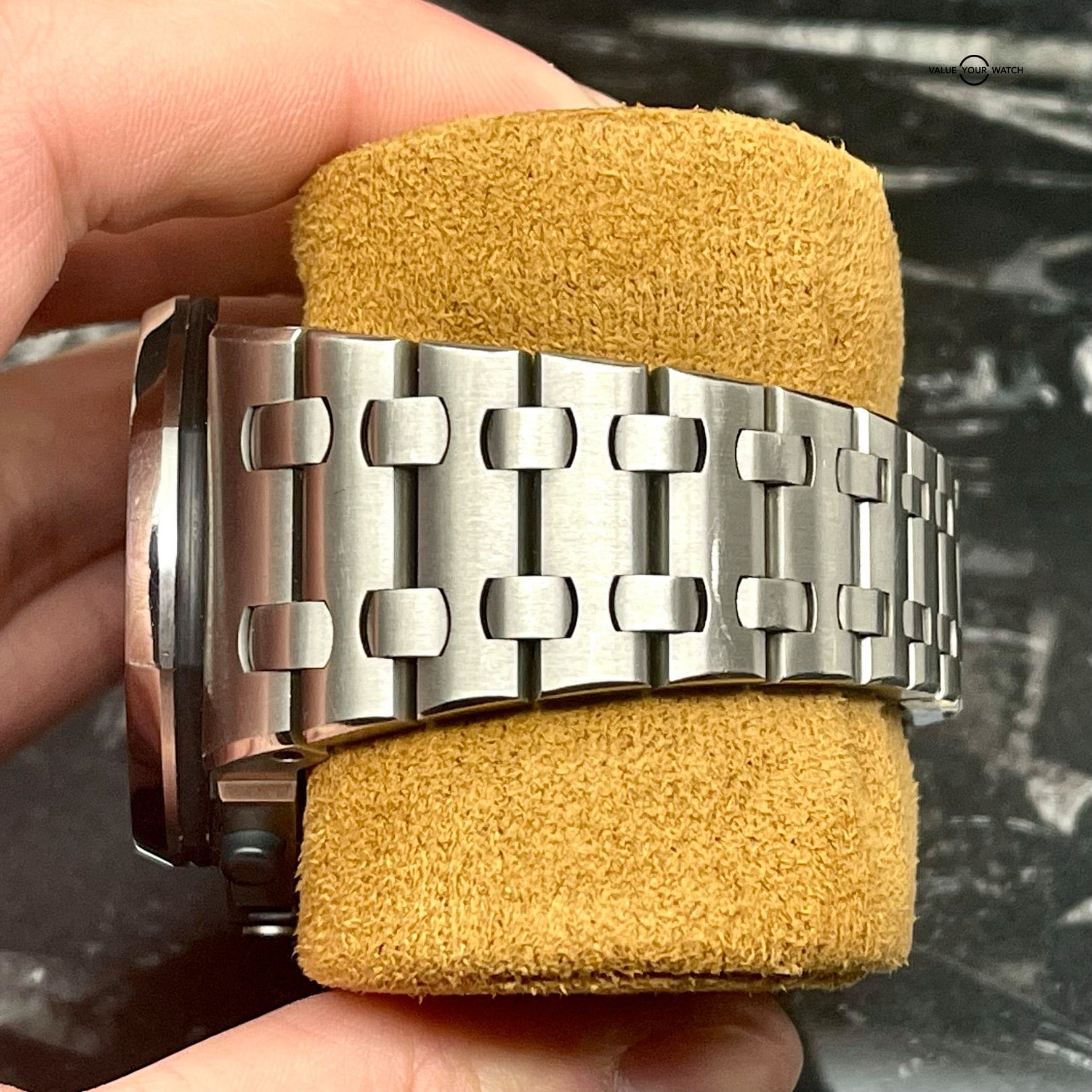Up for sale is my striking blue dial AP Offshore on bracelet. The bracelet really sets this watch apart ergonomically and aesthetically, as only about a quarter of Offshores leave the factory on one. It adds a robust profile and imposing stance on the wrist. Plus, the bracelet is finished to the same quality of the case, so when you get this watch on only a strap you’re shorting yourself the artistry that defines the watch. Although the bracelet is physically massive, the short and wide links give it a silky feel. Despite the substantial case, it is not excessive thick and should easily fit under a jacket cuff. Moving to the dial, the deep blue offset by white sundials looks fantastic in any light. As with other offshores, this piece has an internal magnifier for the date as to keep the lines of the crystal unmarred.