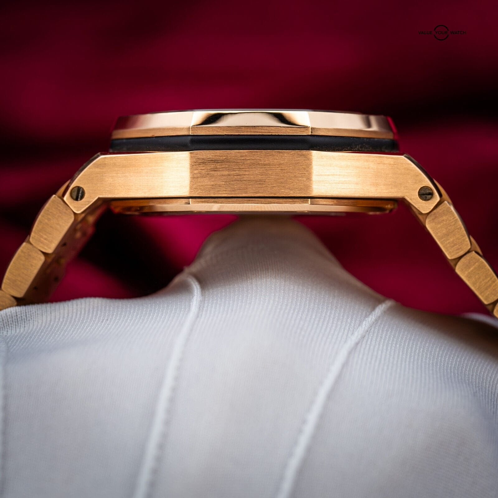 Weighing in at an astounding 335 grams, when you wear this undeniable statement piece, you are putting almost 12 ounces of solid rose gold on your arm. Wrist presence for this piece is absolutely off the charts. This won’t turn heads – it will break necks.