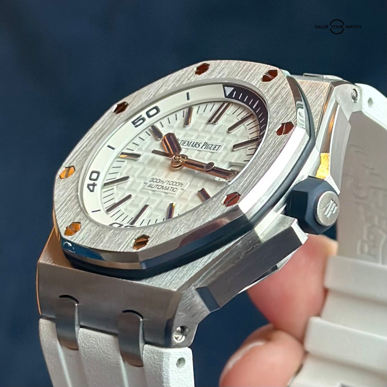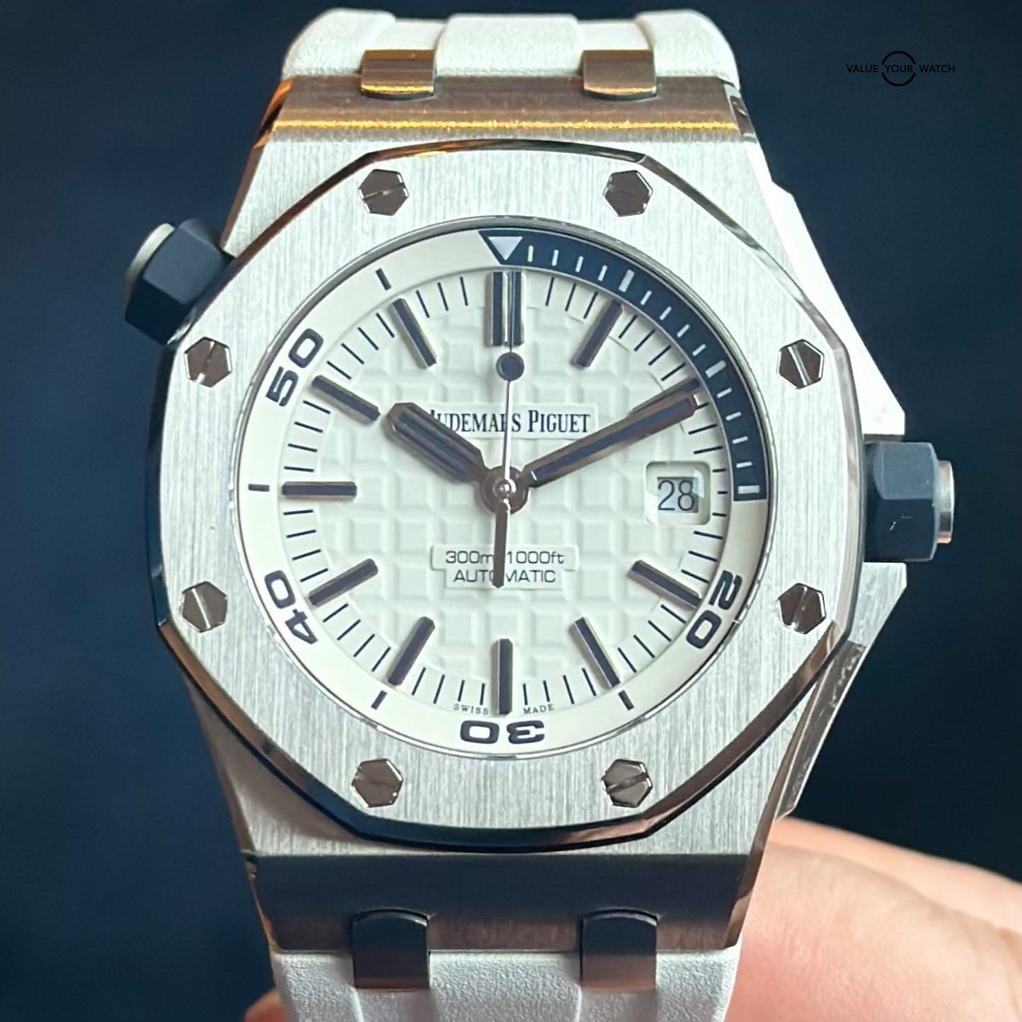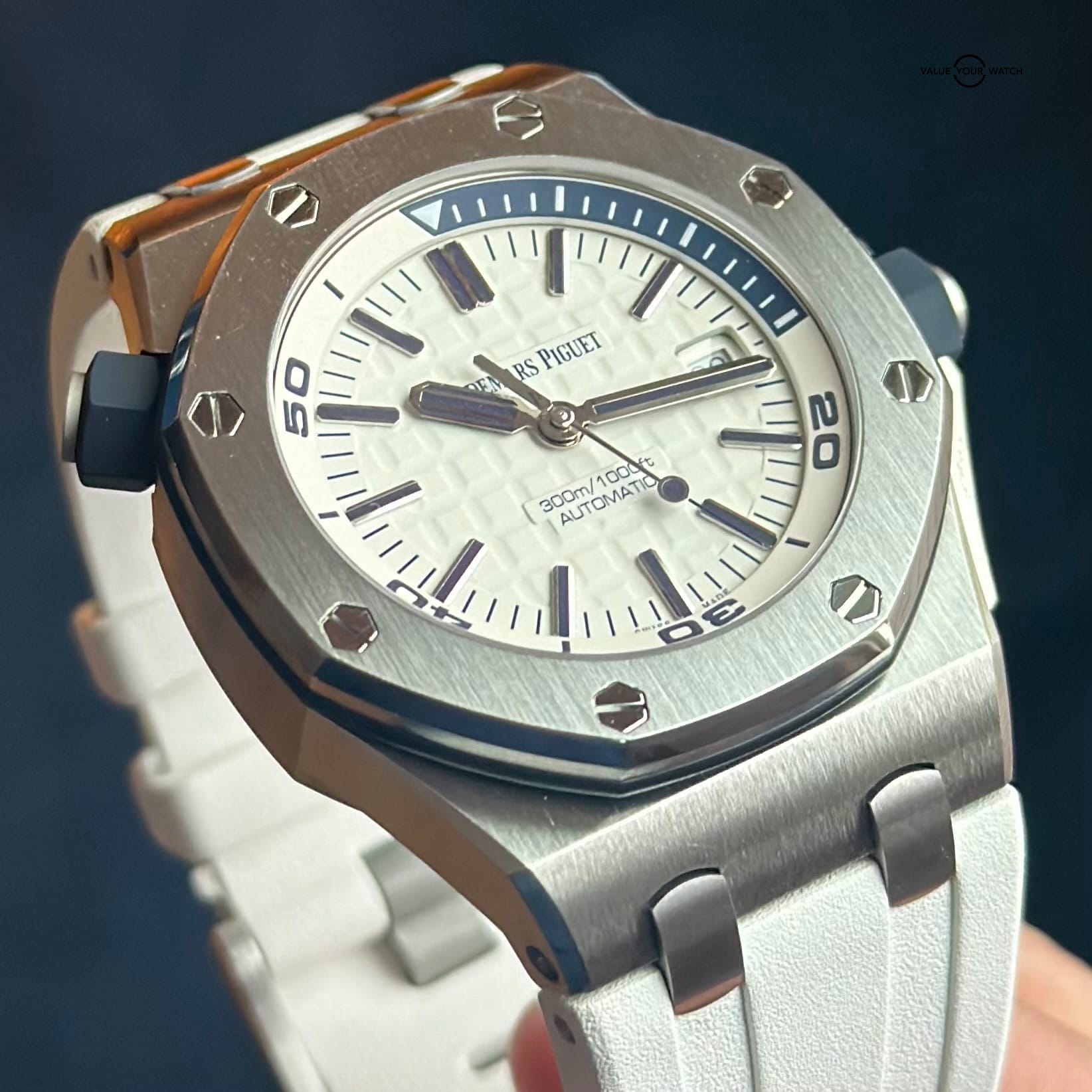 Elevate your style with this Audemars Piguet Royal Oak Offshore Diver wristwatch. This is their white and blue dial on a factory white strap making it complete eye candy.The watch features a 42mm silver stainless steel case with a screwed bezel and exhibition caseback that houses a 40 jewel mechanical automatic movement. The white dial with stick indexes and tapisserie dial pattern is protected by scratch-resistant sapphire crystal. This timepiece is water-resistant up to 300m with a white rubber two-piece strap and a date indicator. The watch is Swiss made and perfect for any occasion.