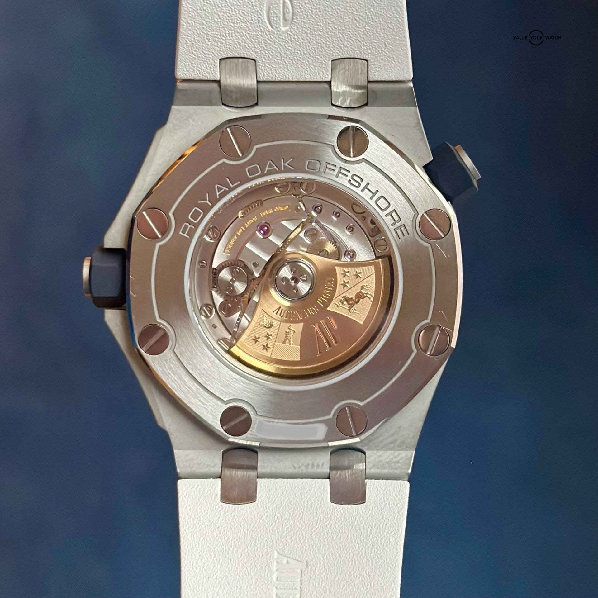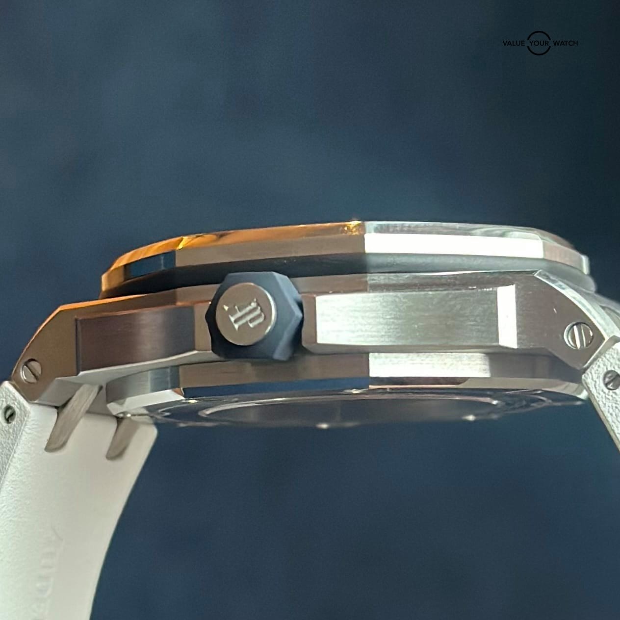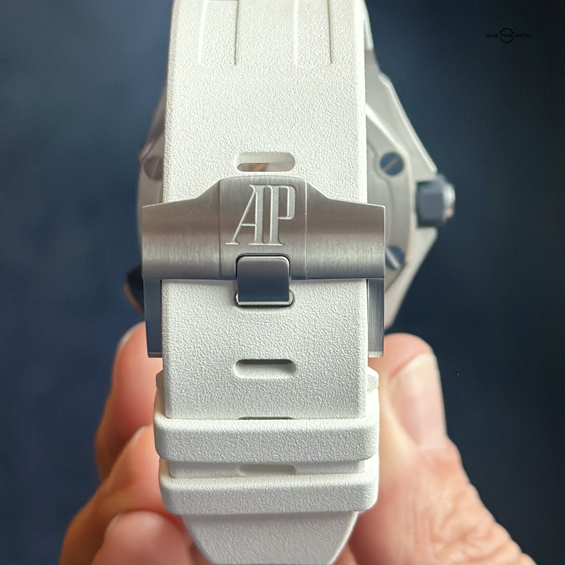Elevate your style with this Audemars Piguet Royal Oak Offshore Diver wristwatch. This is their white and blue dial on a factory white strap making it complete eye candy.The watch features a 42mm silver stainless steel case with a screwed bezel and exhibition caseback that houses a 40 jewel mechanical automatic movement. The white dial with stick indexes and tapisserie dial pattern is protected by scratch-resistant sapphire crystal. This timepiece is water-resistant up to 300m with a white rubber two-piece strap and a date indicator. The watch is Swiss made and perfect for any occasion.