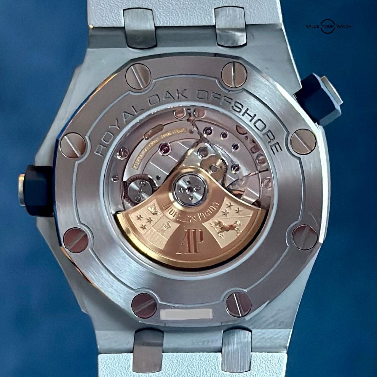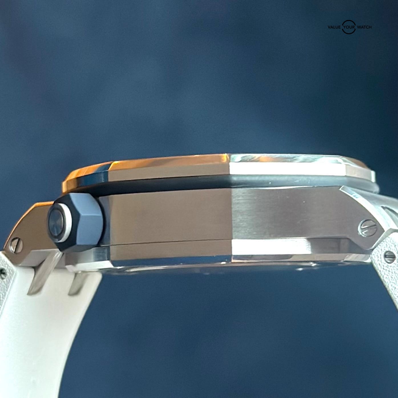 This time piece has AP service records from 2022 and was recently polished. It has not been worn since its polish so it will come to you in like new condition. This will come with inner/outer boxes, both manuals, hang tag, warranty card, and second factory blue strap to complete the set
