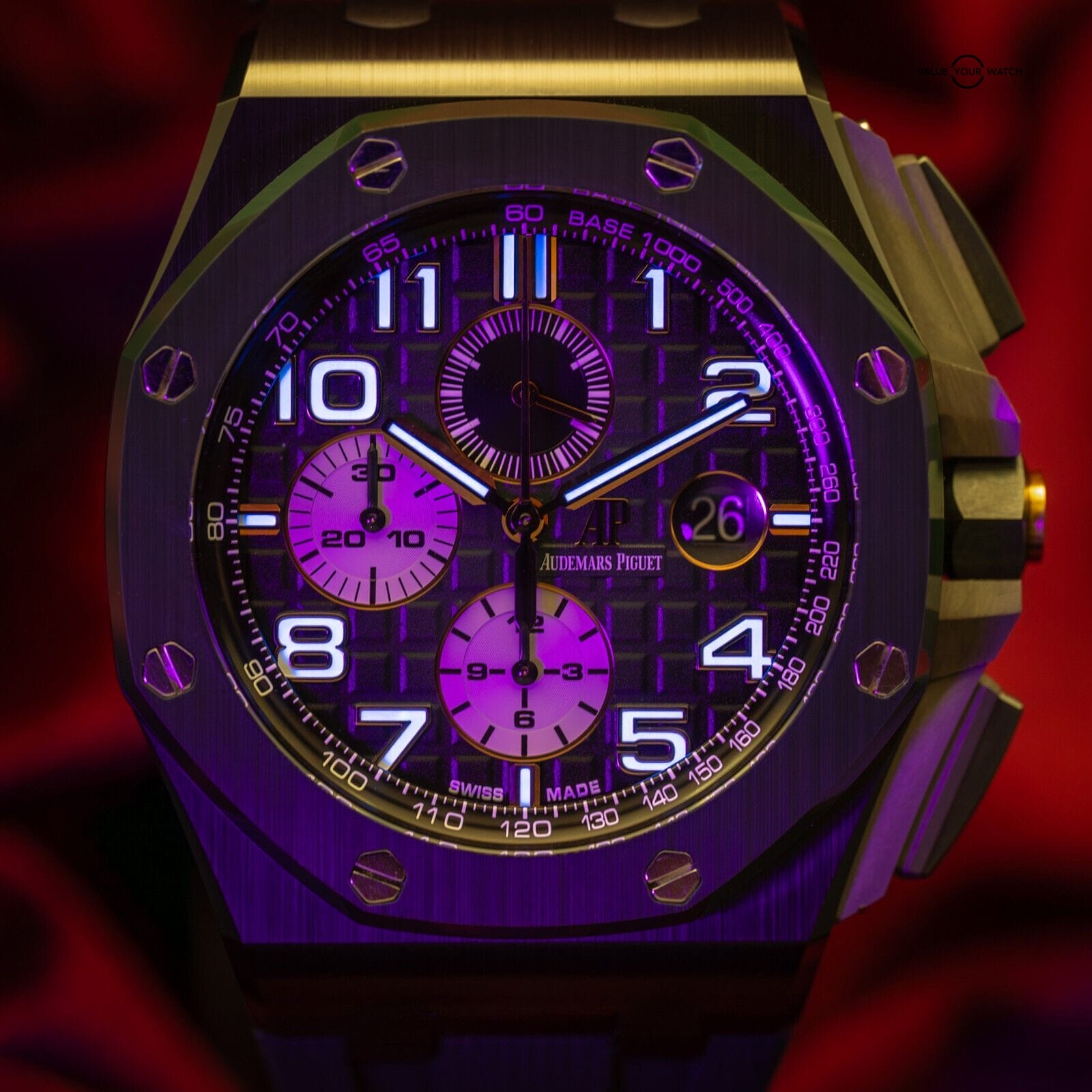 One of the boldest iterations of the Royal Oak Offshore line, this bold 44mm piece stands out from the crowd with its green ceramic construction, and touches of rose gold throughout the dial. Outfitted with the newest numerals, this chronograph is readable, functional, and nearly indestructible.