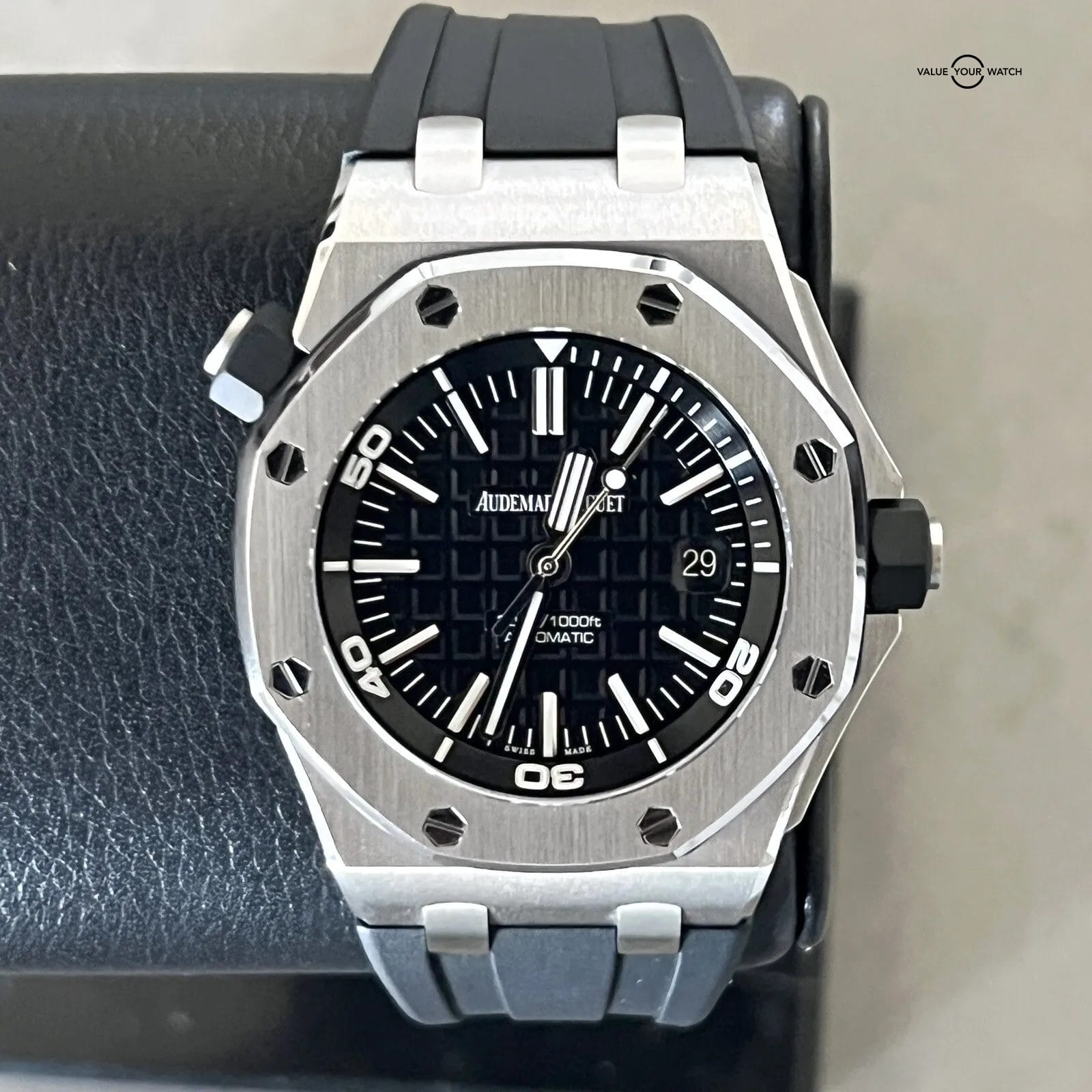 Get your hands on this luxurious Audemars Piguet Royal Oak Offshore Steel Watch. Crafted in Switzerland, this watch boasts a stunning black tapisserie dial pattern with stick indexes and a date indicator. The watch has a 42mm stainless steel case with a bidirectional rotating and count-up/dive bezel.