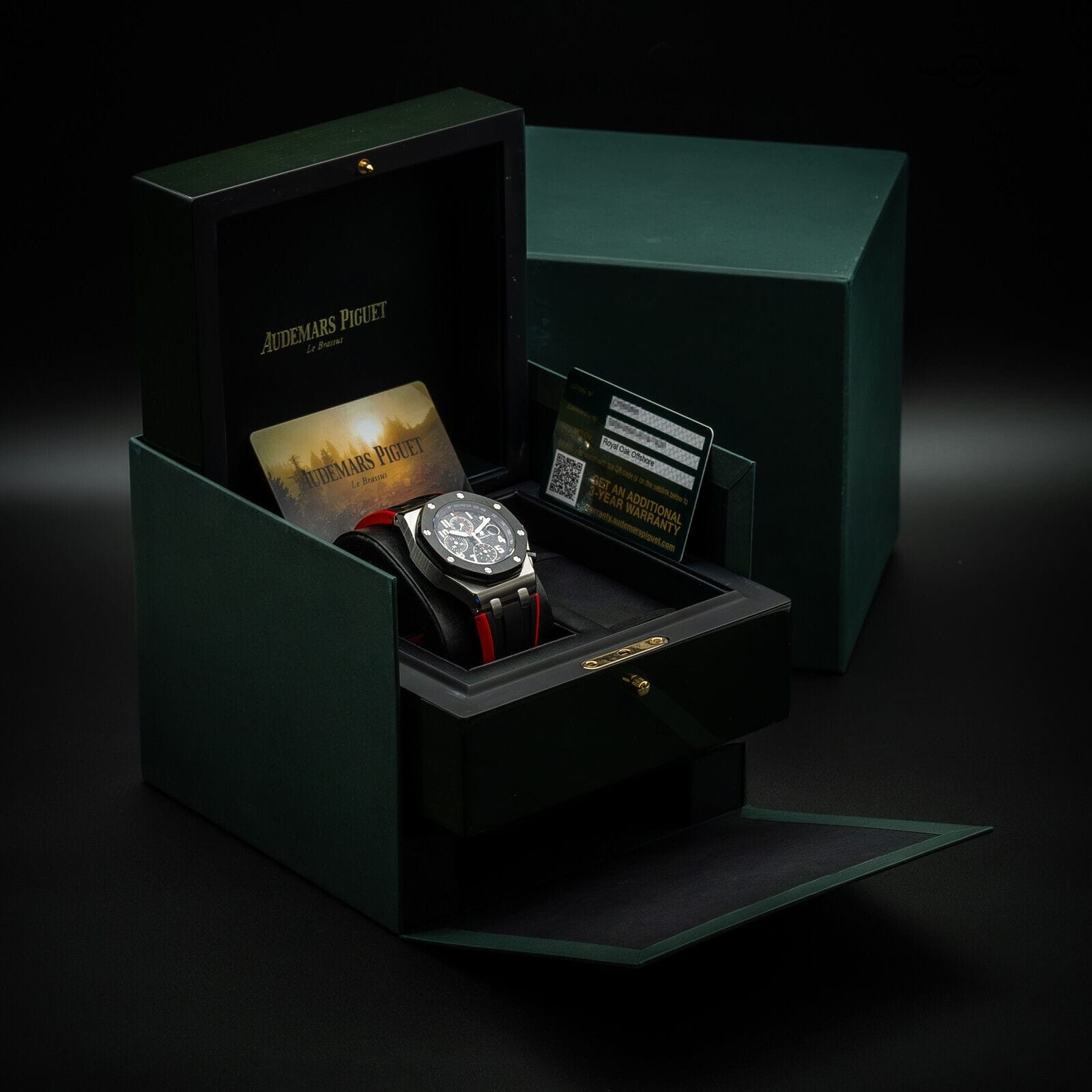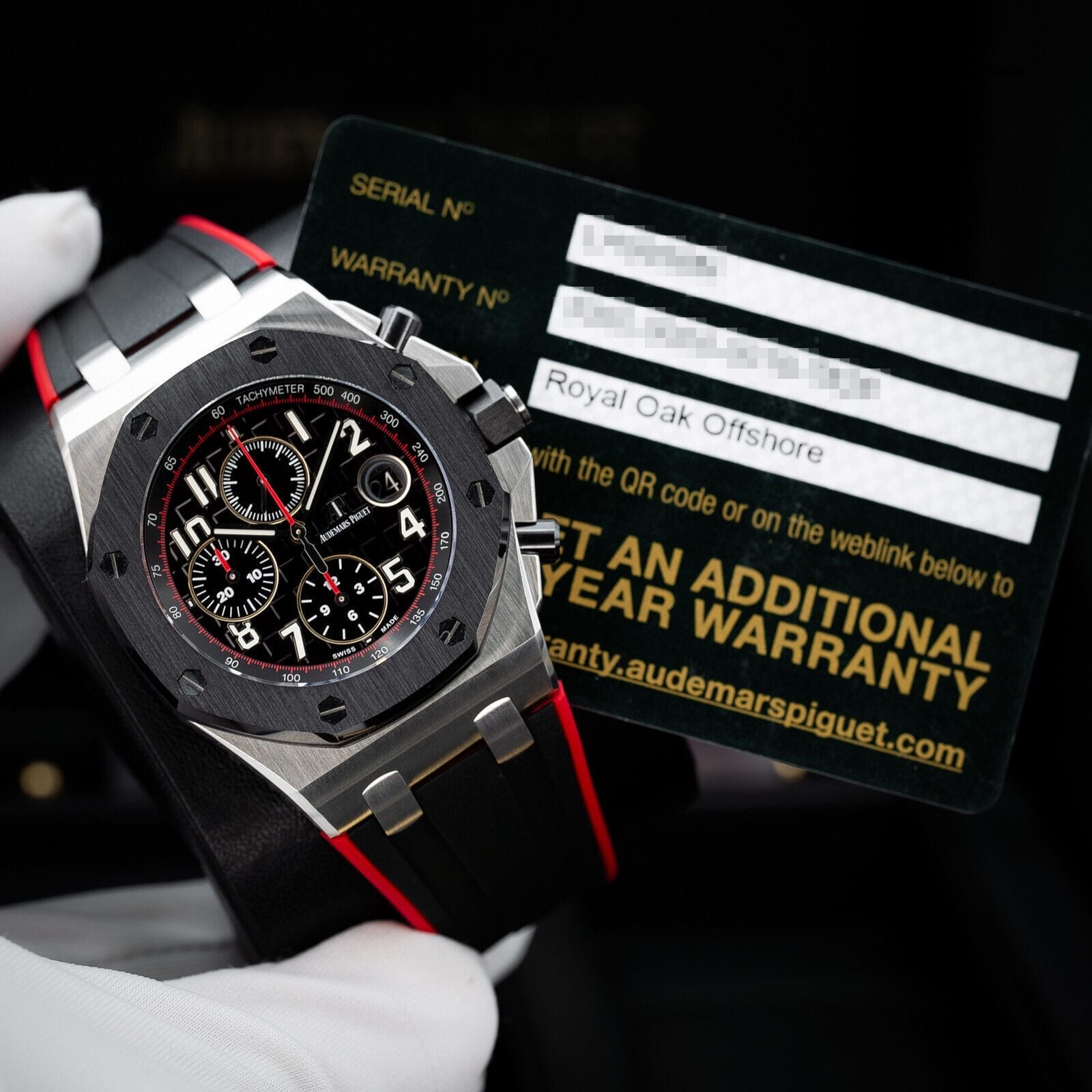 This timepiece comes as a set with the box, timepiece care card, and Audemars Piguet international warranty card. The warranty is valid until February 28th, 2025.