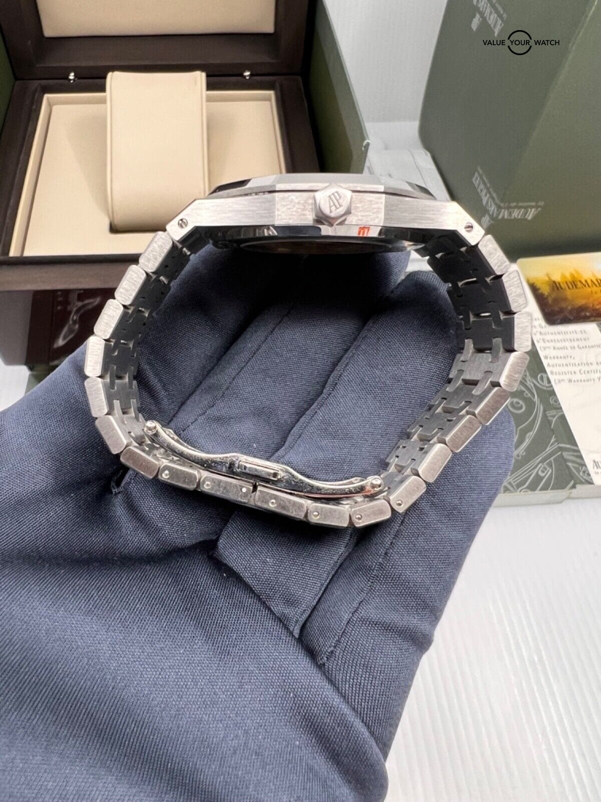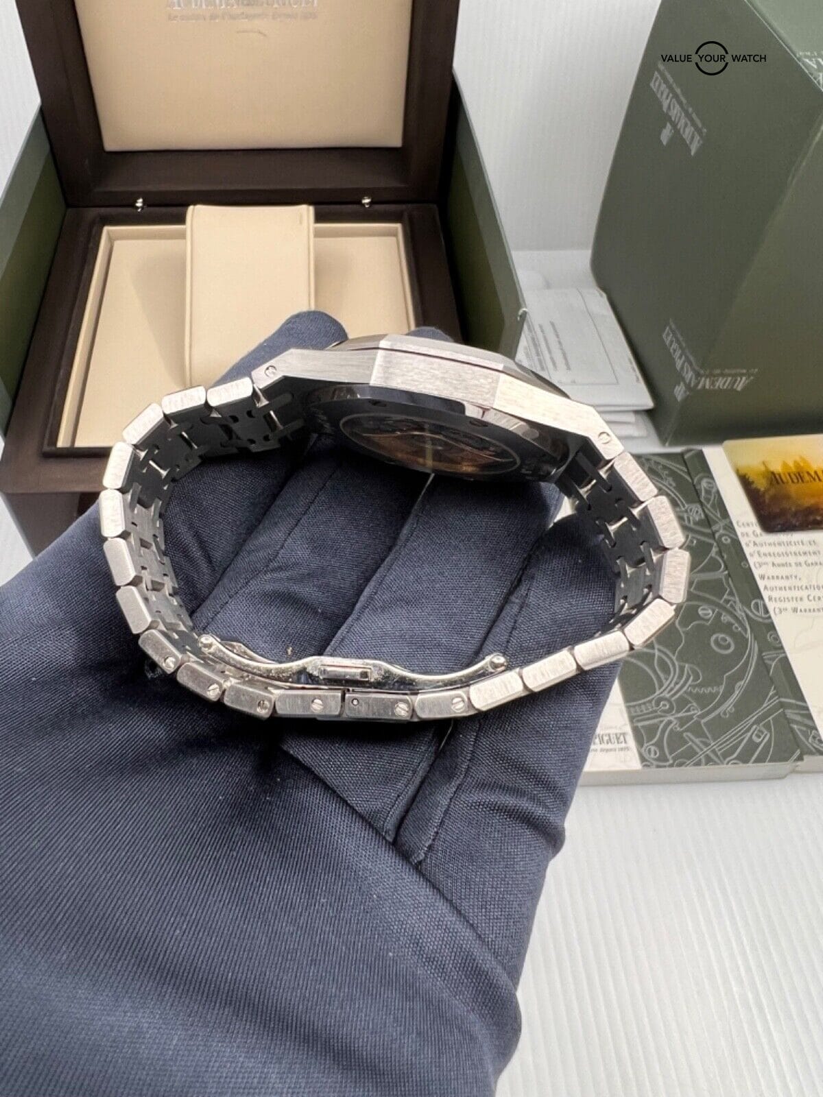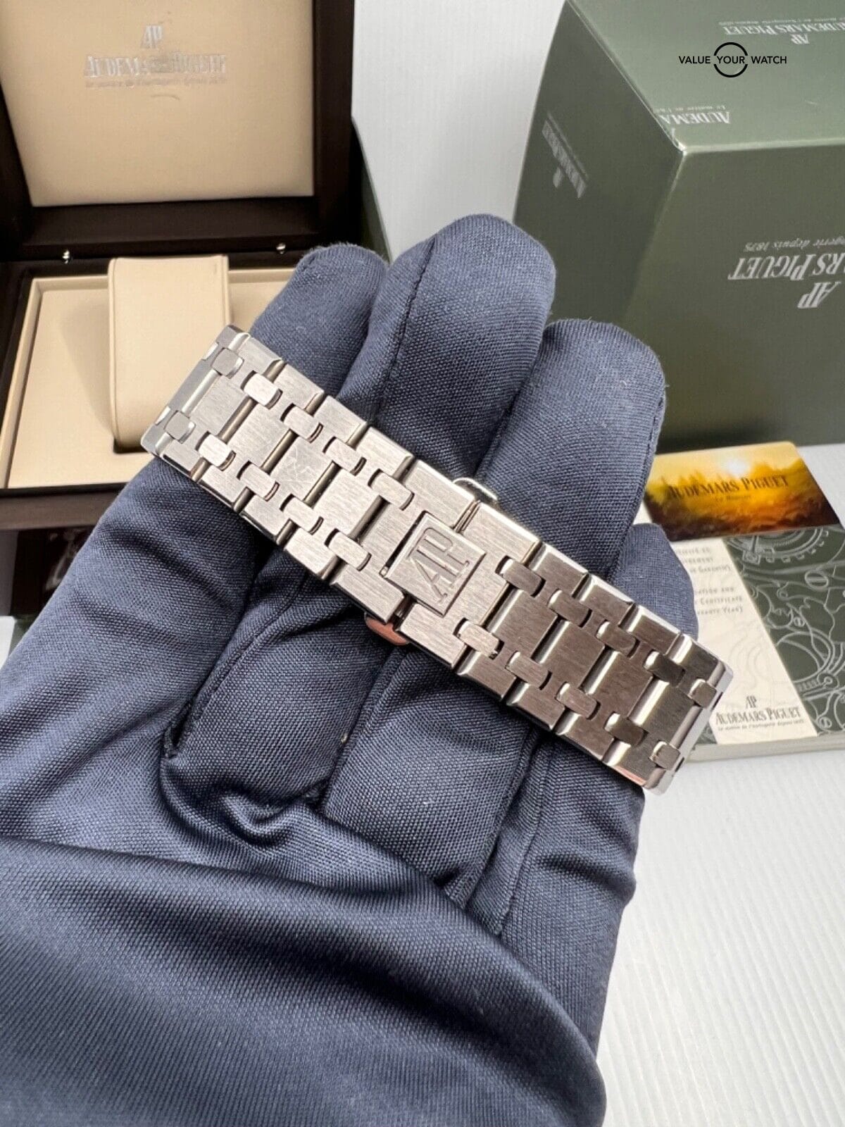 The watch is fitted with the iconic stainless steel Royal Oak bracelet, known for its distinctive design and comfortable wear. The integrated bracelet seamlessly flows from the case, enhancing the overall aesthetics of the watch.