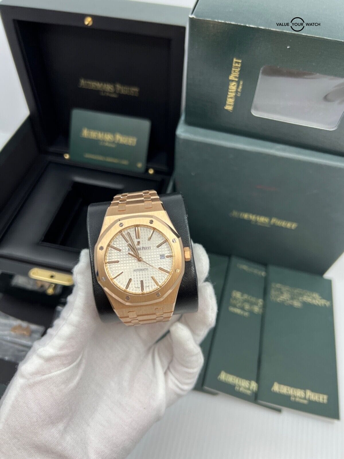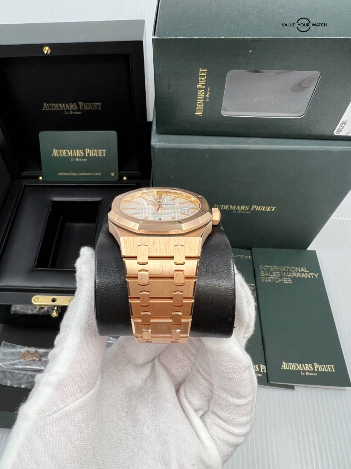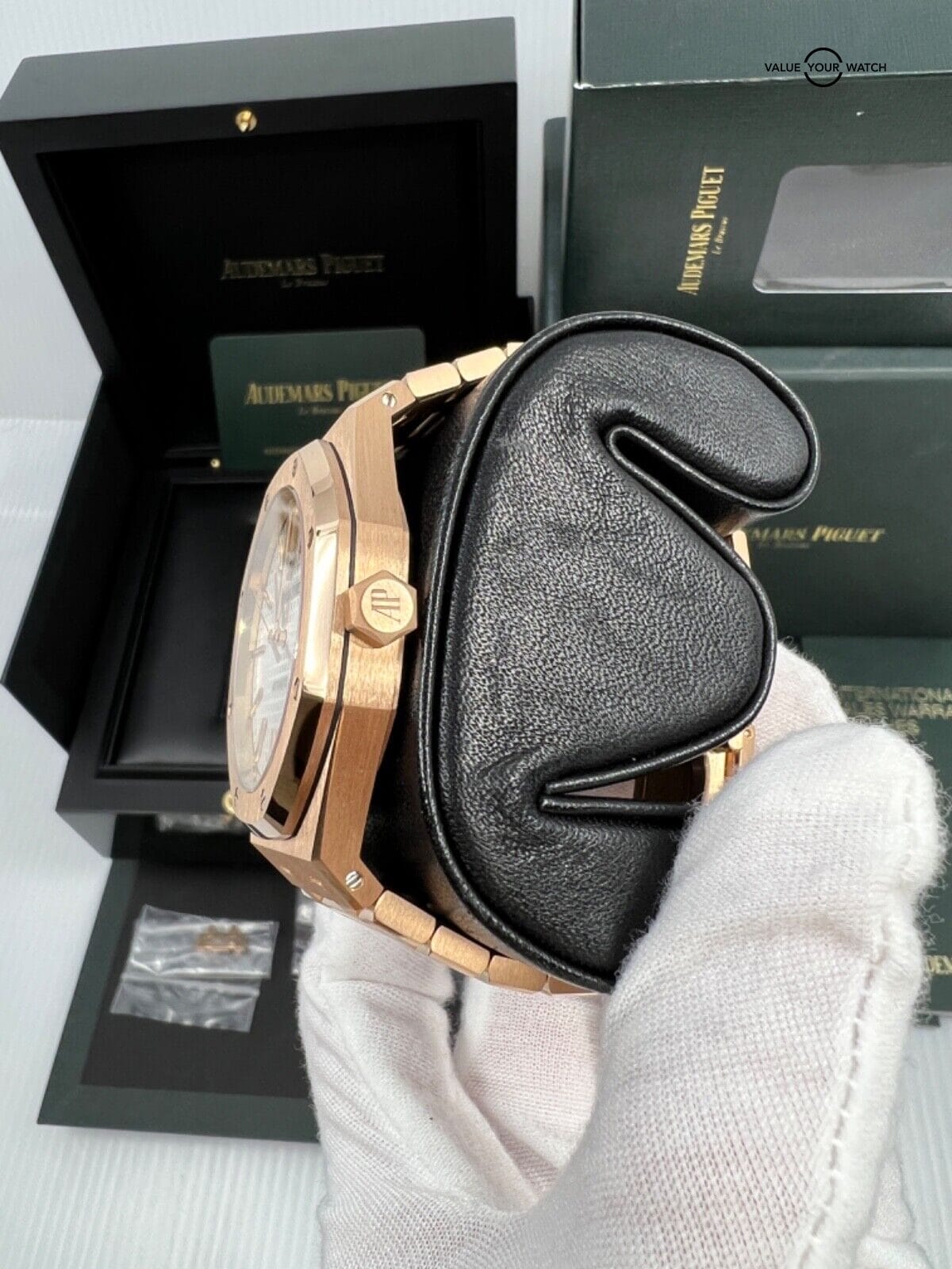Model: 2023 AP Serviced Audemars Piguet White Dial Royal Oak in 18K Rose Gold on Bracelet