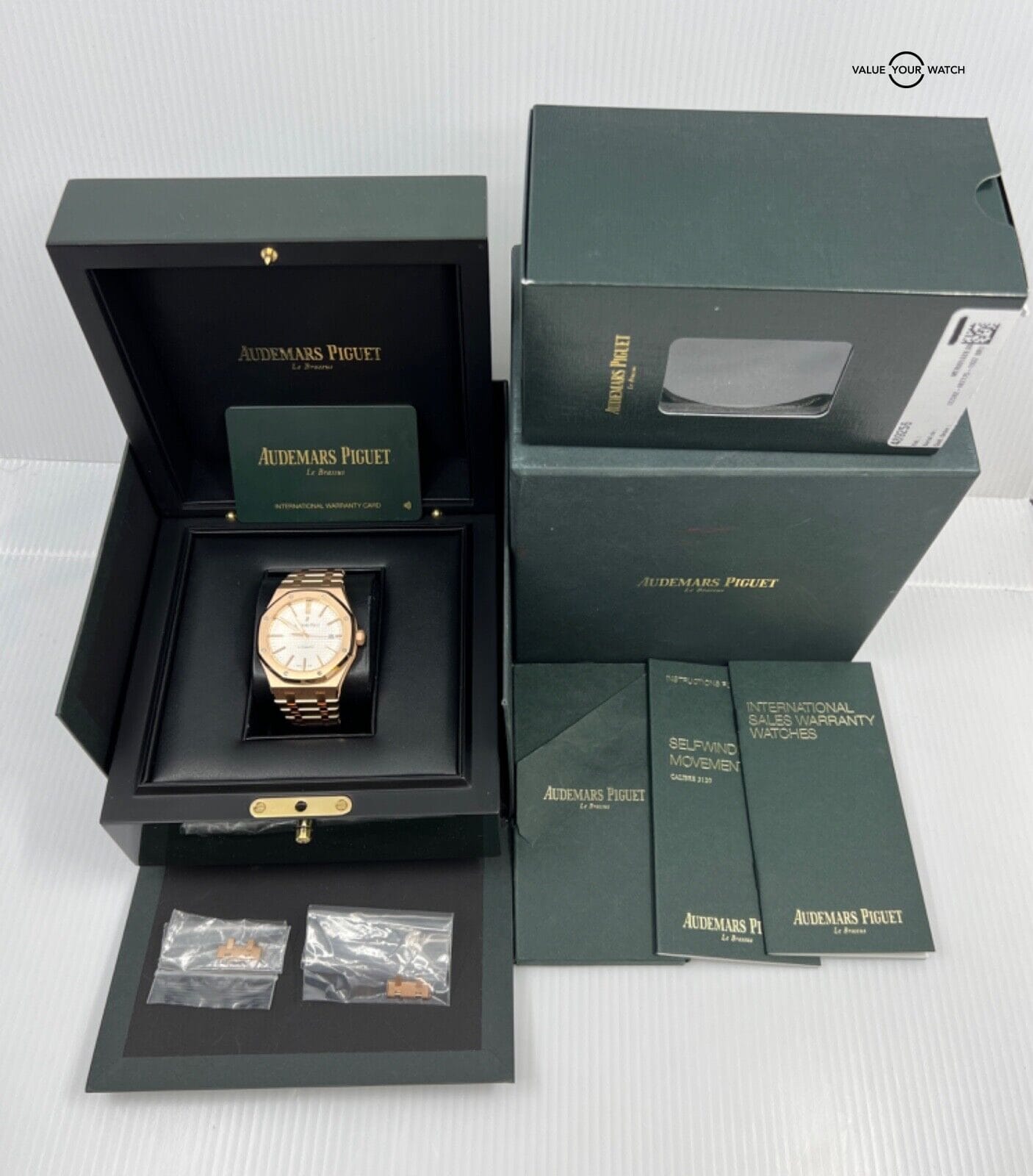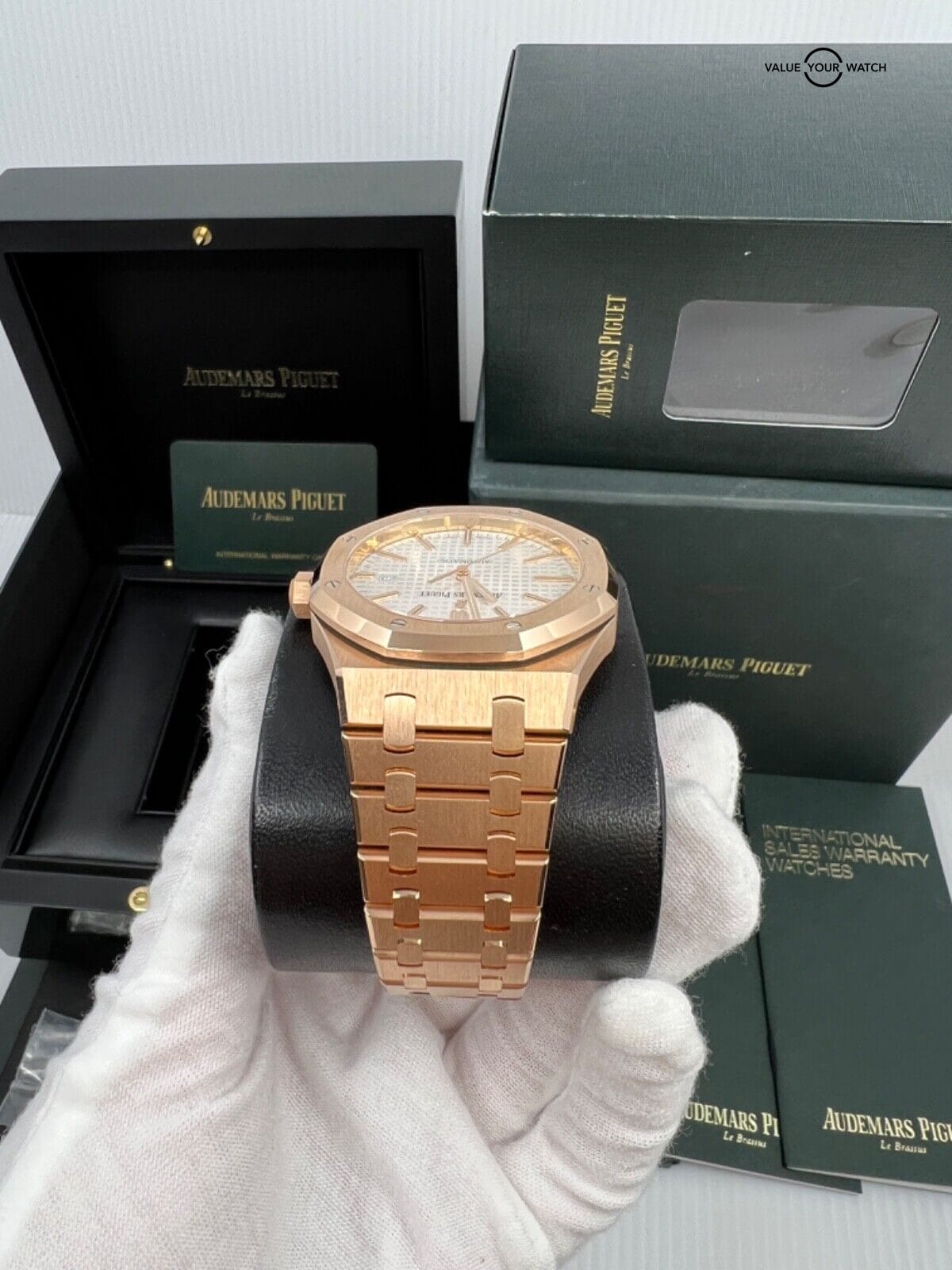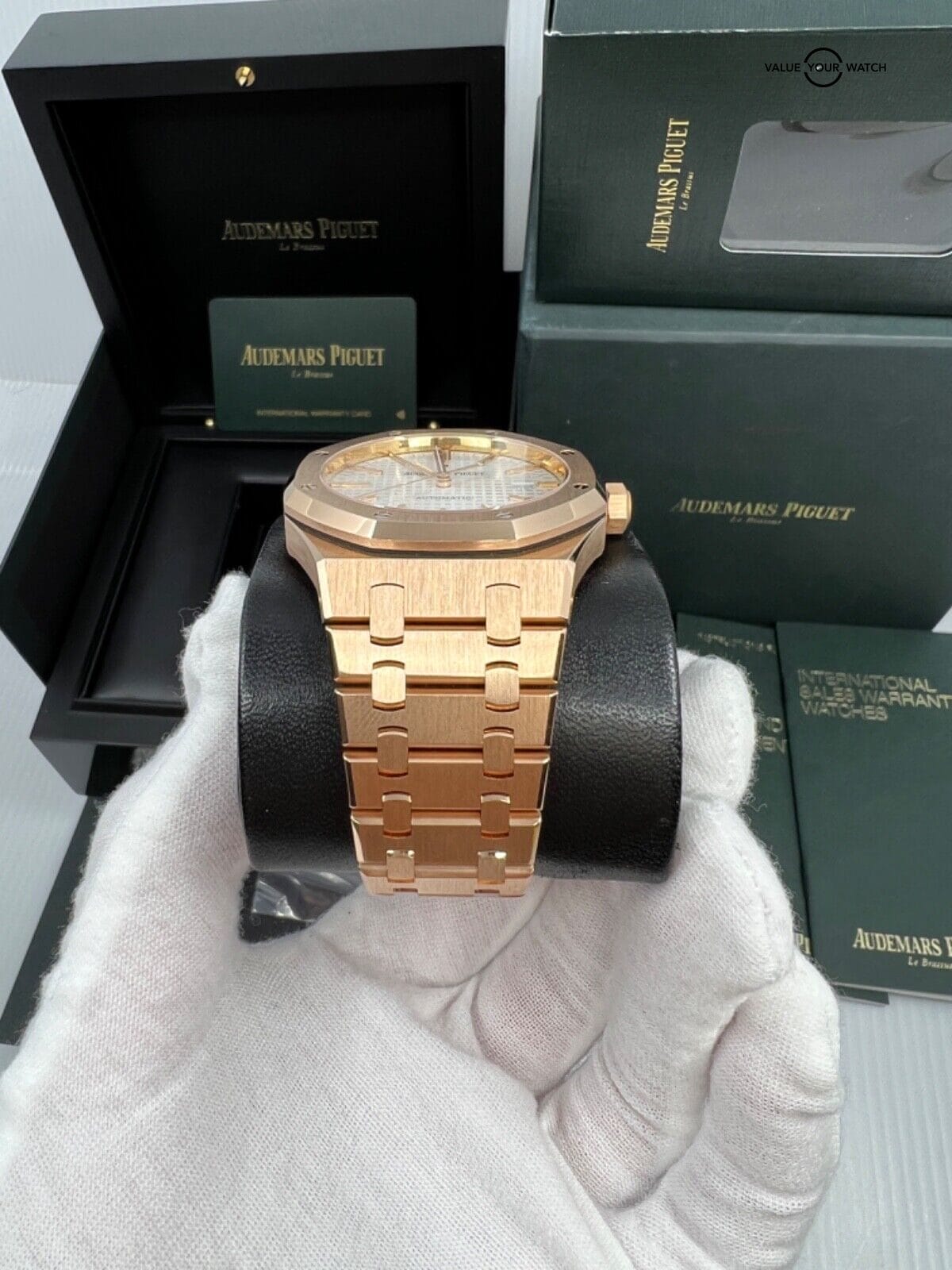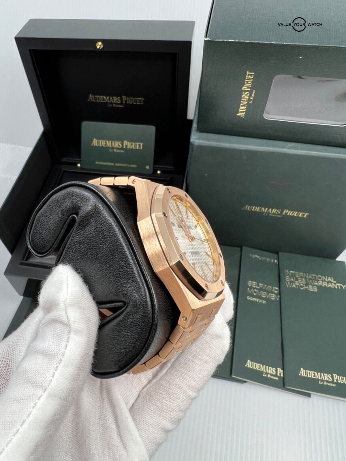 Model: 2023 AP Serviced Audemars Piguet White Dial Royal Oak in 18K Rose Gold on Bracelet