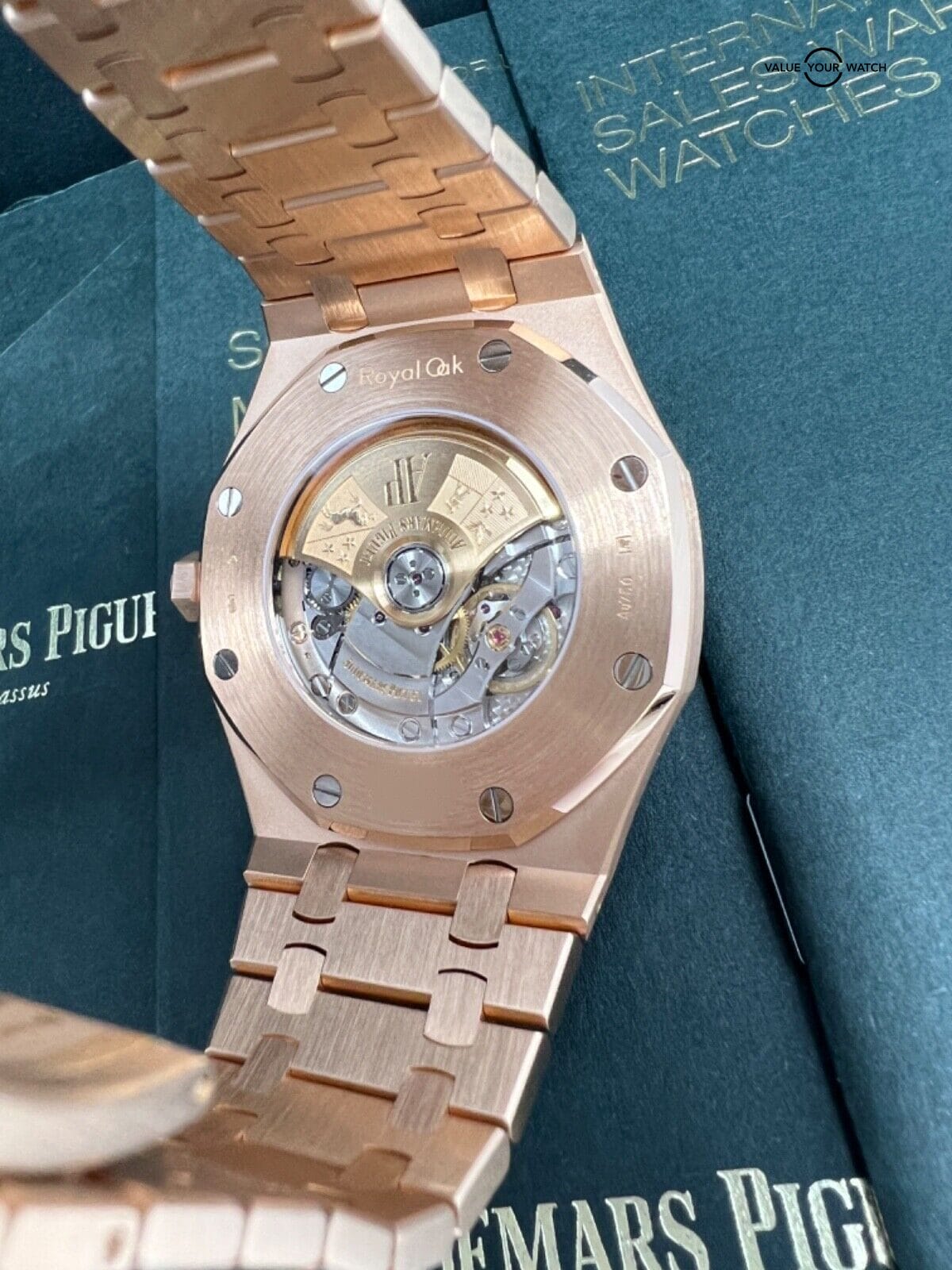 The watch is fitted with an 18K rose gold integrated bracelet, which is not only a design hallmark of the Royal Oak collection, but also offers high levels of comfort and a seamless aesthetic appeal.