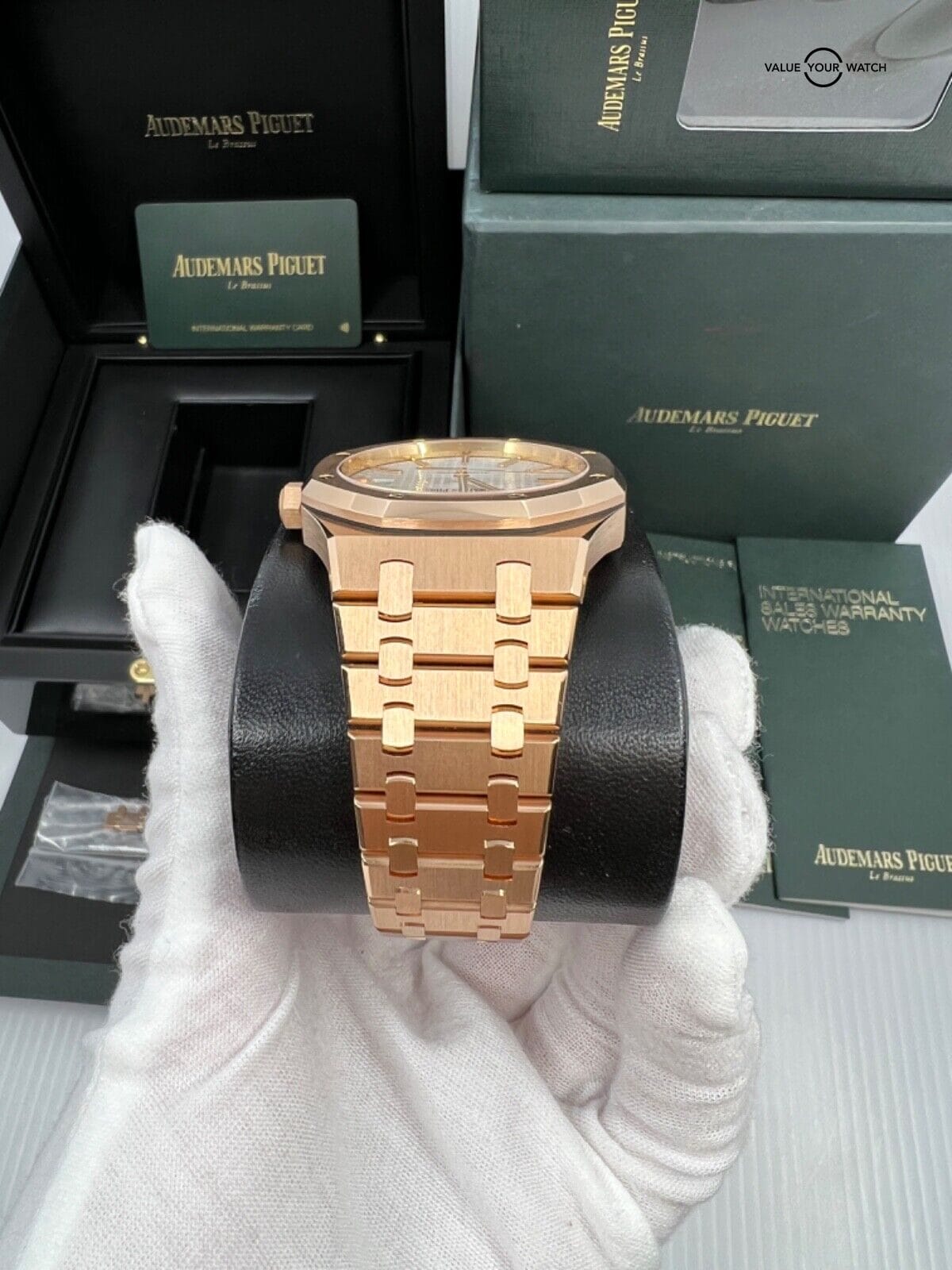 The 18K rose gold case, known for its durability and luxurious sheen, houses a stunning white dial that stands out beautifully against the warmth of the rose gold. The dial features the “Grande Tapisserie” pattern, a signature element of the Royal Oak collection, along with rose gold applied hour-markers and Royal Oak hands.