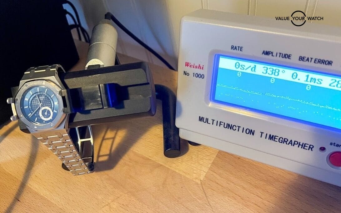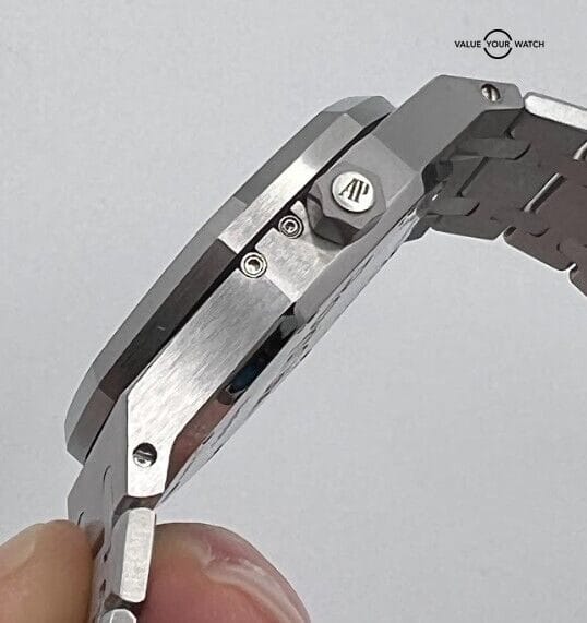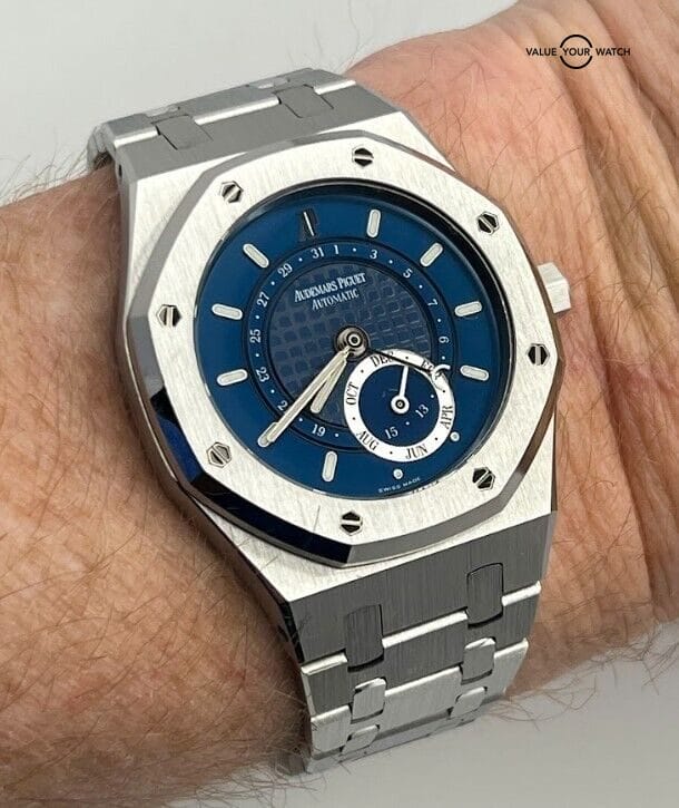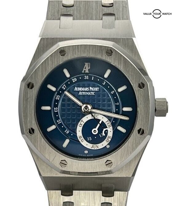 Check out this Audemars Piguets Royal Oak, where style meets stainless steel and a touch of blue/grey magic! This 36 mm stainless steel wonder comes with a fixed bezel and an annual calendar complication that’s so fancy, even your schedule will be jealous. And hey, it can resist water up to 165 feet – because even watches need to stay cool!