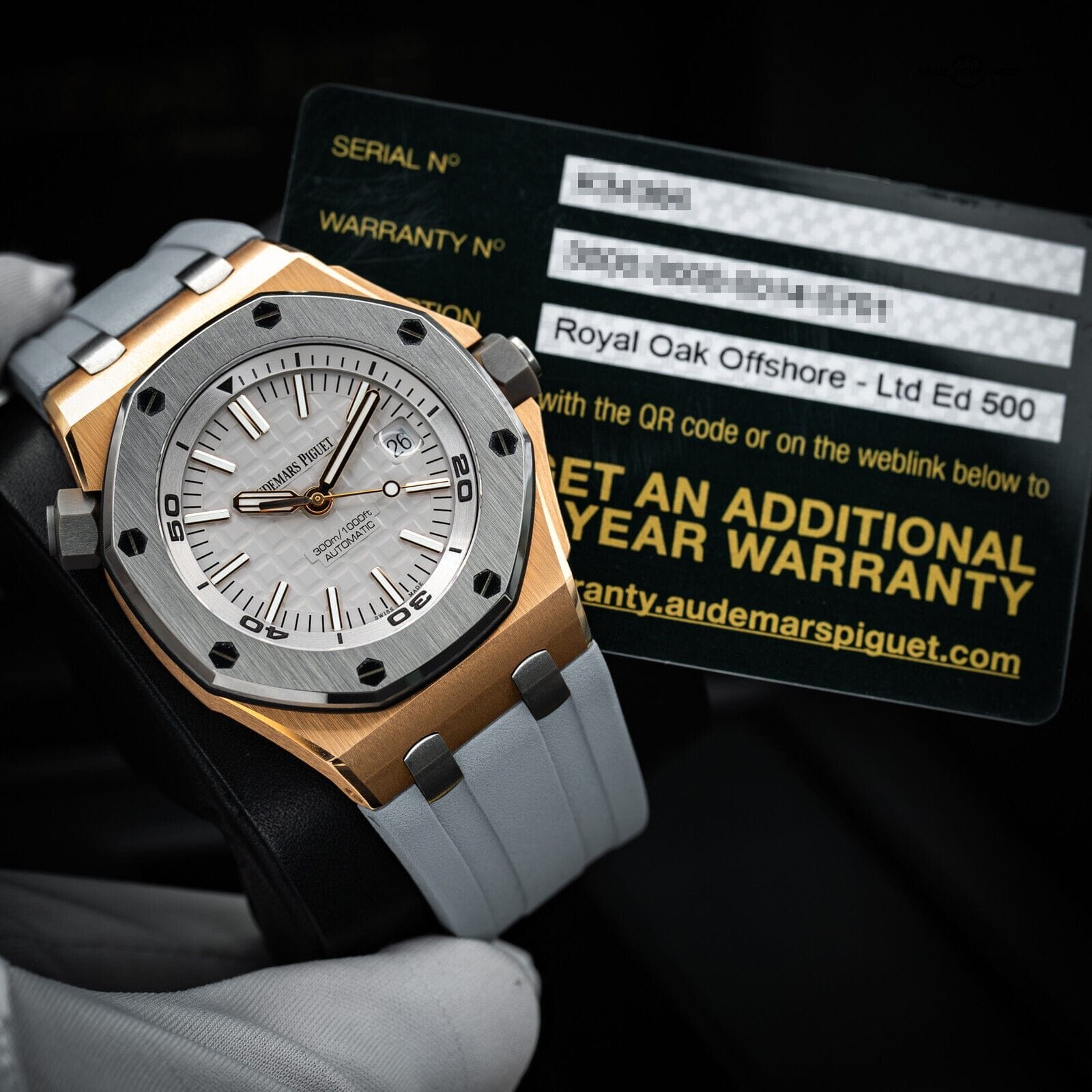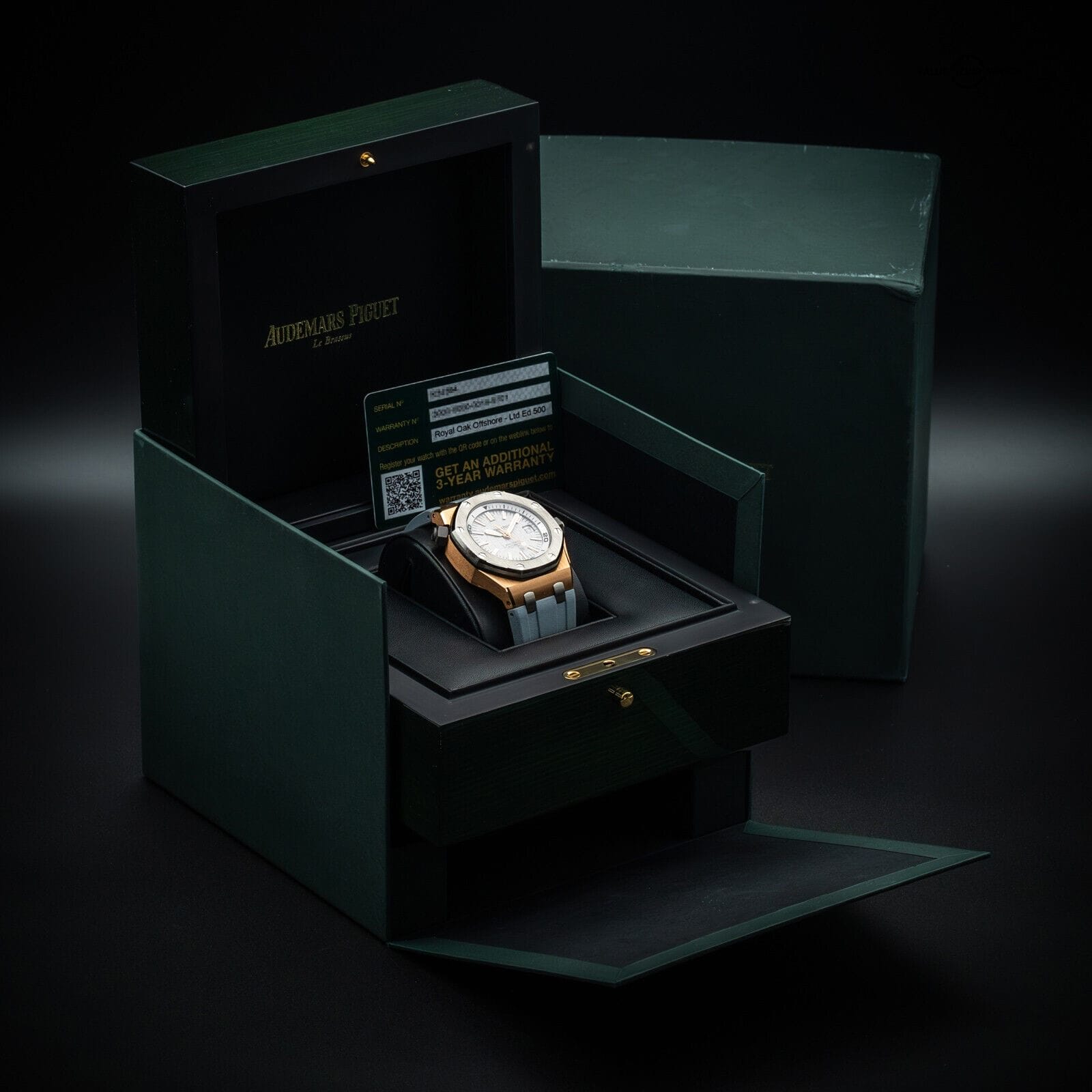 It will come with authentic AP boxes and the original AP grey rubber strap in mint condition. It also comes with the warranty card, and It’s still covered under the AP International warranty until April 8th, 2024. It’s in perfect working order and keeping impeccable time, so it will not need service for quite some time to come.