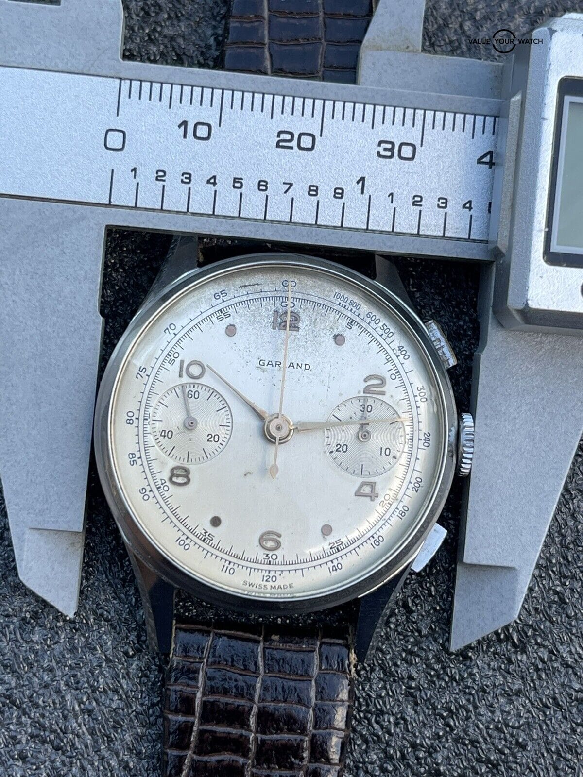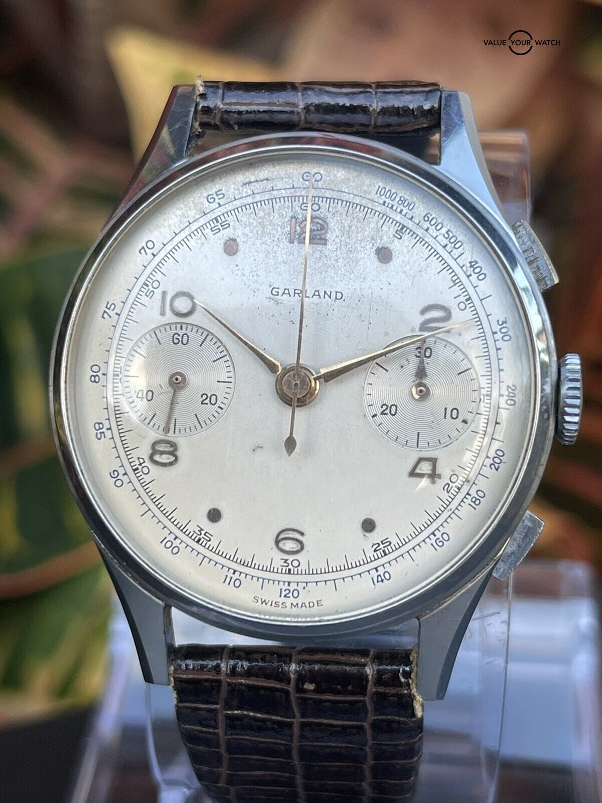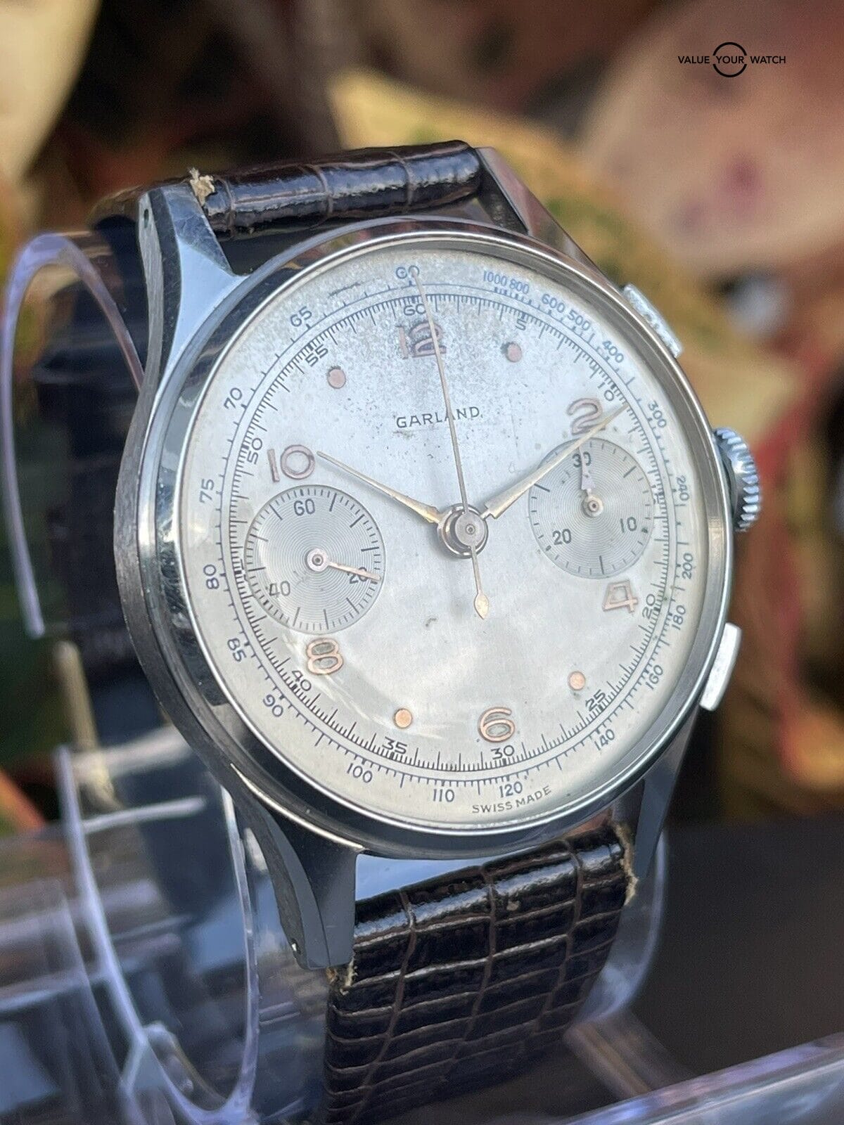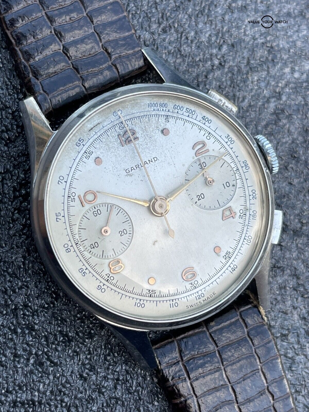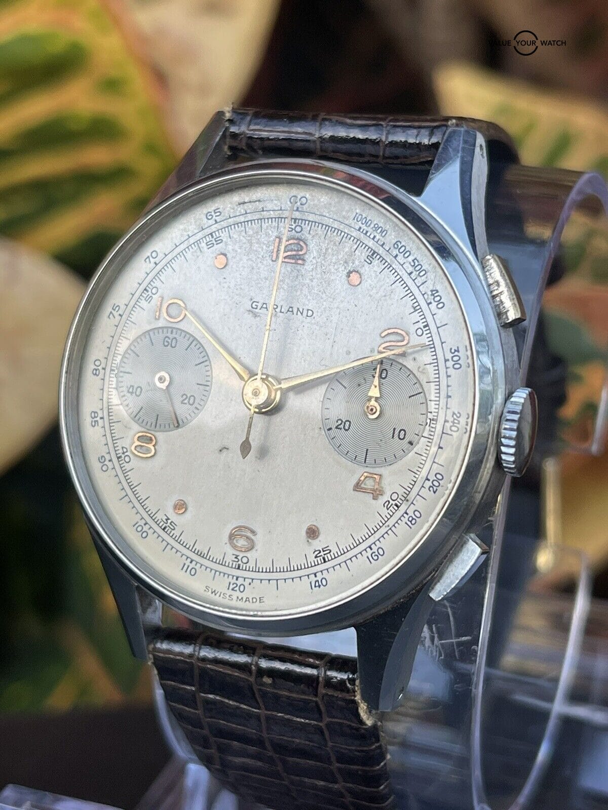 Dial: Beautiful, original dial showing slight but even patina and is a real pleasure to watch the way it changes colors in different light. Signed Garland, 60 second and 30 minute counters. Original gold plated hands.
