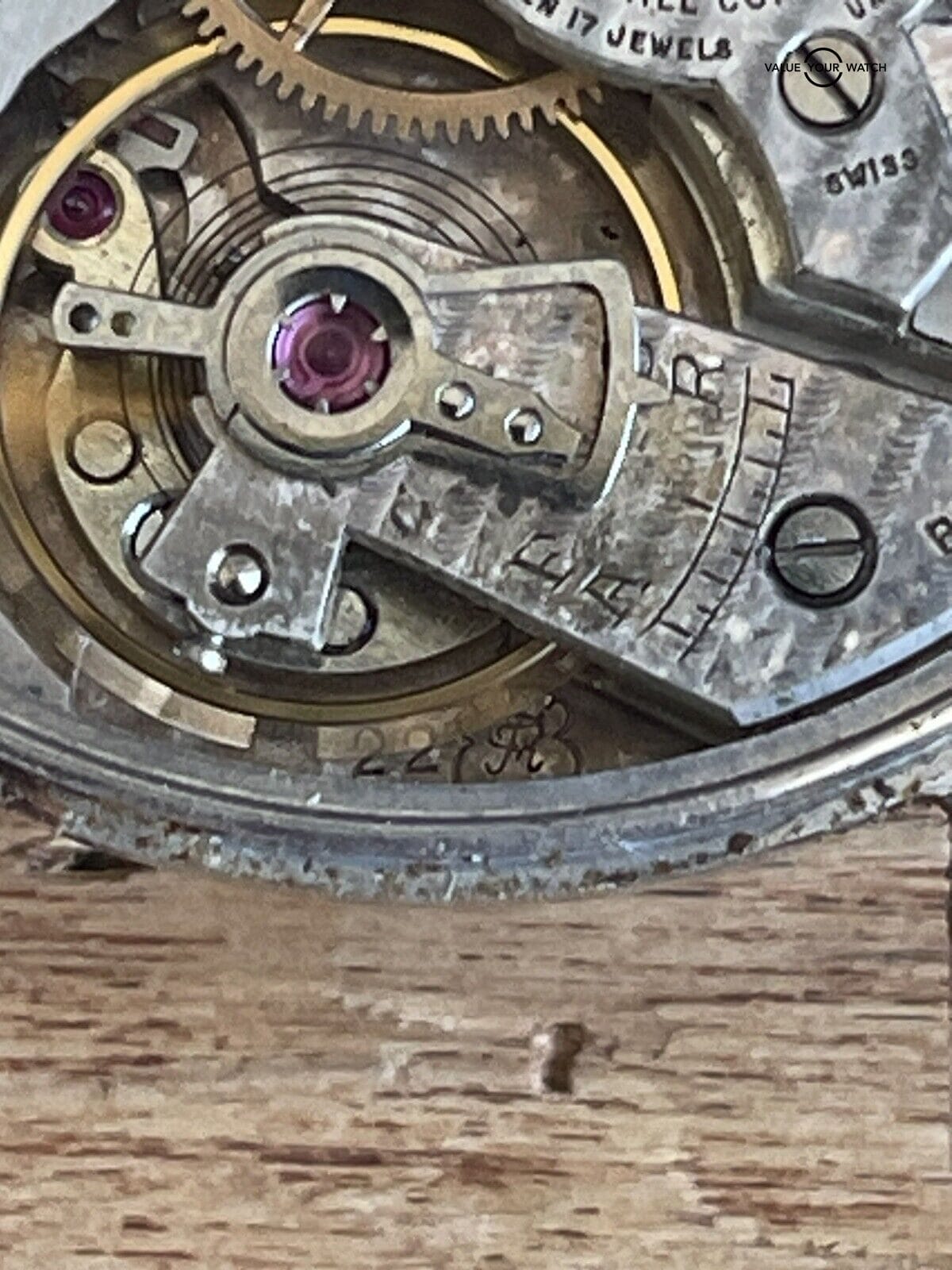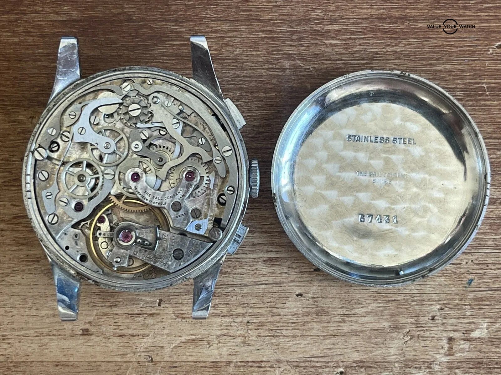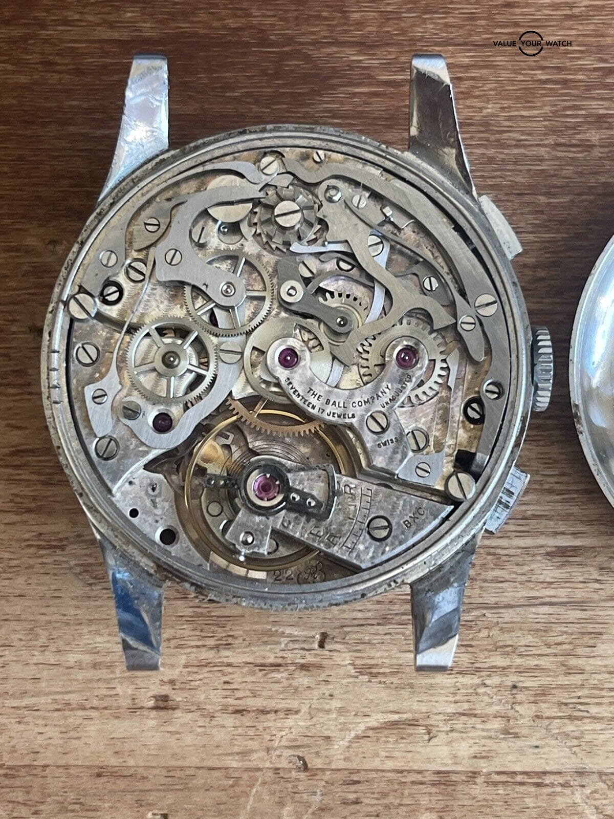 Movement: Valjoux 22, signed Ball company. Manual wind movement runs fast about 45 minutes + per day. Chronograph functions as it should. I got this from an estate sale so service is highly recommended.