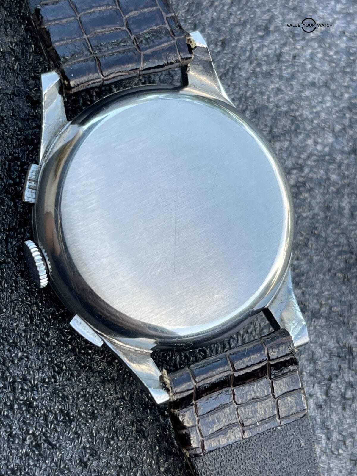Dial: Beautiful, original dial showing slight but even patina and is a real pleasure to watch the way it changes colors in different light. Signed Garland, 60 second and 30 minute counters. Original gold plated hands. Case: Unpolished stainless steel case, signed Ball Company caseback. Movement: Valjoux 22, signed Ball company. Manual wind movement runs fast about 45 minutes + per day. Chronograph functions as it should. I got this from an estate sale so service is highly recommended. Leather strap is used and shows signs of wear. Not original to the watch. This is an amazing vintage chronograph watch. A must for any Garland, Ball or watch fan. This watch is used and thus being sold “as is” with no warranty. No box and no papers. No returns, so please see all photos for conditioning. Photos are part of the description. Thanks for looking. |