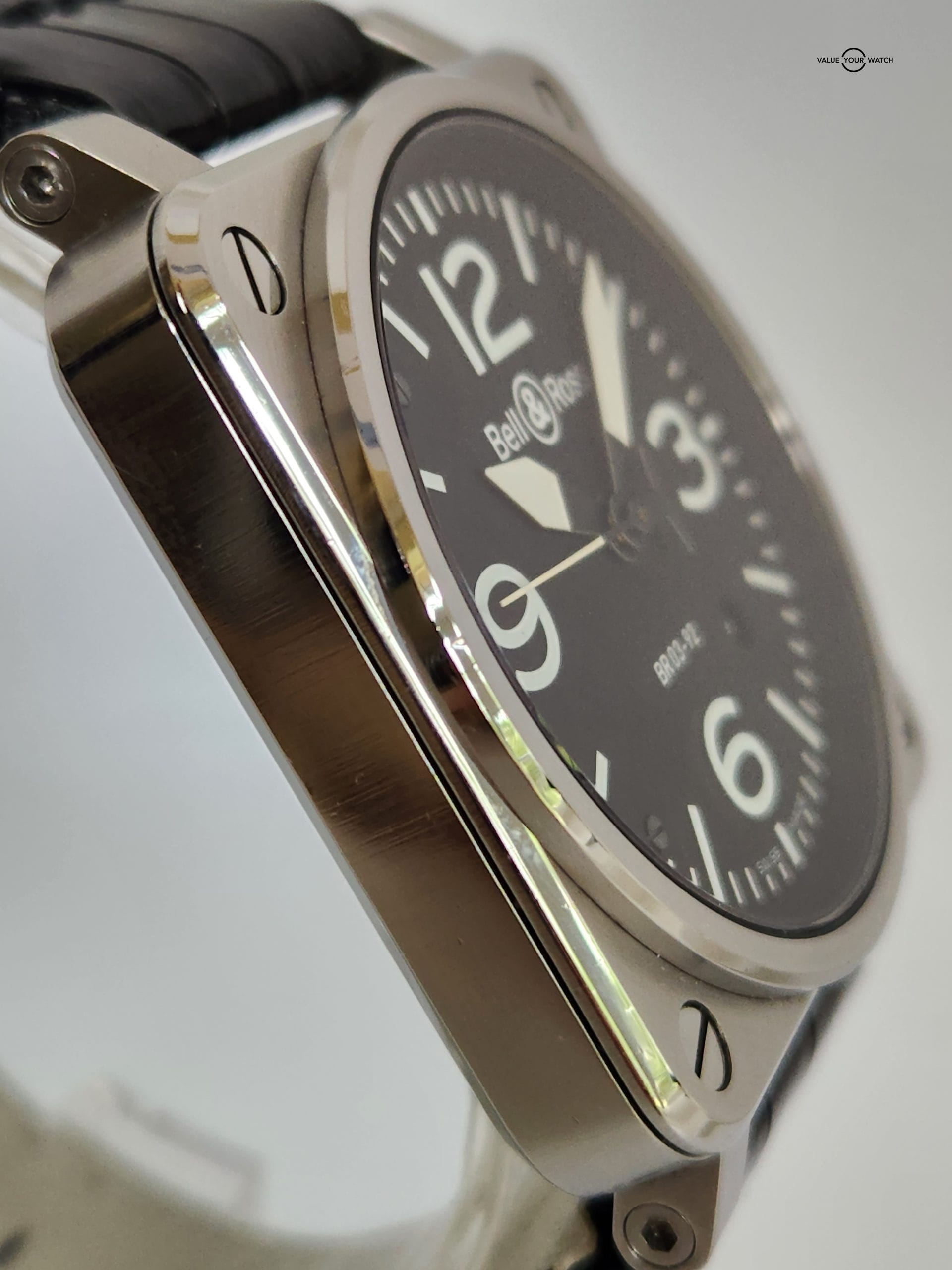 This gleaming Bell & Ross BR03-92 is the perfect blend of form and function and can easily be worn with formal and casual attire alike. Its classic square shape, polished and brushed stainless steel case and aviator-styled dial are eye-catching, to say the least. This complete set includes the watch with two aftermarket alligator straps (one black, one blue), spare pins, spare Bell & Ross buckle, strap-changing tools, original warranty card, inner and outer boxes. The covering on the inner display box is peeling. The watch shows very minimal signs of wear (please see photos for accurate description of this timepiece). I will ship to you via FedEx 2-Day (included).