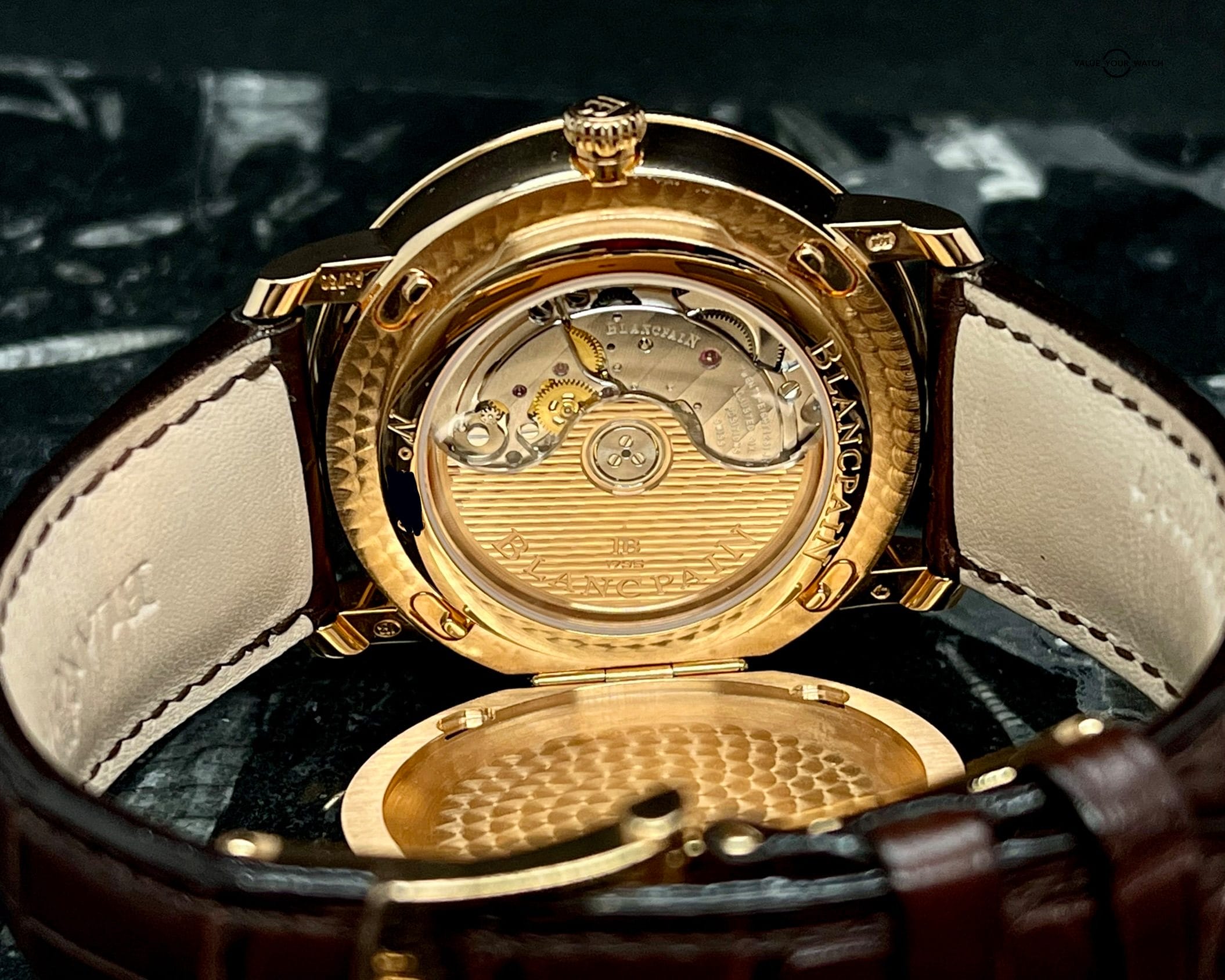 This striking sold rose gold Blancpain beautifully combines class and utility with its complete calendar moonphase. The hunter case back provides the best of both worlds. You aren’t shorted the gold like you would on a standard display back, but you also still have access to see the stunning movement.