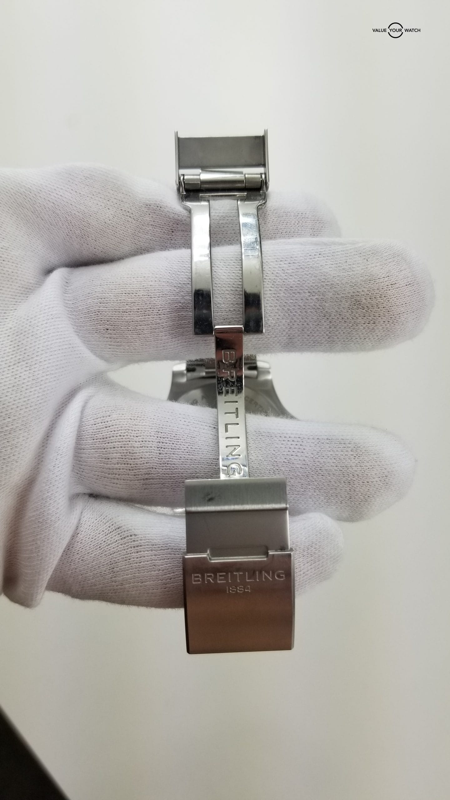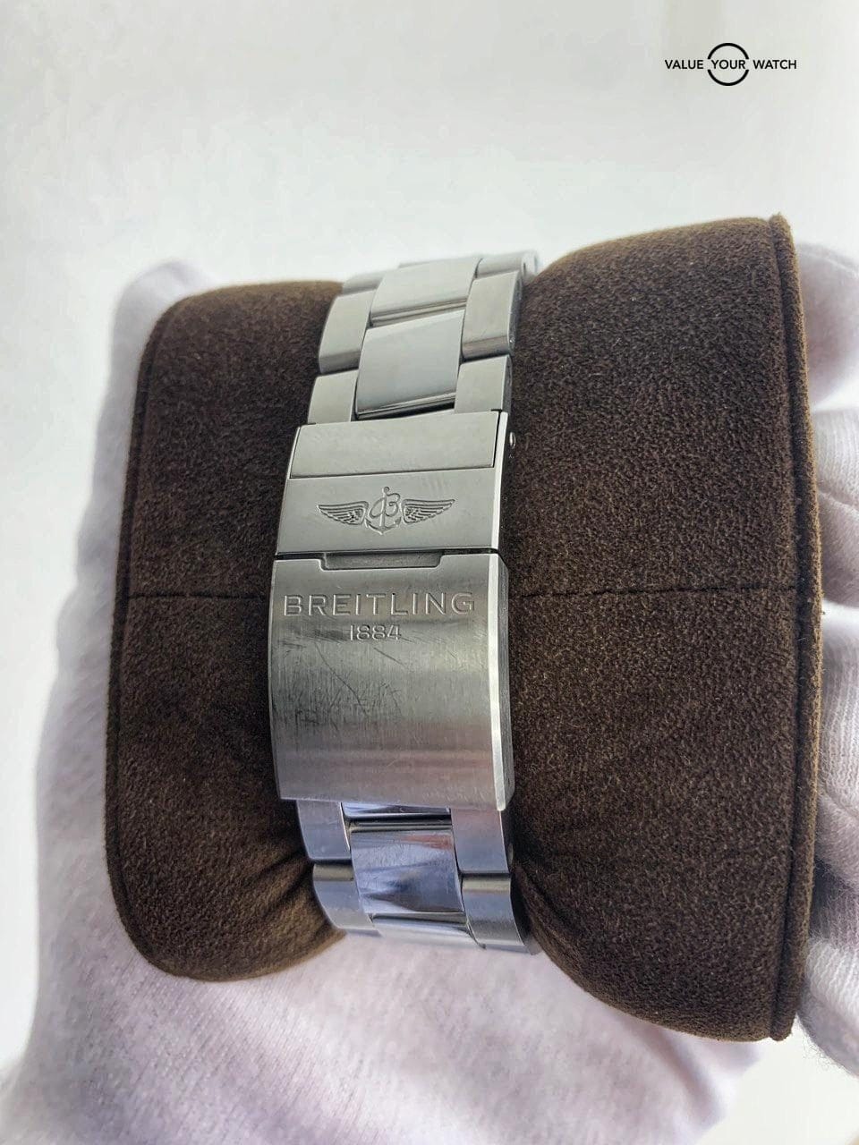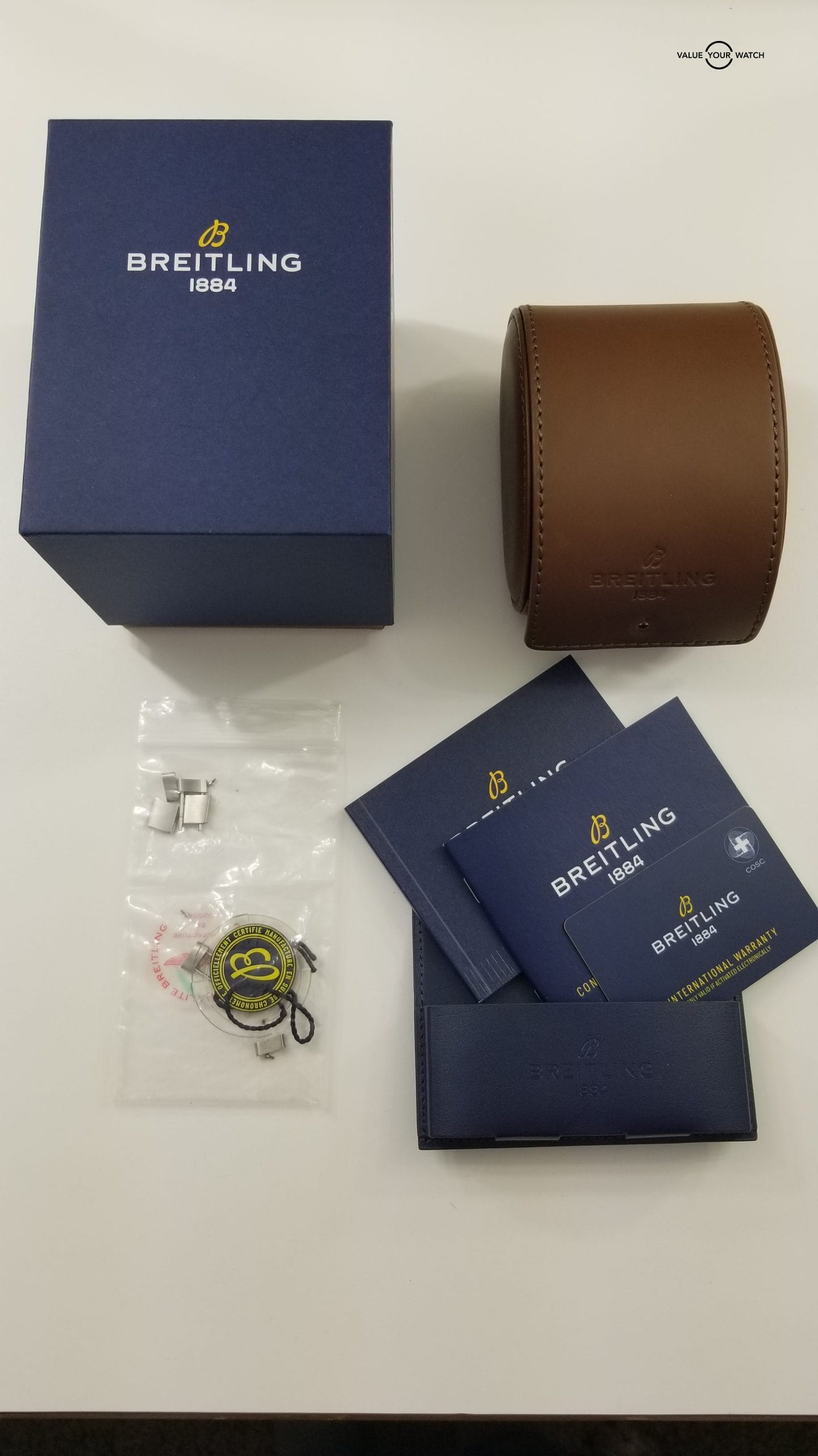 This watch comes with an outer box, inner box, travel roll, international warranty card, warranty booklet, instruction manual, manual holder, Breitling hangtag, bezel protector, caseback sticker (removed), and extra links and hardware.