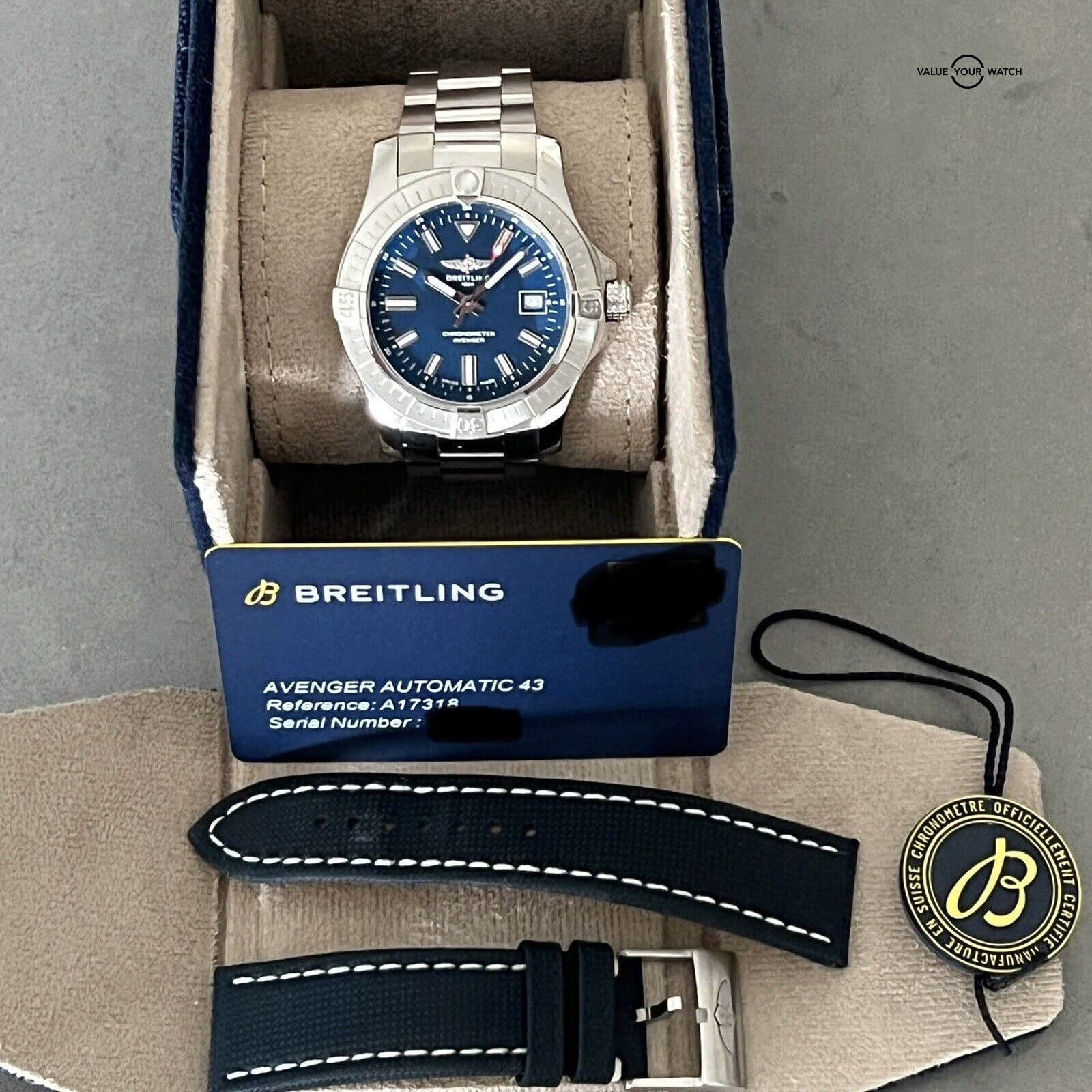 The watch also comes with an additional Breitling strap as photographed.