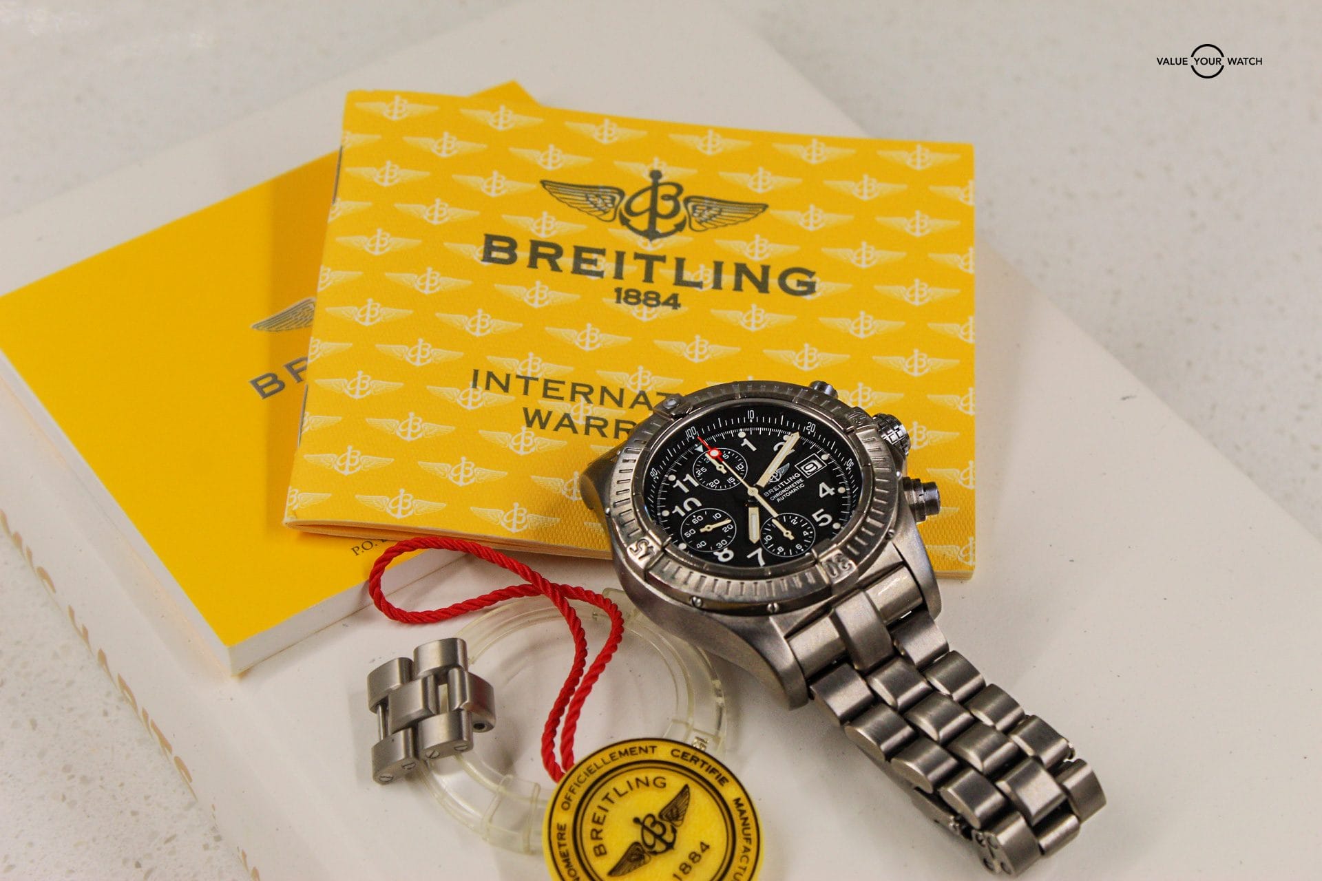 This watch is in good condition with mainly normal wear and tear aside from the bump on the bezel near 9 o’clock. Hardly noticeable while on wrist. It could use a service but it works fine regardless. The pushers for the Chronograph are a little slow to return when pushed but the Chrono works perfectly. Being Titanium makes it very light in comparison to its stainless steel counterparts. The watch comes with the original Titanium bracelet with an additional link. It also comes with the original Inner and Outer Box, Warranty Papers, Manual, no COSC papers. Please let me know if you have any questions.