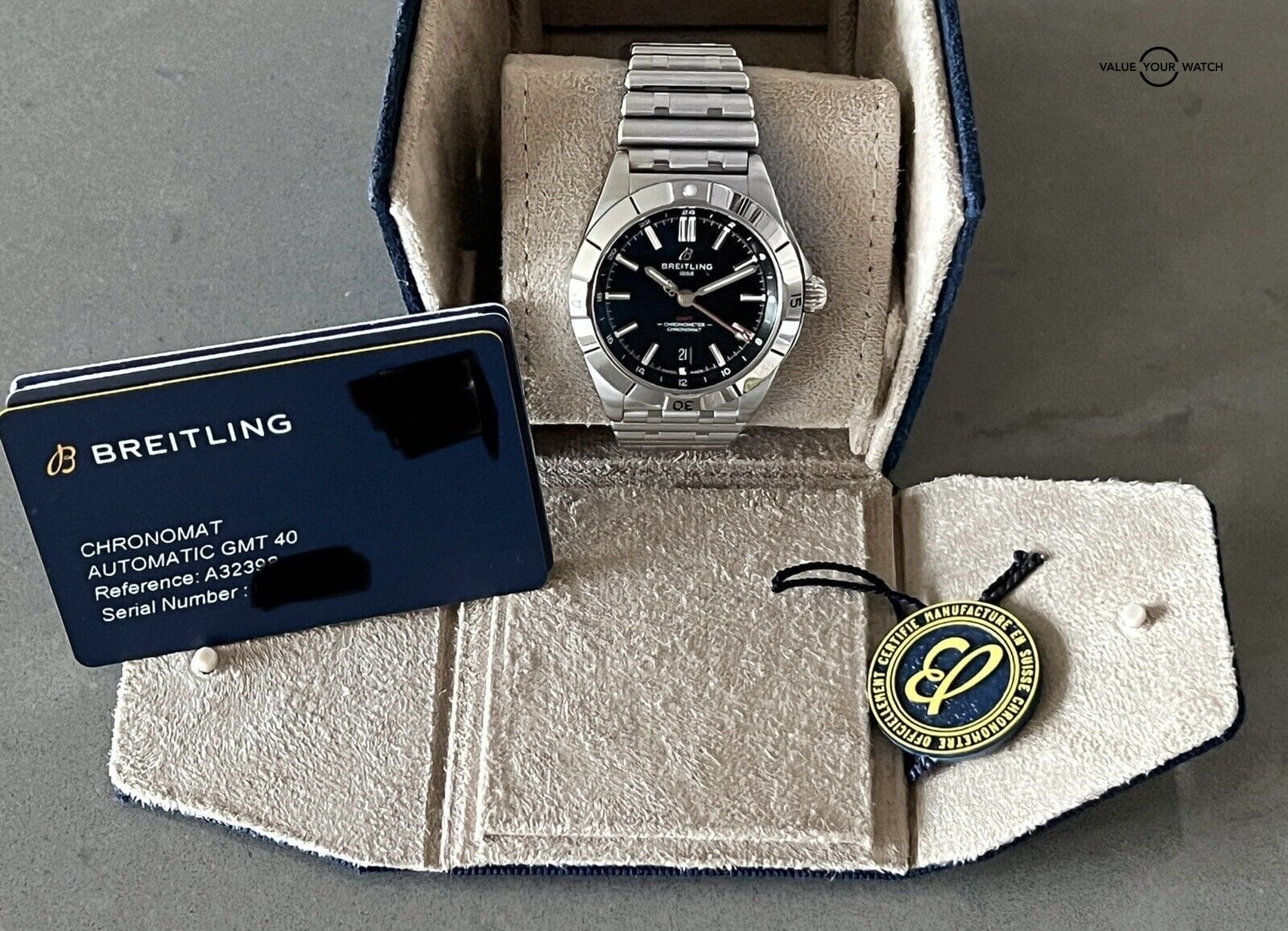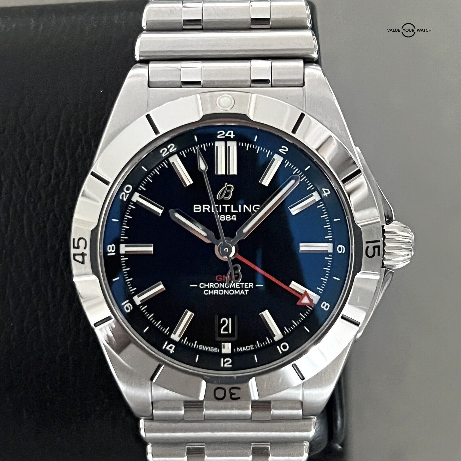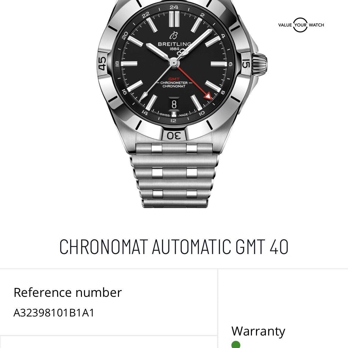 Research the current market value of the Breitling Chronomat Automatic GMT 40mm model to set a competitive and reasonable asking price.