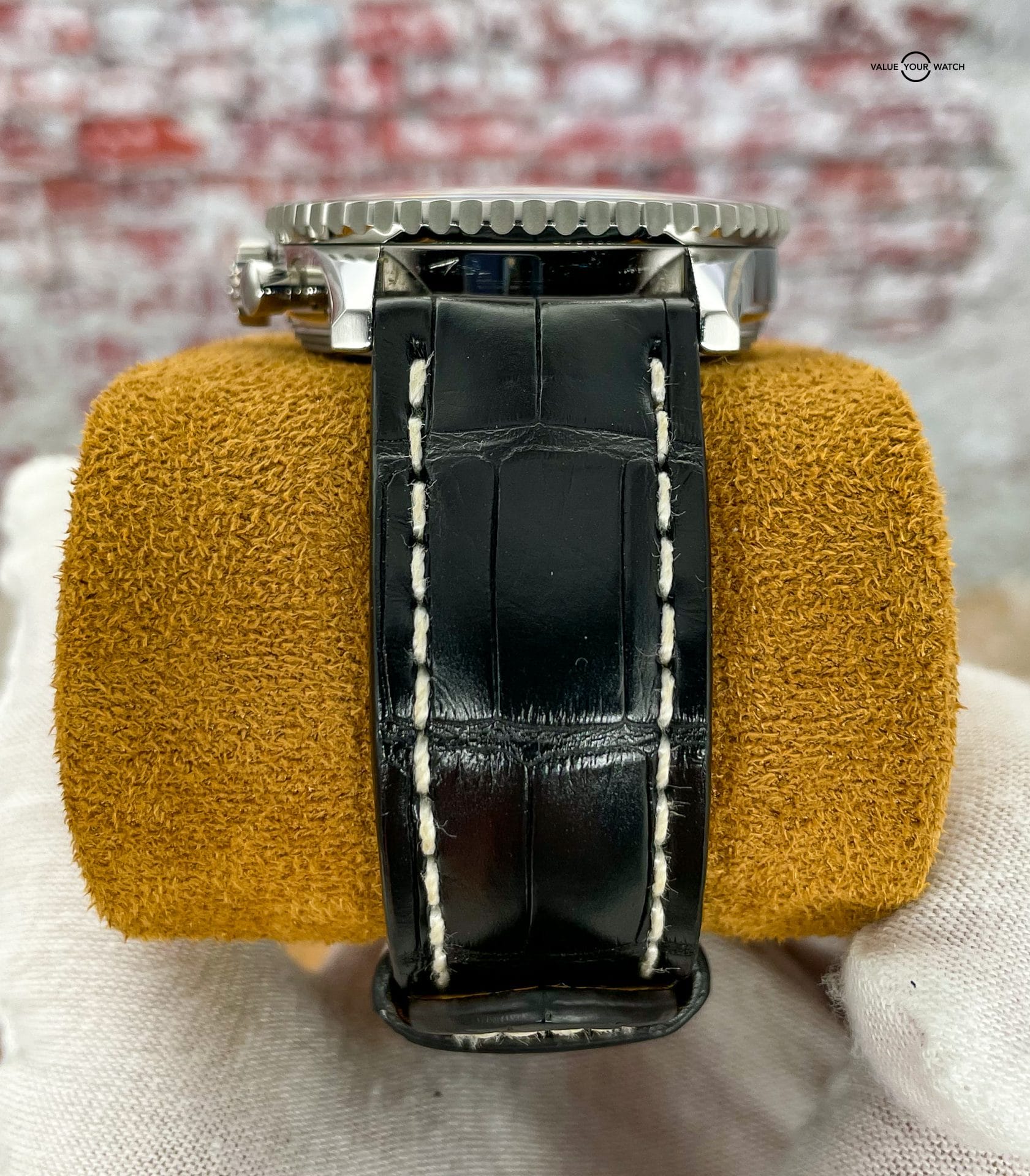 Offered by NoVA Watch Supply of Fairfax, VA: A Pre-Owned Breitling Navitimer Chronograph B01 Automatic 43mm watch on OEM black leather strap with tang style clasp. Ref # AB0121211C1P1. This B01 Navitimer is affectionately referred to as the “Black Eye Blue” due to its blue dial and black sub-dials, and is a rare combination for the Navitimer as this set-up is usually reserved for Special Editions. This now sold out variation looks great dressed up or down and has serious versatility as it can easily be paired with a black or blue suit as is, but with a quick strap swap, the possibilities are endless. This piece is almost a full kit and comes with the following: