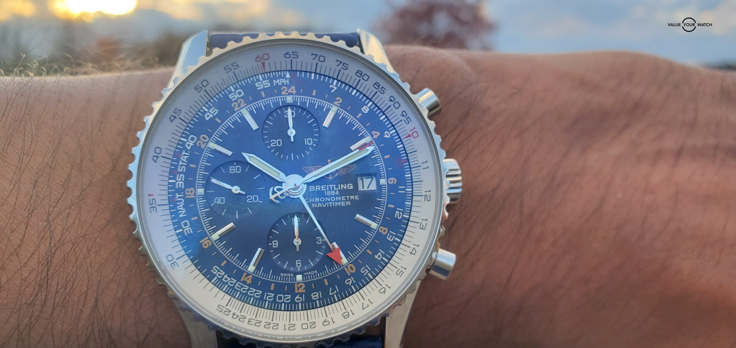 With its blue dial and easily legible dual timezone system, the Navitimer Chronograph GMT 46 is designed for the modern traveler. A red-tipped additional central hand can display the time (on a 24-hour scale) at any destination and the caseback is engraved with the time zones of the world’s major cities. Its 46 mm stainless steel case is complete with a bidirectional rotating bezel and Breitling’s iconic circular slide rule for onboard calculations. Powered by a self-winding Breitling 24 caliber, this sophisticated tool watch is presented on a blue aftermarket crocodile and comes with a beige/brown after market strap leather strap.