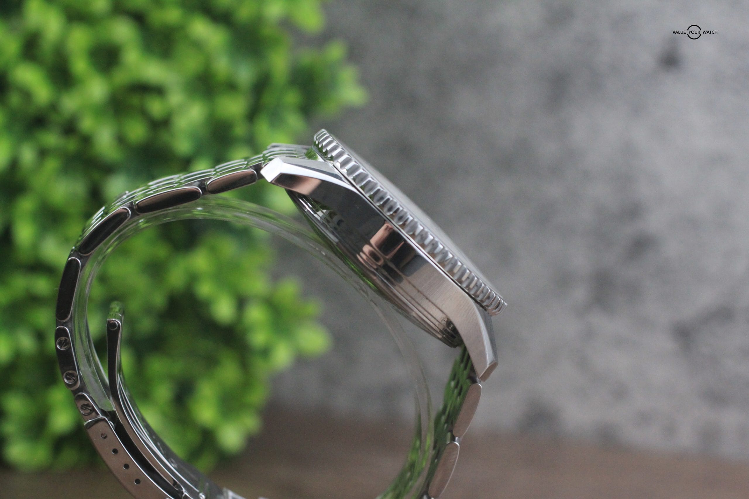 The case is in exceptional cosmetic condition, with only one small nick on the upper left lug. The bracelet shows reagular signs of light usage. The sapphire crystal is clear & free of scratches.