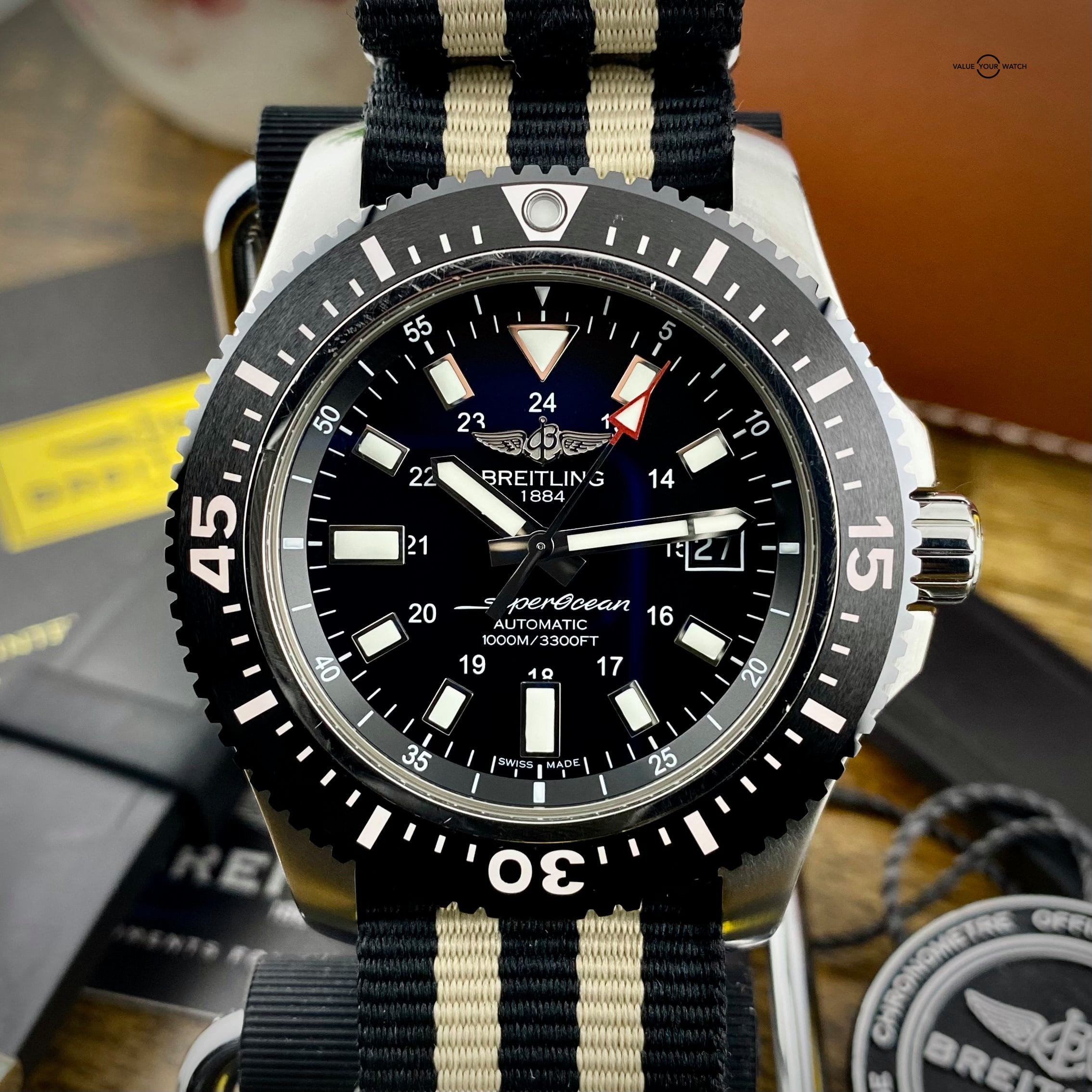 Set Contents – Triple boxed, OEM Rubber strap, booklets and papers, Mayers and Breitling Warranty card, and aftermarket NATO strap