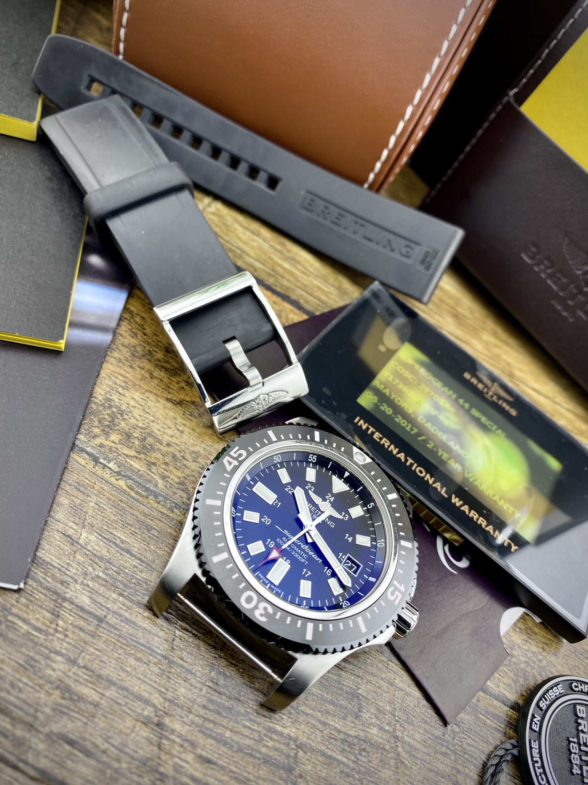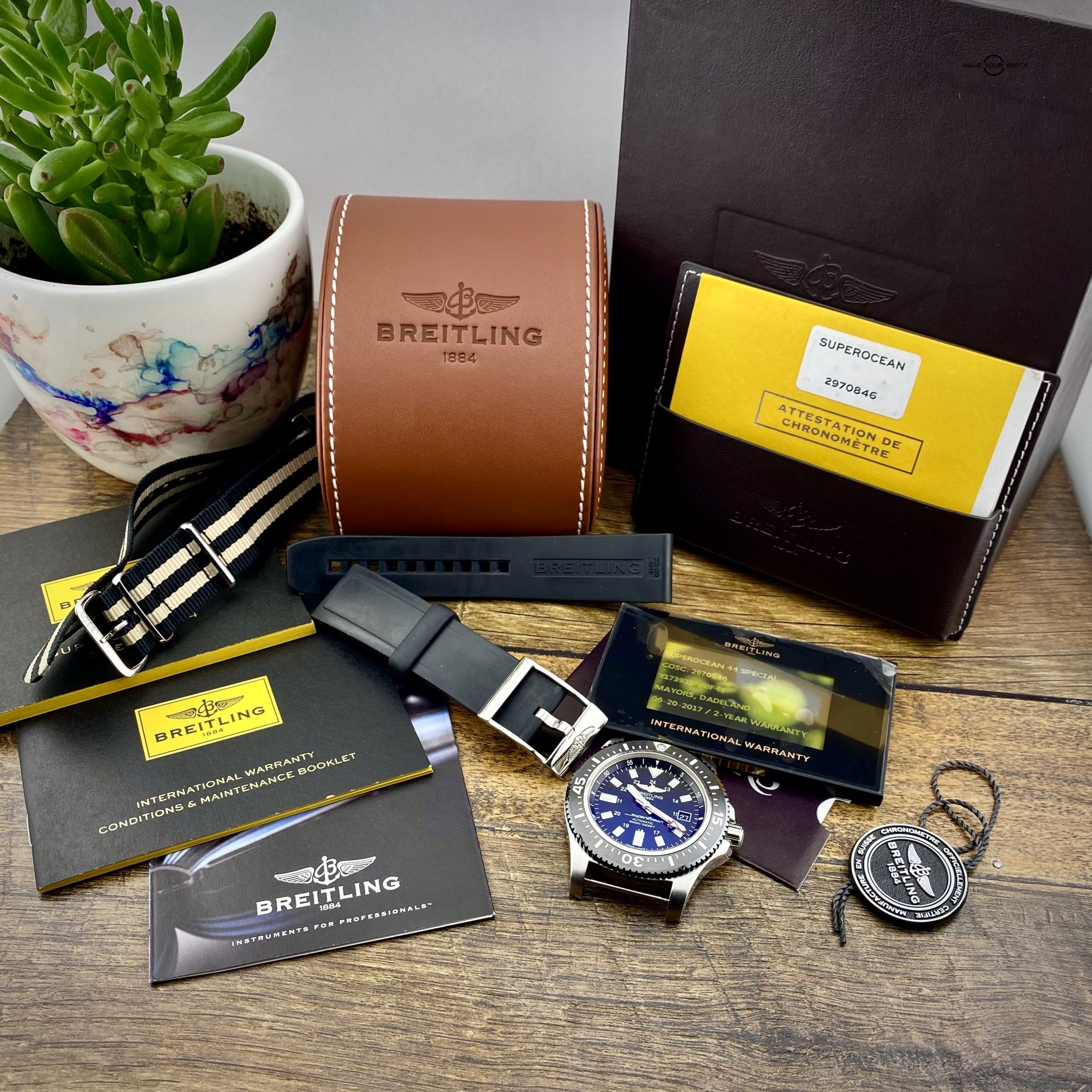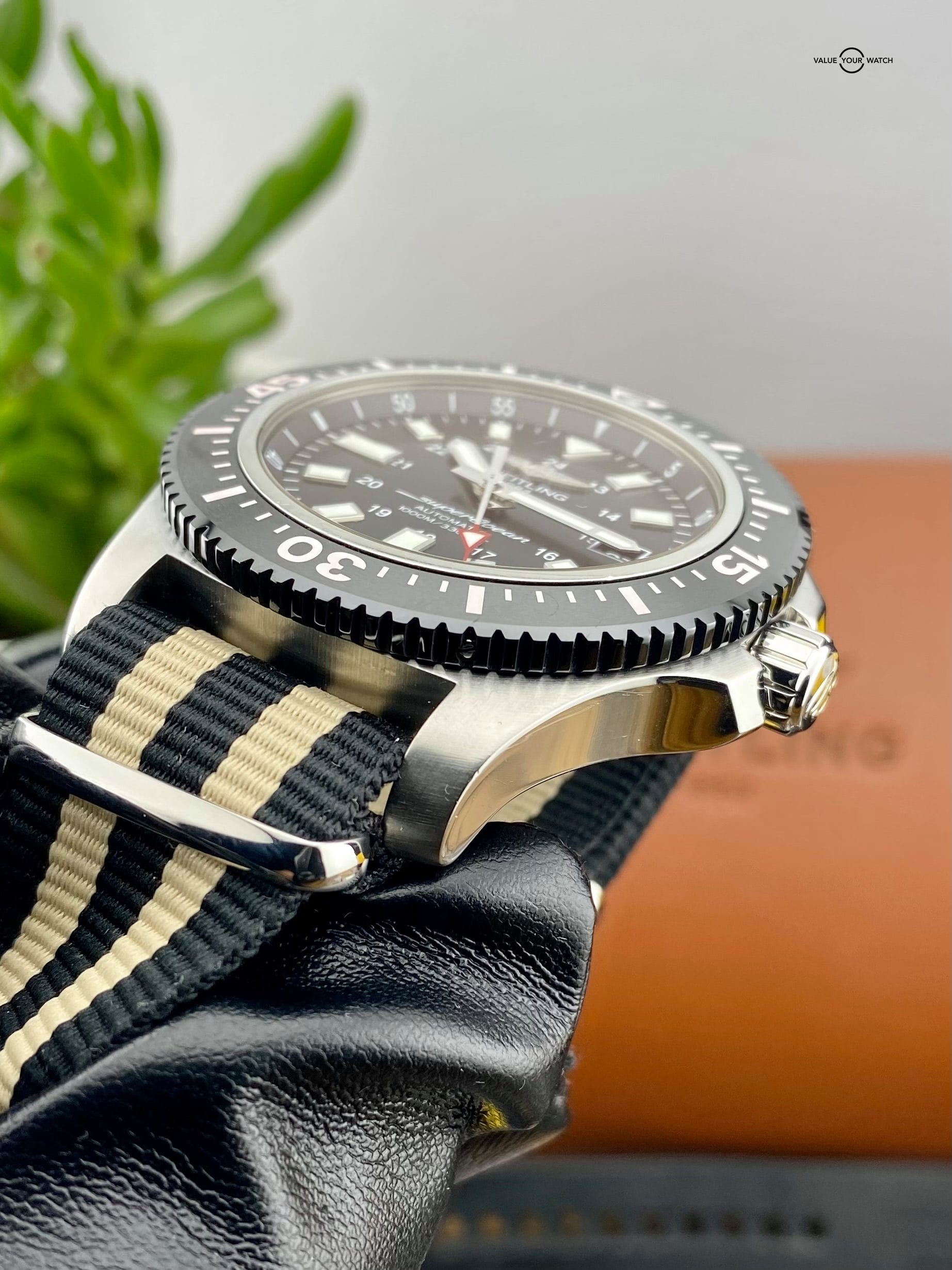 The Breitling Superocean Special Editon is tailored for discerning buyers who prioritize quality and value. This timepiece is crafted from high-quality materials, including a stainless steel case, vulcanized rubber strap, and a black dial with Arabic numerals and indices. The Special Edition comes with a black ceramic bezel and unique diver helmet on the case back. The Breitling Superocean Special Edition Automatic is an ideal gift for anyone who values precision, style, and sophistication.