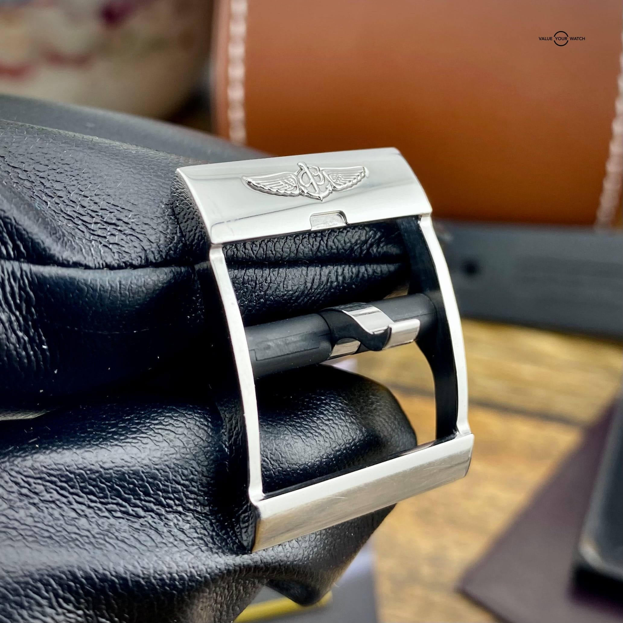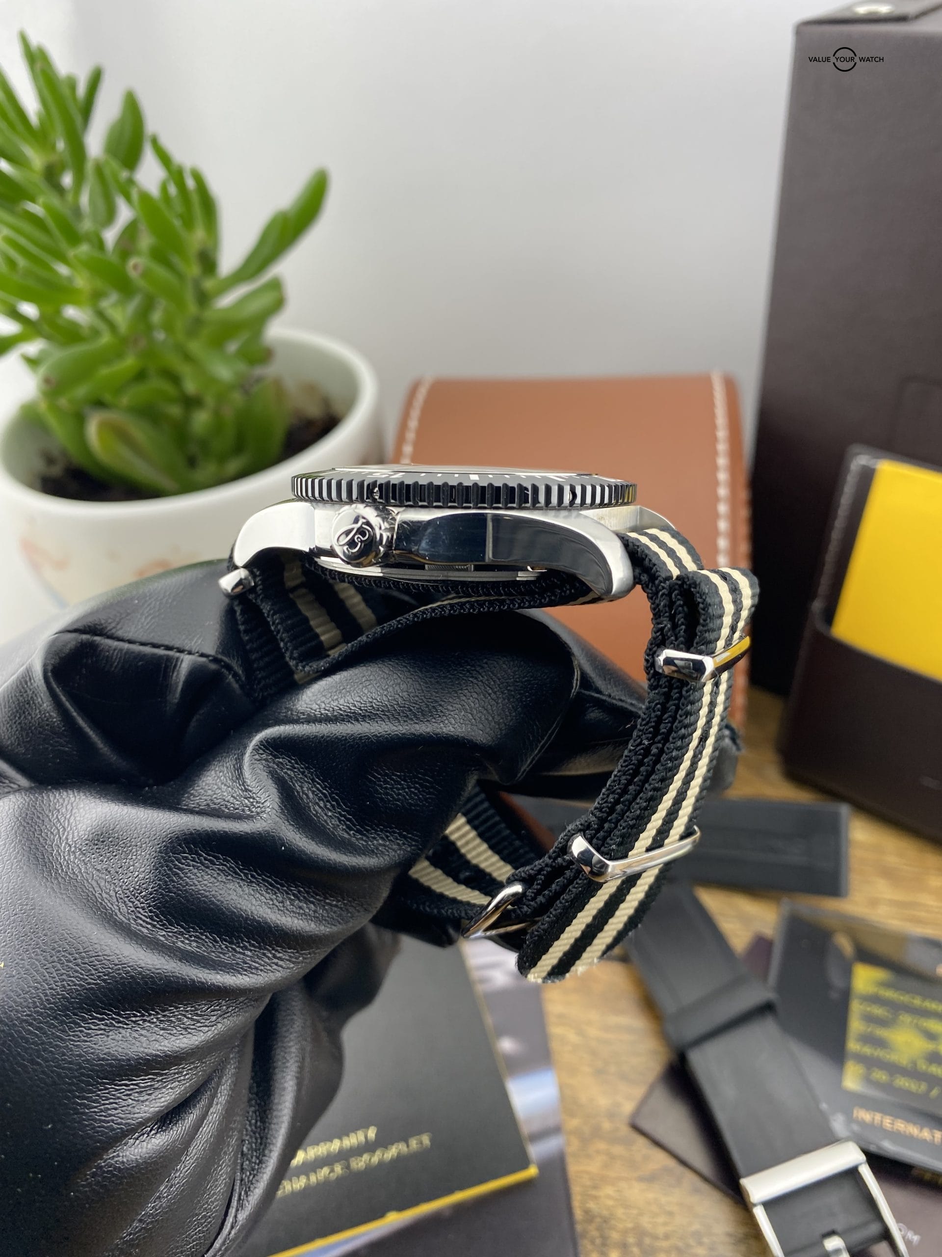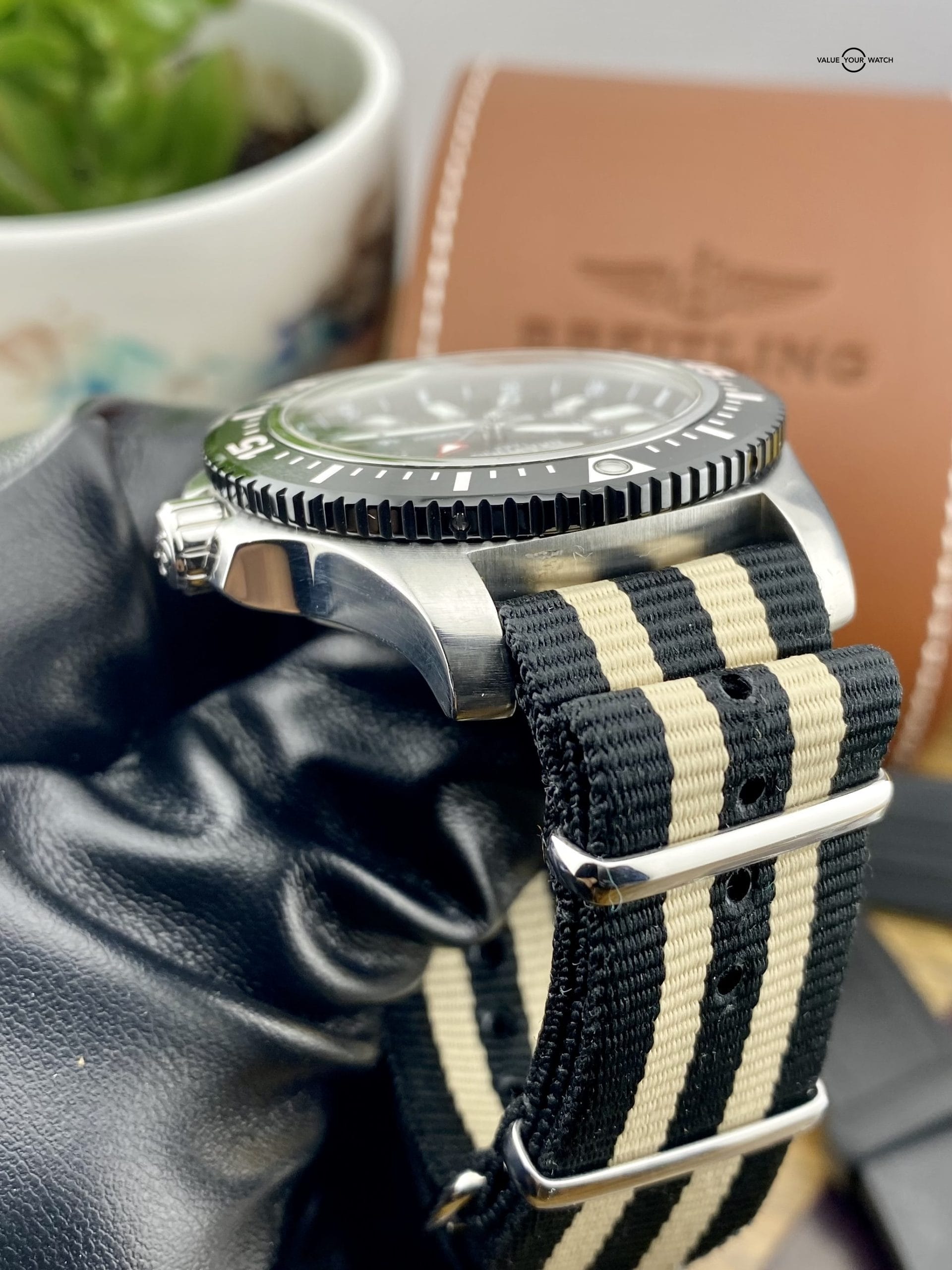 Set Contents – Triple boxed, OEM Rubber strap, booklets and papers, Mayers and Breitling Warranty card, and aftermarket NATO strap
