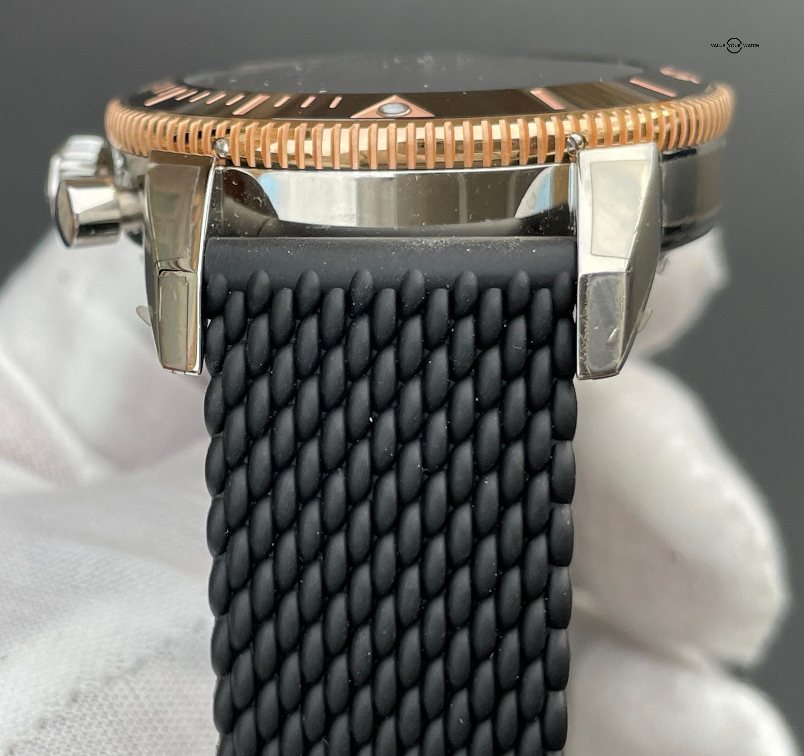 This beautiful piece is an amazing combination of stainless steel and 18K red gold with a black dial. Still new in the box, it still has protective plastic stickers on the back and the lugs of the watch. Comes with a box, card/booklets, hang tag and watch. The band has been sized for a 7” wrist by the AD but a new un-sized strap is included as well so you can have it custom sized as needed. Still has protective plastic on case, buckle has very light hairline wear from handling that will polish out if the owner wishes to do so.