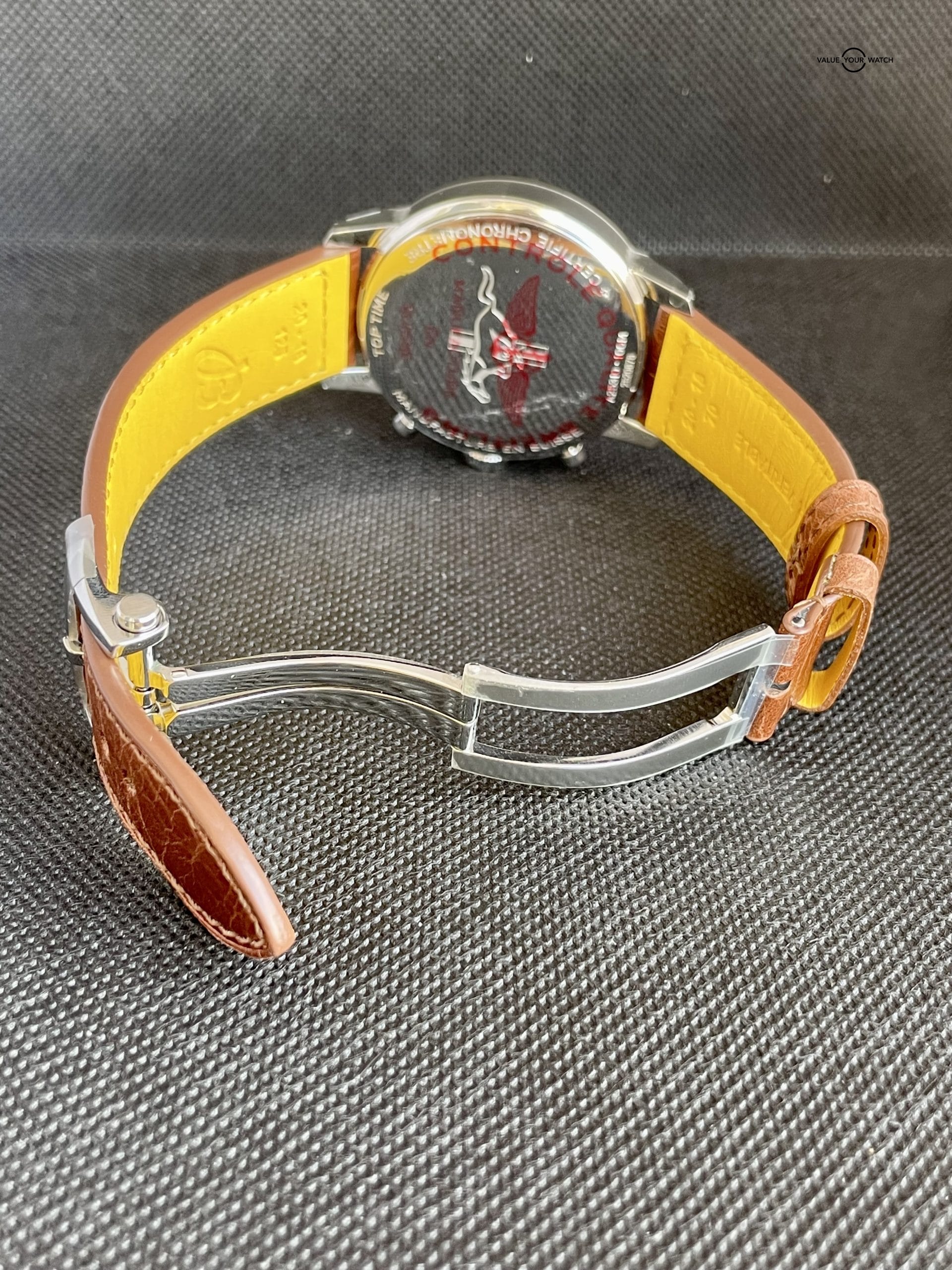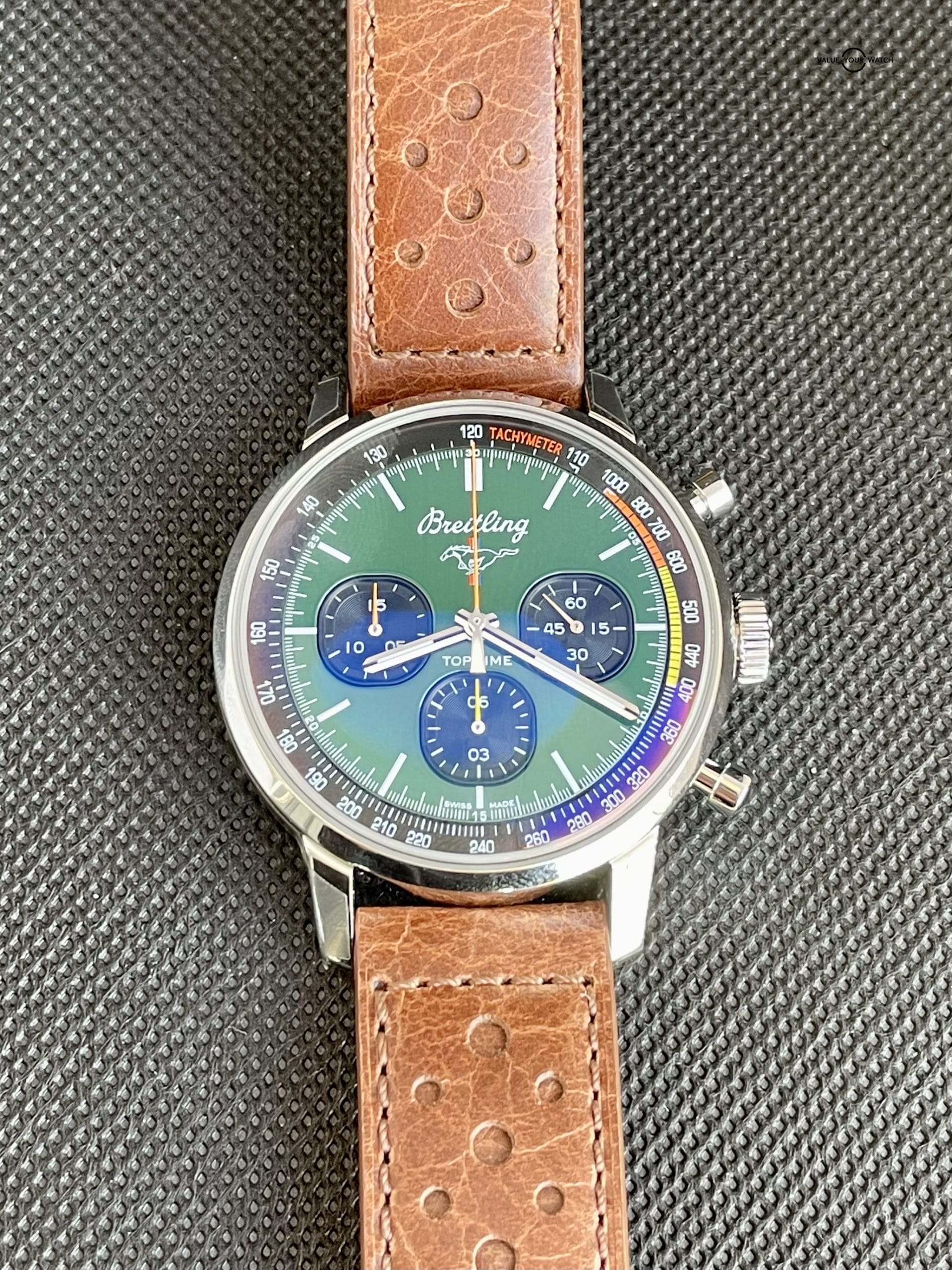 From the highly sought-after capsule collection is my Breitling Top Time Mustang model. This is BNIB never worn watch fully sticker, acquired from AD on 2/2023 with full warranty. Feature a 42mm case size with a chronometer-certified movement inside – the Breitling Caliber 25, a self-winding chronograph movement with a power reserve of about 42 hours. Original box and papers (complete set). This green dial watch is truly striking in person!