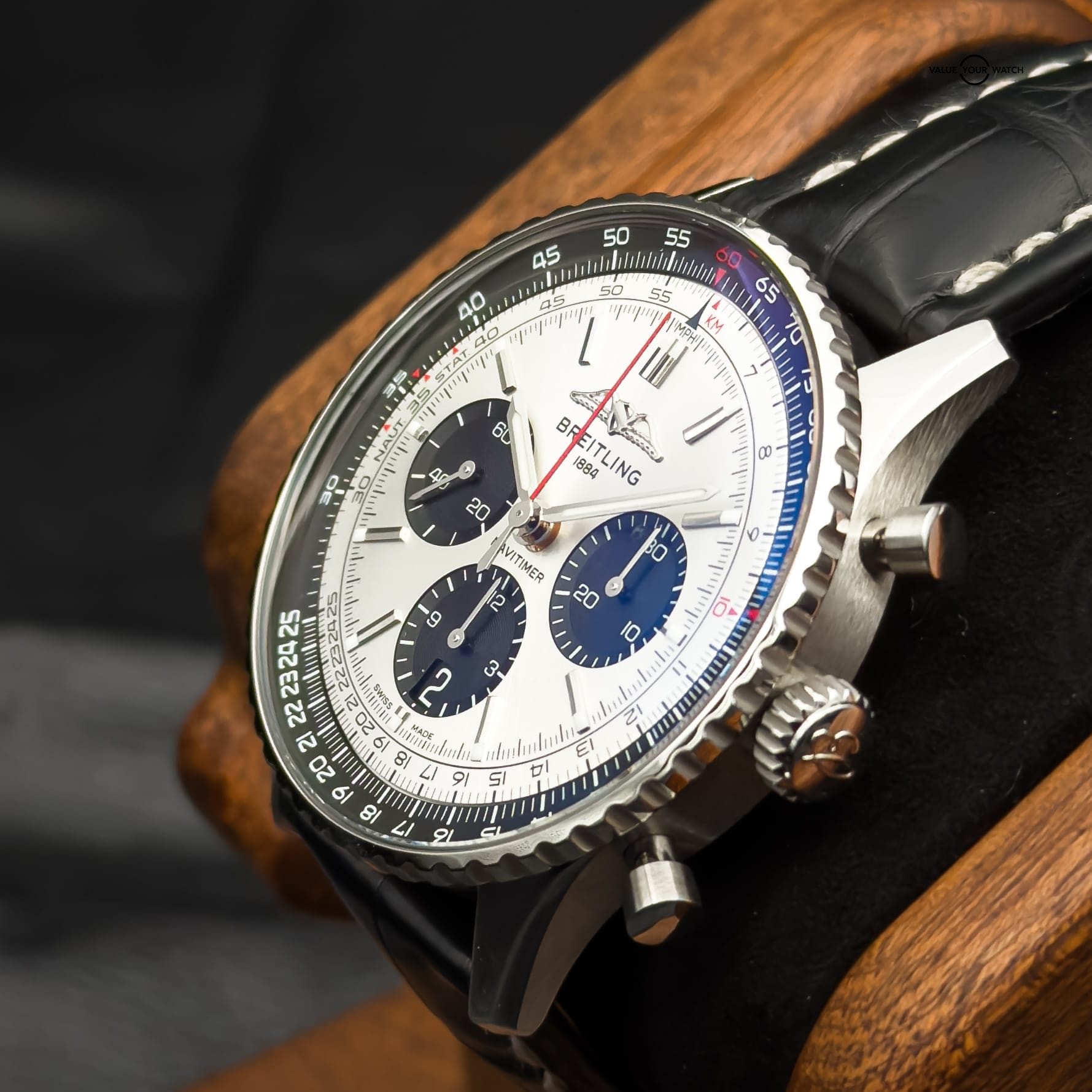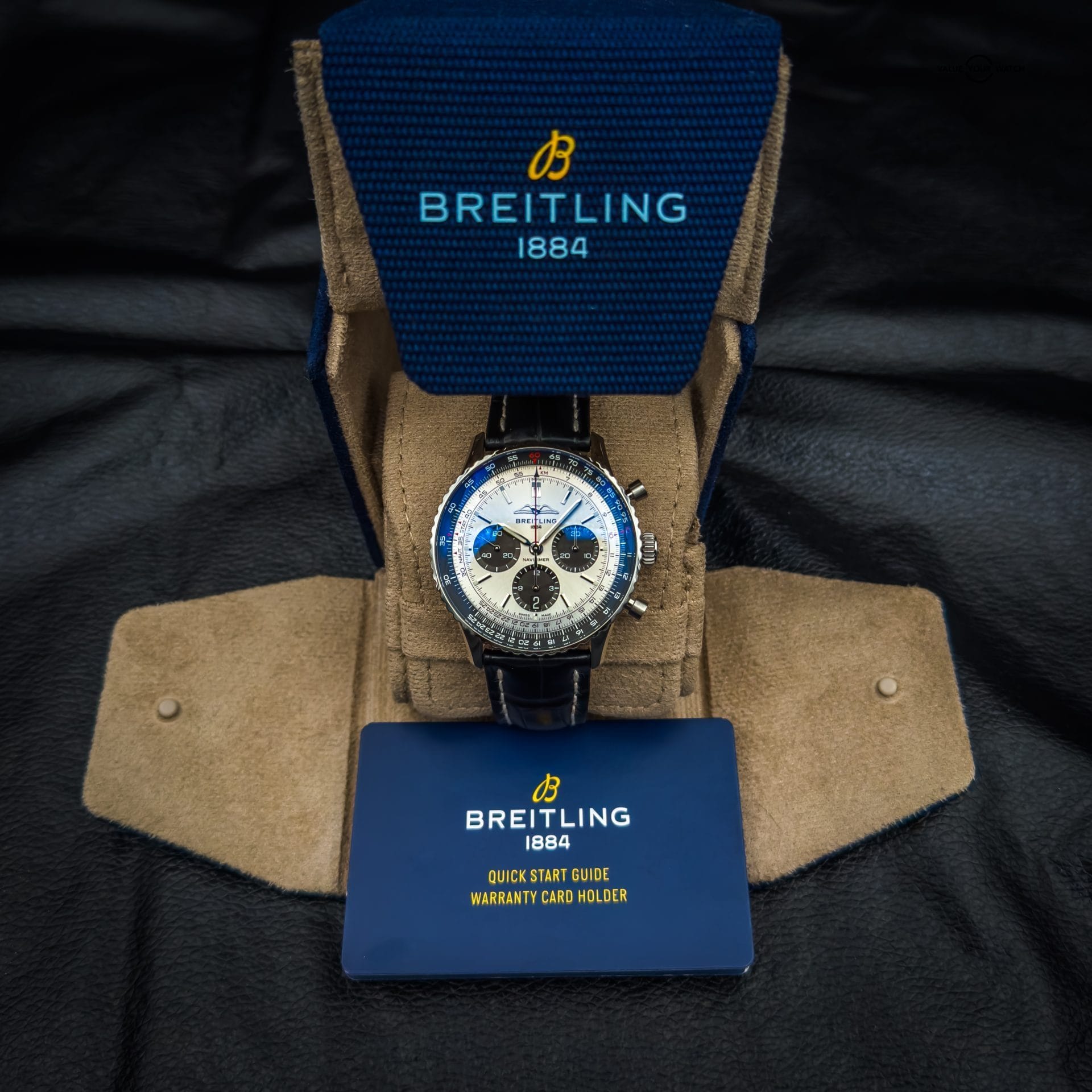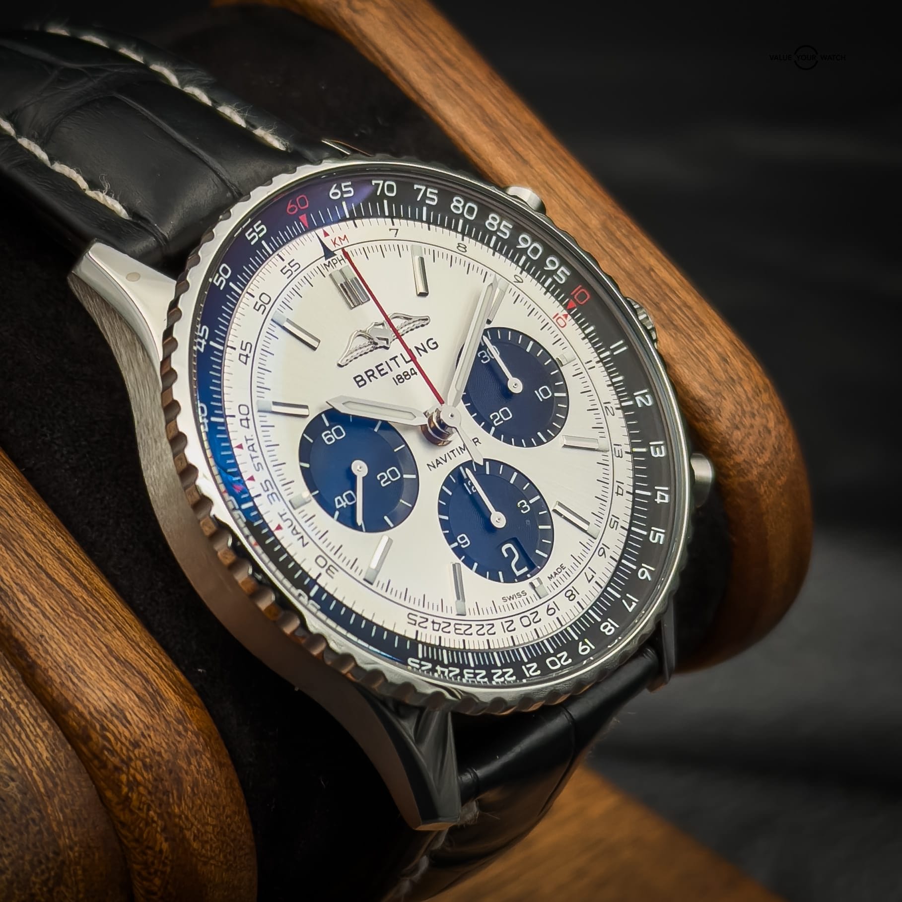 2022 Breitling Navitimer B01 43mm Silver Dial Chronograph Panda. Ref Number: AB0138241G1P1. Comes with leather strap. Very good condition. The Navitimer is Breitling’s flagship product and it shows. The silver dial and crystal gleam in the light. Own this and one up your friend with the Tudor Black Bay.
