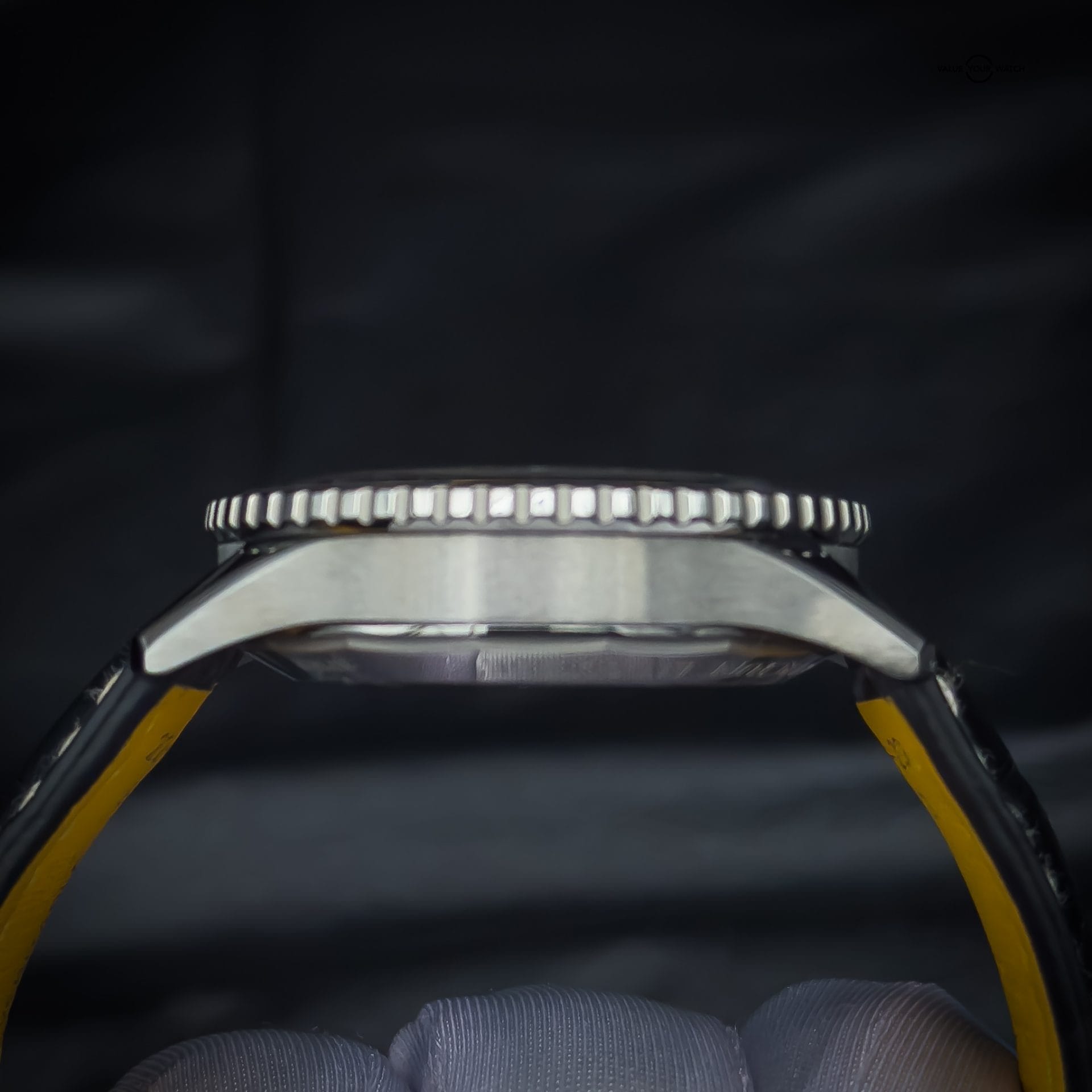 Watch is in very good condition, with one fine hairline scratch on the bezel, and a bit of fine wear on the clasp as well. Please see photos for close up details. Please note that the close up photos magnify watch imperfections and make them look worse than with the naked eye.