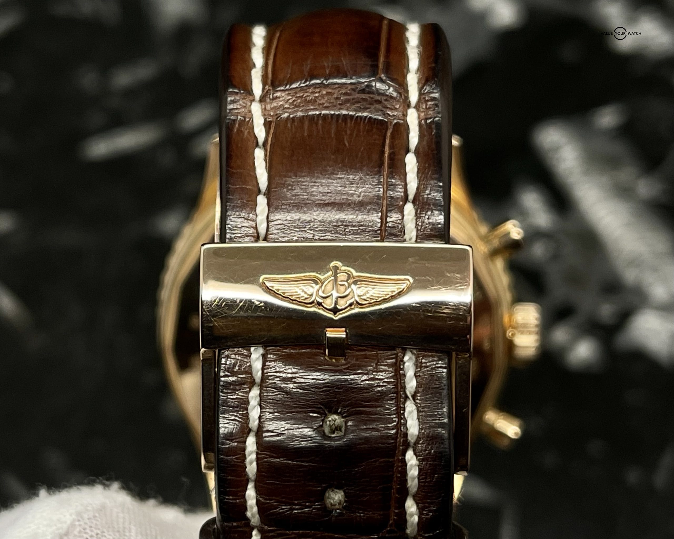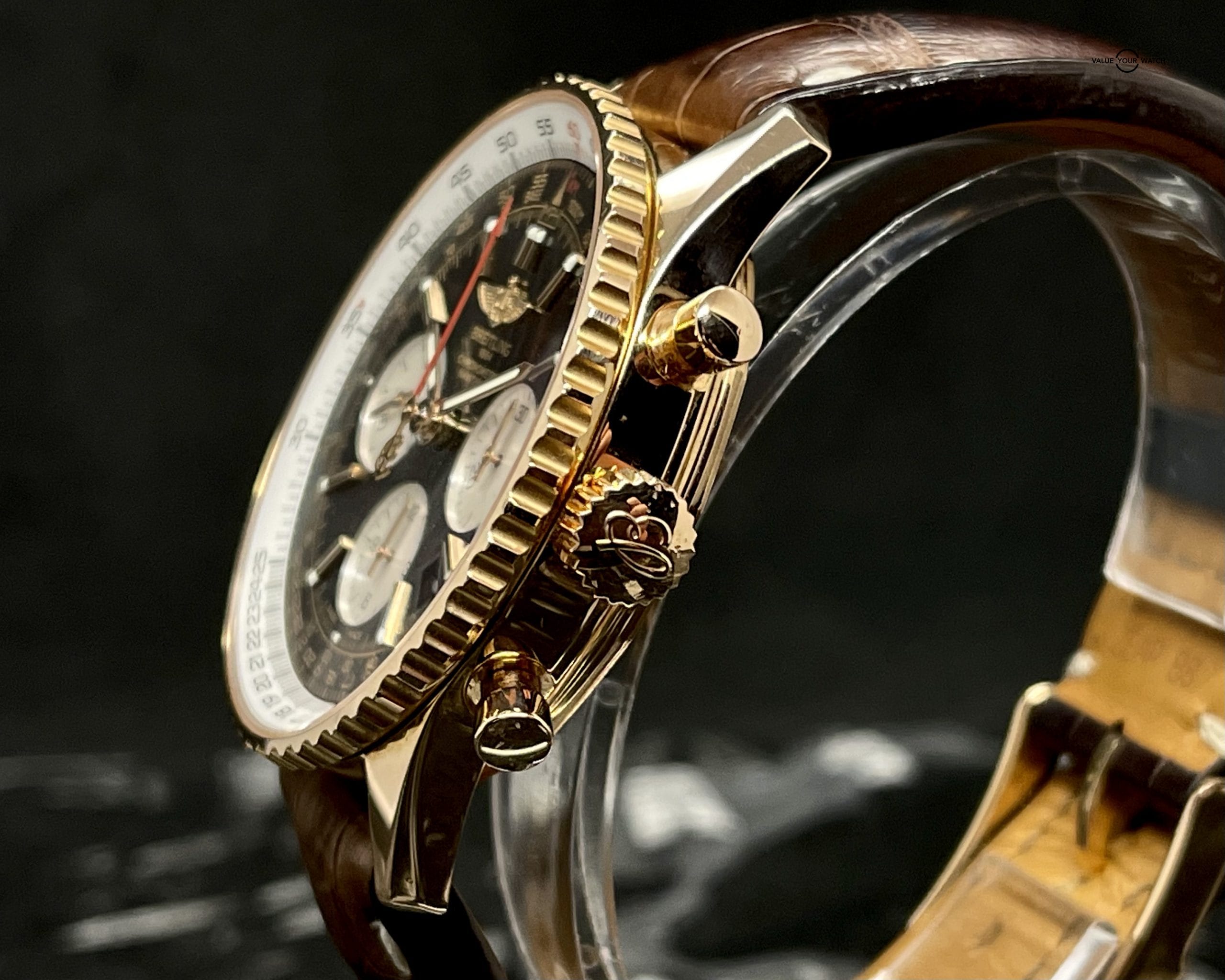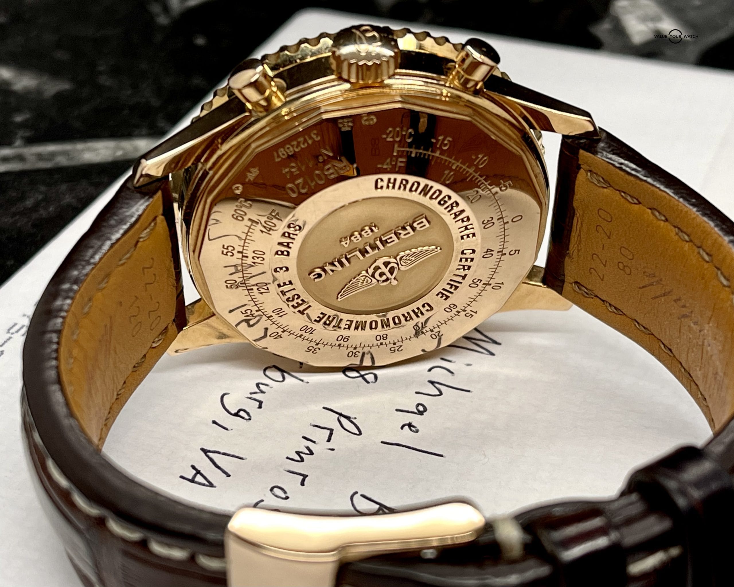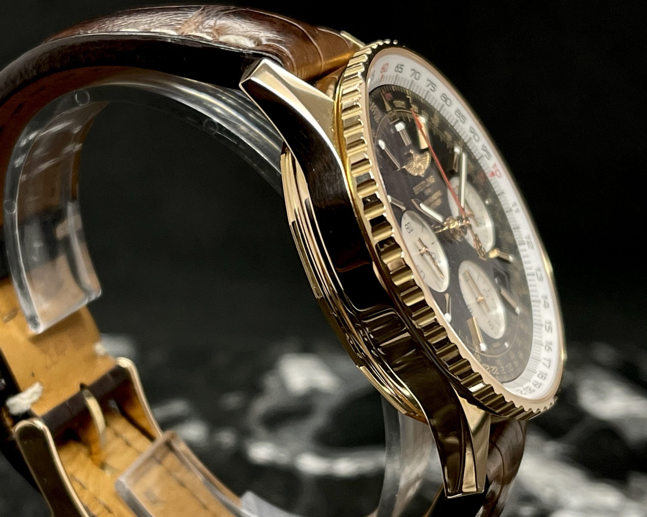 This striking sold rose gold Navitimer beautifully combines class and incredible utility. With a chronograph, slide rule calculator, tachometer, date, and Celsius to Fahrenheit conversion table on the back, this makes for one hell of a tool watch! At 43 millimeters it maintains a presence while still fitting nicely under a shirt cuff.